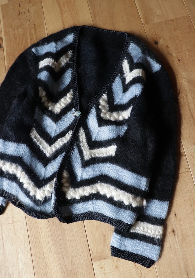 70s ITALY vintage cardigan 表記サイズ: 表記なし color: black x blue 実寸 着丈: 53cm 肩幅: 46cm 身幅: 52cm 袖丈: 55cm *採寸は平置きで採寸しております。 素材: 表記なしですがおそらくモヘア Condition:使用感はあるが目立ったダメージや汚れが見られないものになります。 トルソーサイズ 9号 肩幅 約37㎝ バスト 約81㎝ ウエスト約59㎝ ヒップ 85㎝ ・採寸の若干の誤差はご了承ください。 ・used,vintage商品となりますので、細かなダメージや汚れがある場合がございます。 ・写真につきましてできるだけ実物の色に近いものの掲載を心がけておりますが、屋内での撮影のため、またお使いのモニターによっては誤差が生じてしまいます。 ・古着商品の特性上の汚れやシミ等による返品、返金、交換は出来かねますので、ご理解の上ご購入下さいますよう何卒よろしくお願いいたします。