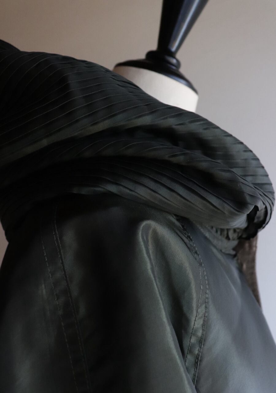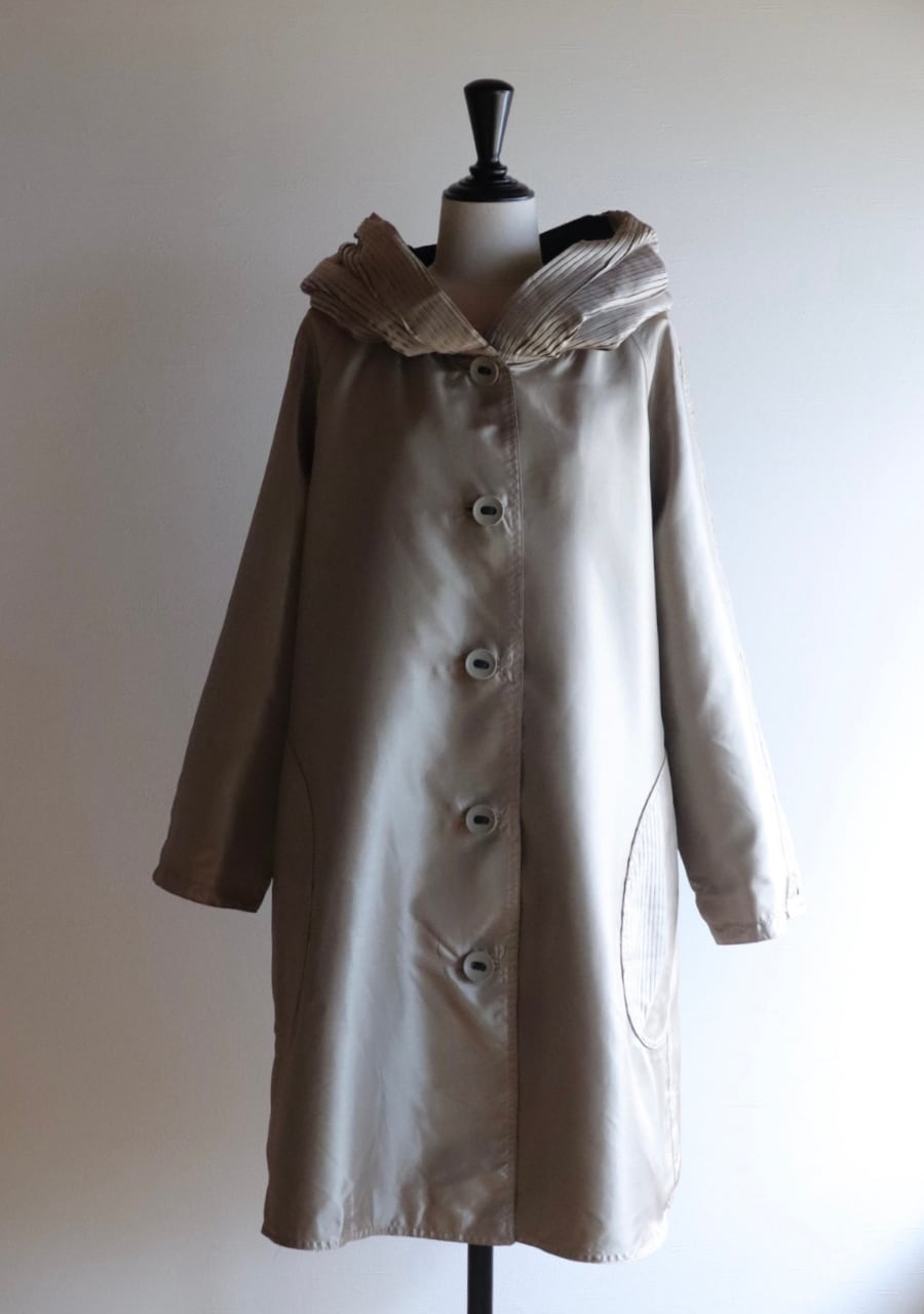ポリエステル素材で軽いコート。特徴的なのはボリュームある細かいプリーツフード。ゆるく開いた首元のアクセントとなり大き目のボタンも可愛い。うれしいのがリバーシブルでゴールドとカーキーブラックで楽しめるところ。ボタンも色味に合わせていて両方にポケットも付いている。袖も2段階でボタンで閉めることができ風よけはもちろんその日の気分でシルエットの違いを楽しむのも良い。Aラインでデザイン性も高く大変おすすめの一着です。