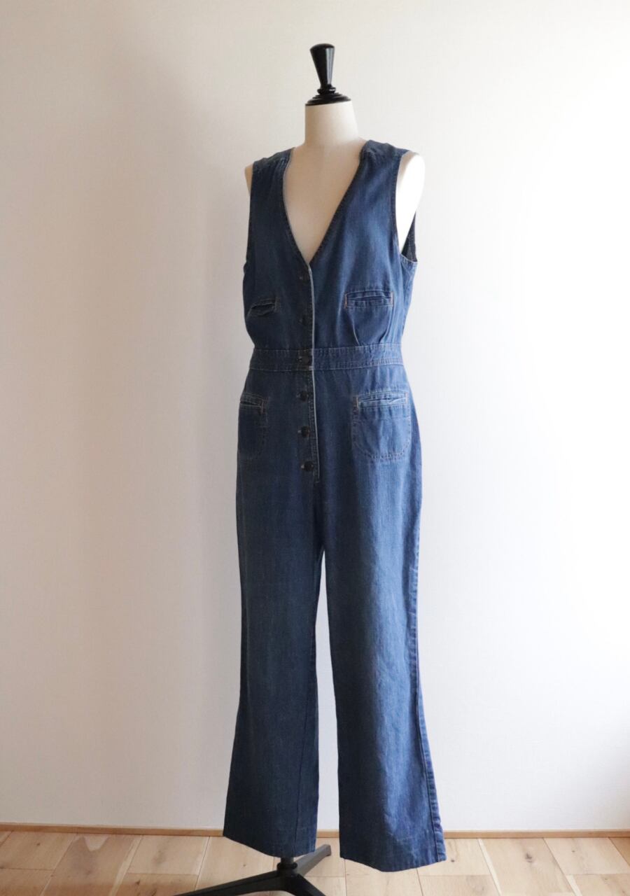 柔らかくやや薄手の生地感でデザインが良しなオールインワン。胸元から股にかけてのボタンや前両サイドの絶妙に可愛いポケット、肩の切り替えや上半身Vの開き具合が良い感じ。ズボン丈にお直しがありますが、良い丈感です。なかなかないデザインで個性的に着用していただけます。