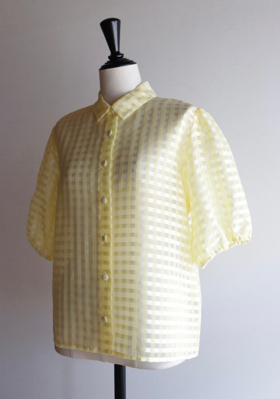 透け感ある生地。黄色のチェックが可愛く光沢のある艶も良い。袖は長めゴムでギャザーが入りパフスリーブに。長すぎず短すぎずの丈感も良い。コーディネートのポイントとなるアイテム。
