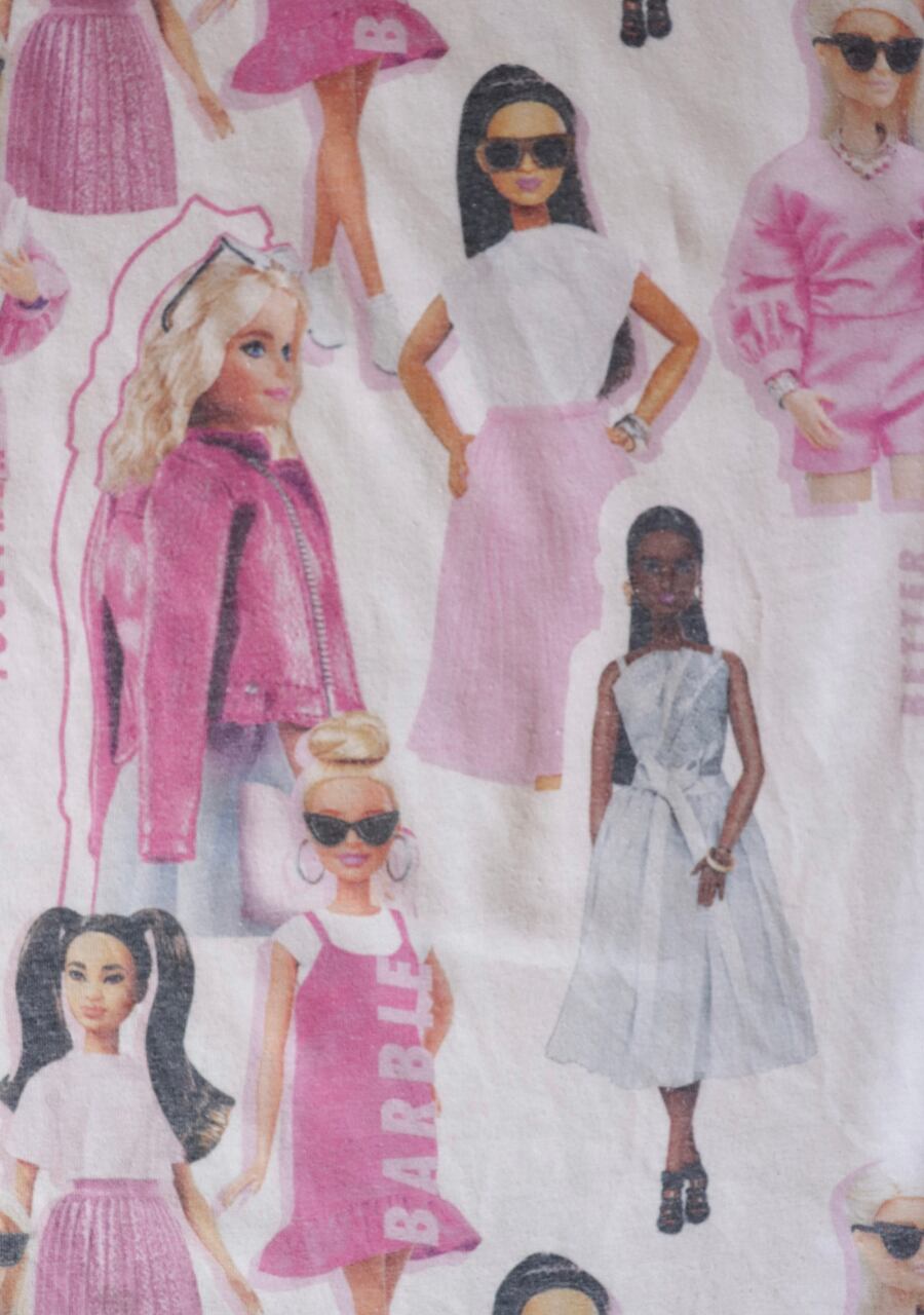 バービーが可愛いロングビックTシャツ。159㎝着用で丁度膝上の丈感。ピンクもラブリー。コーディネートのポイントに。やや伸縮性がある生地感で着心地も良い。肩幅が大きくとってあり落ちる感じで袖は肘上あたりで可愛いシルエットです。