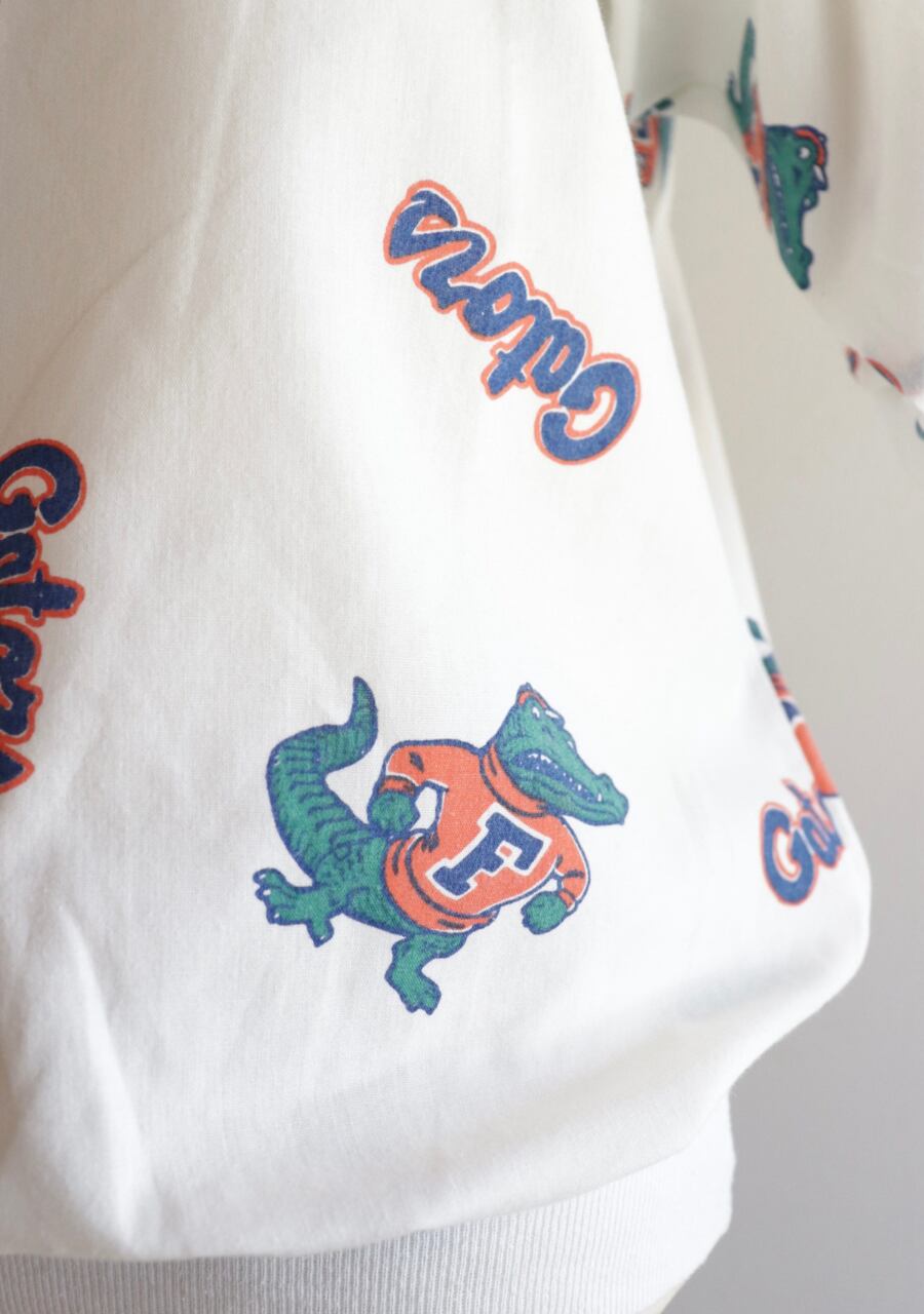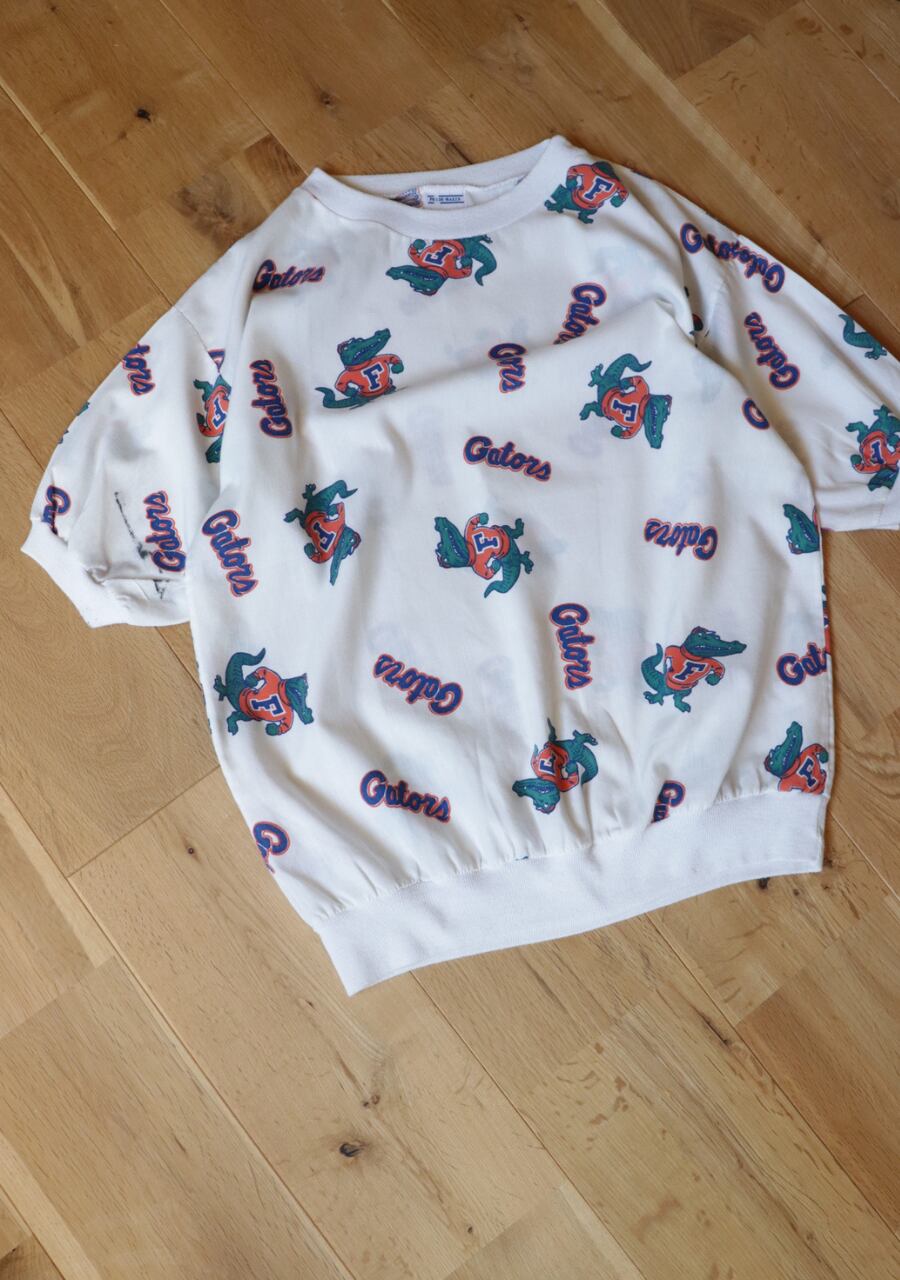 バスケットボールチームGATORSのキャラクターがプリントされた可愛いトップス。やや薄手のコットン素材の生地が爽やかでリブ使いも可愛い。159㎝着用で肘までかかる袖もシルエットがとにかく可愛い!首元の開き具合も丁度良く着心地最高です。古着の雰囲気もあり大変おすすめ!