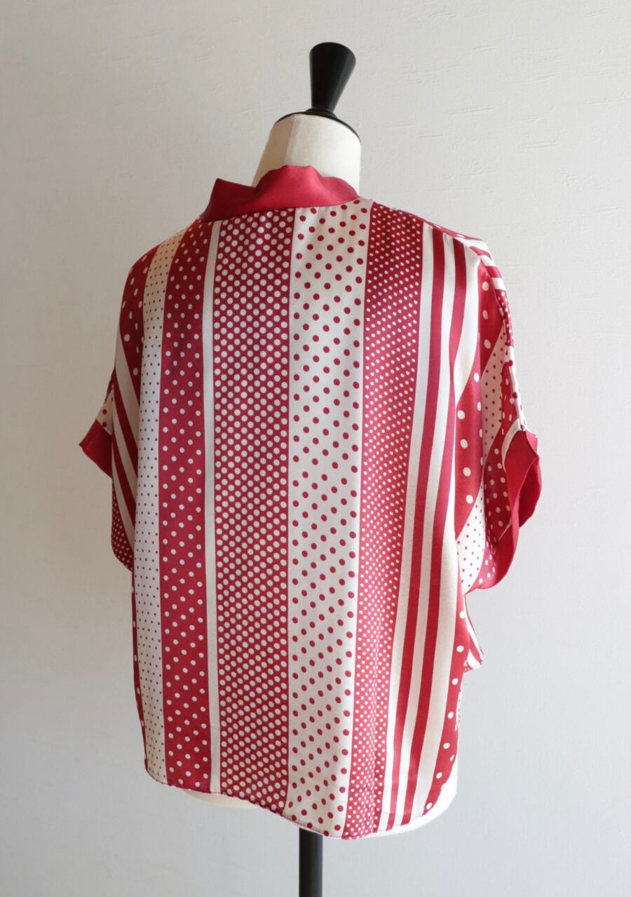 艶のあるサテン地にドット柄とストライプ柄が可愛い。ボタンを開けて着用してもショートな丈感がバランスよく袖のシルエットも良い。パジャマの様な感じも今っぽく色物でスタイリングのポイントに。