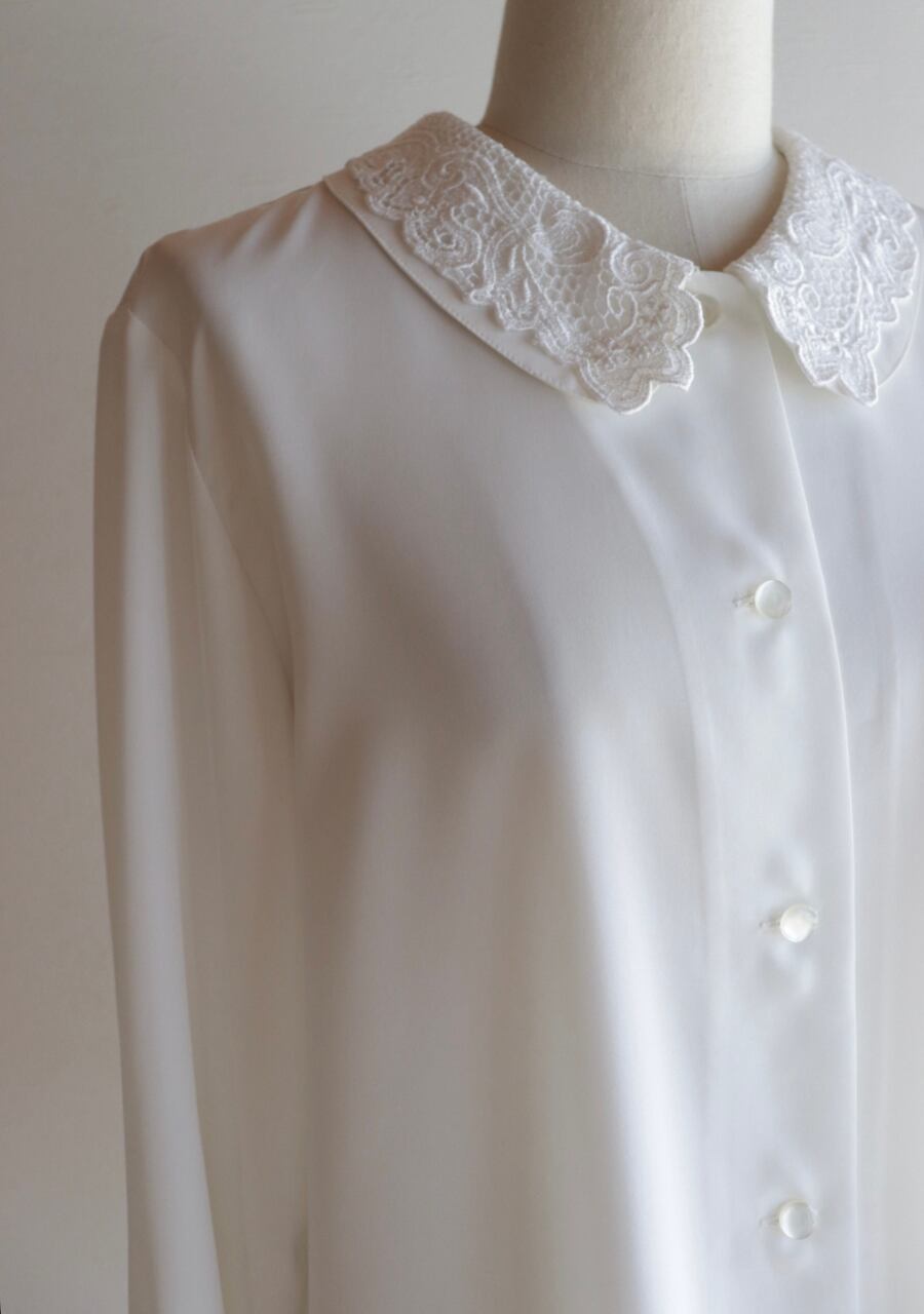 襟元のレースがポイント。一枚でもレイヤードで襟を出してととても活躍できる1着です。