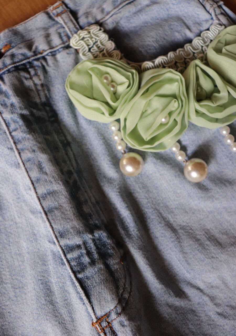 フロントポケット部分にあるリボンとパールのコサージュがアクセントで可愛いデニム。右側部分のリボンの先端に若干のほつれがみられるがしっかりと付着していて取り扱いが繊細過ぎず着用できるのもポイント。淡いデニムのカラーとシルエットサイズともに可愛く使いやすい形。大変珍しくオススメのデニムです。