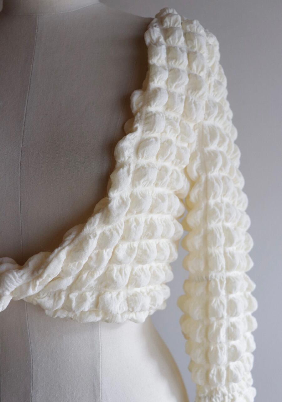 伸縮性のある生地。凸凹した表面が可愛くインナーに柄物色物など入れていただいても可愛い。ニット合わせも可愛いです。ショート丈でコーディネートのポイントにオススメ。