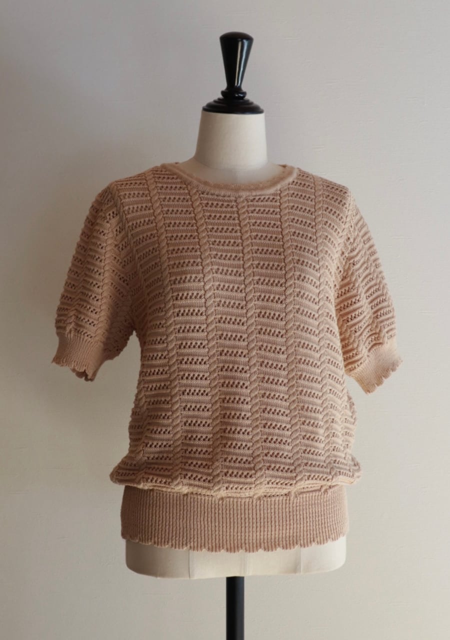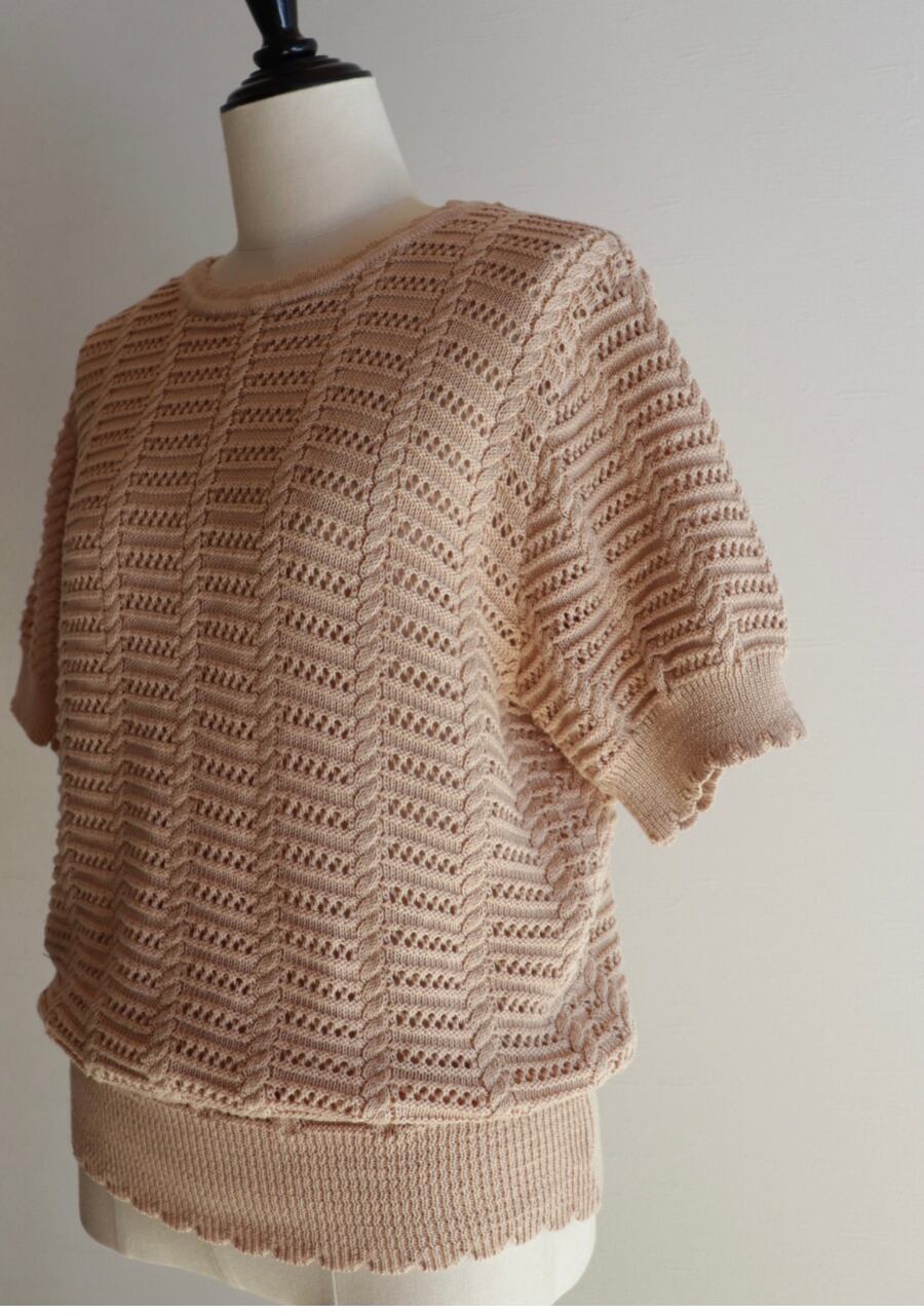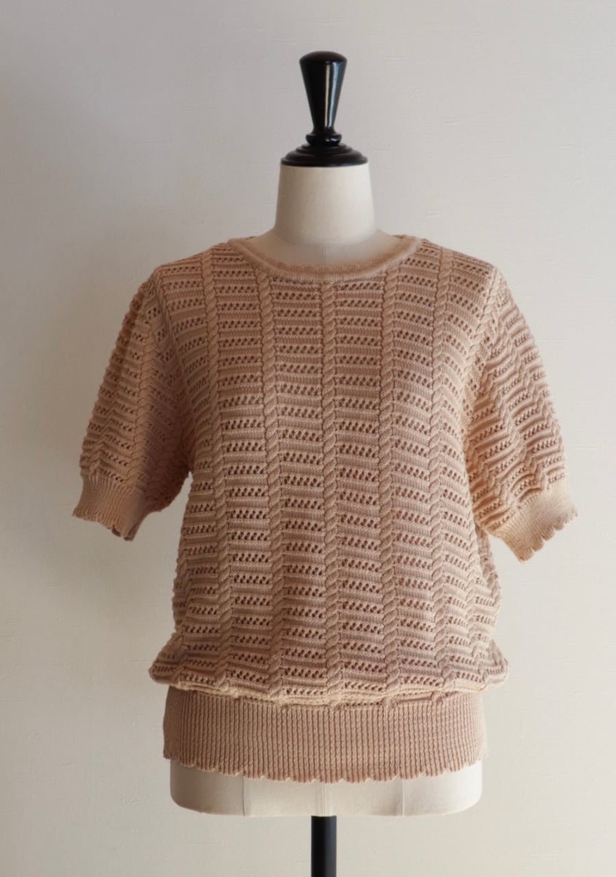 透かし編みのような編地が軽やかで、通気性も良く、春から秋にかけて長く着られる一枚です。コットン素材ならではの優しい肌触りで、伸縮性もありデイリーに取り入れやすいのもポイント。ほどよくゆとりのあるシルエットで、一枚着としてもレイヤードにも使いやすいデザインです。