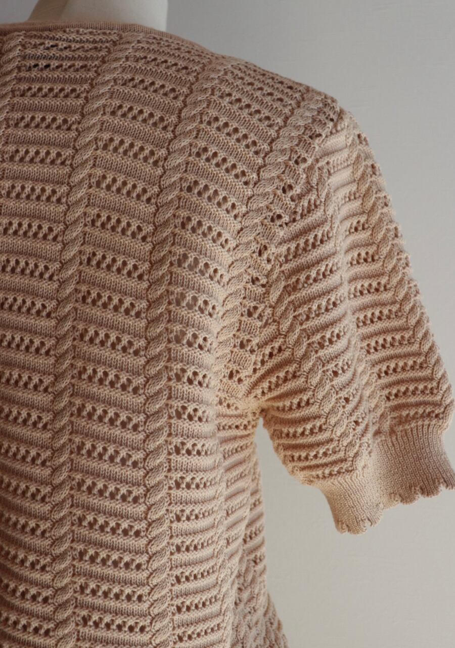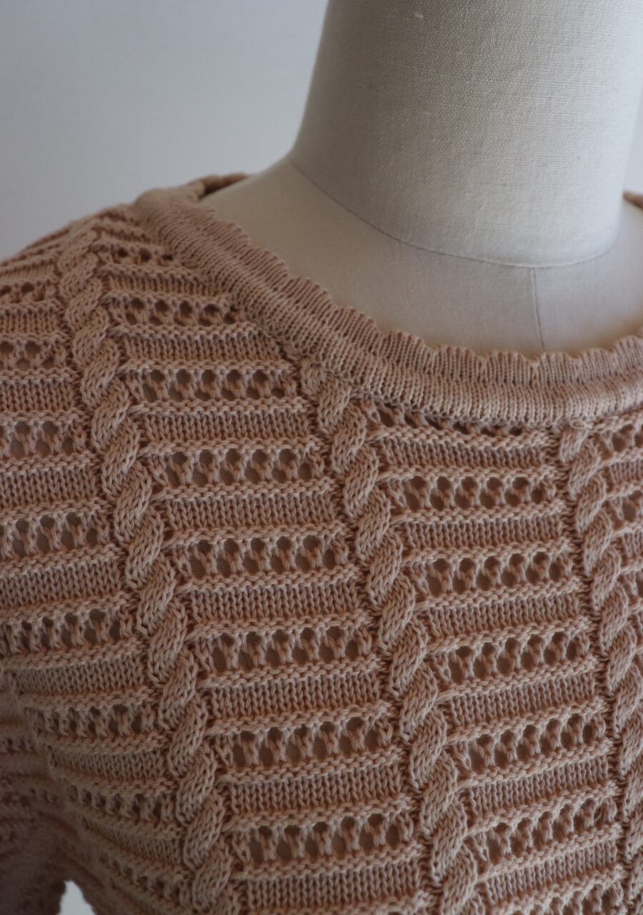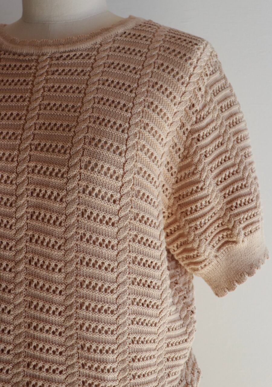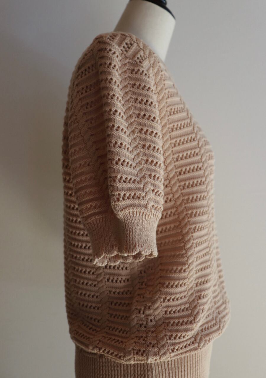 透かし編みのような編地が軽やかで、通気性も良く、春から秋にかけて長く着られる一枚です。コットン素材ならではの優しい肌触りで、伸縮性もありデイリーに取り入れやすいのもポイント。ほどよくゆとりのあるシルエットで、一枚着としてもレイヤードにも使いやすいデザインです。