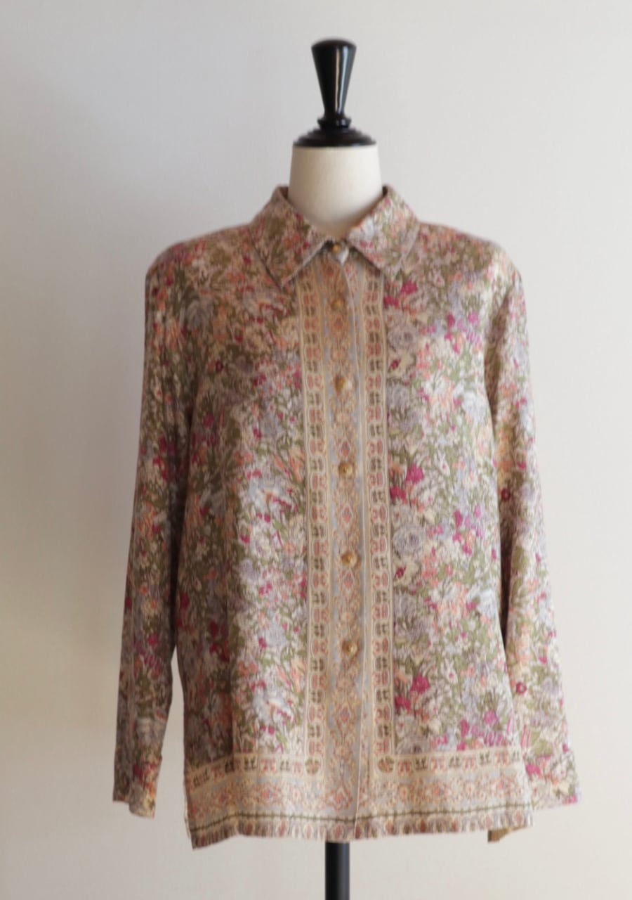 薄手の透け感の無い生地。繊細なフローラルパターンが美しい長袖シャツ。
