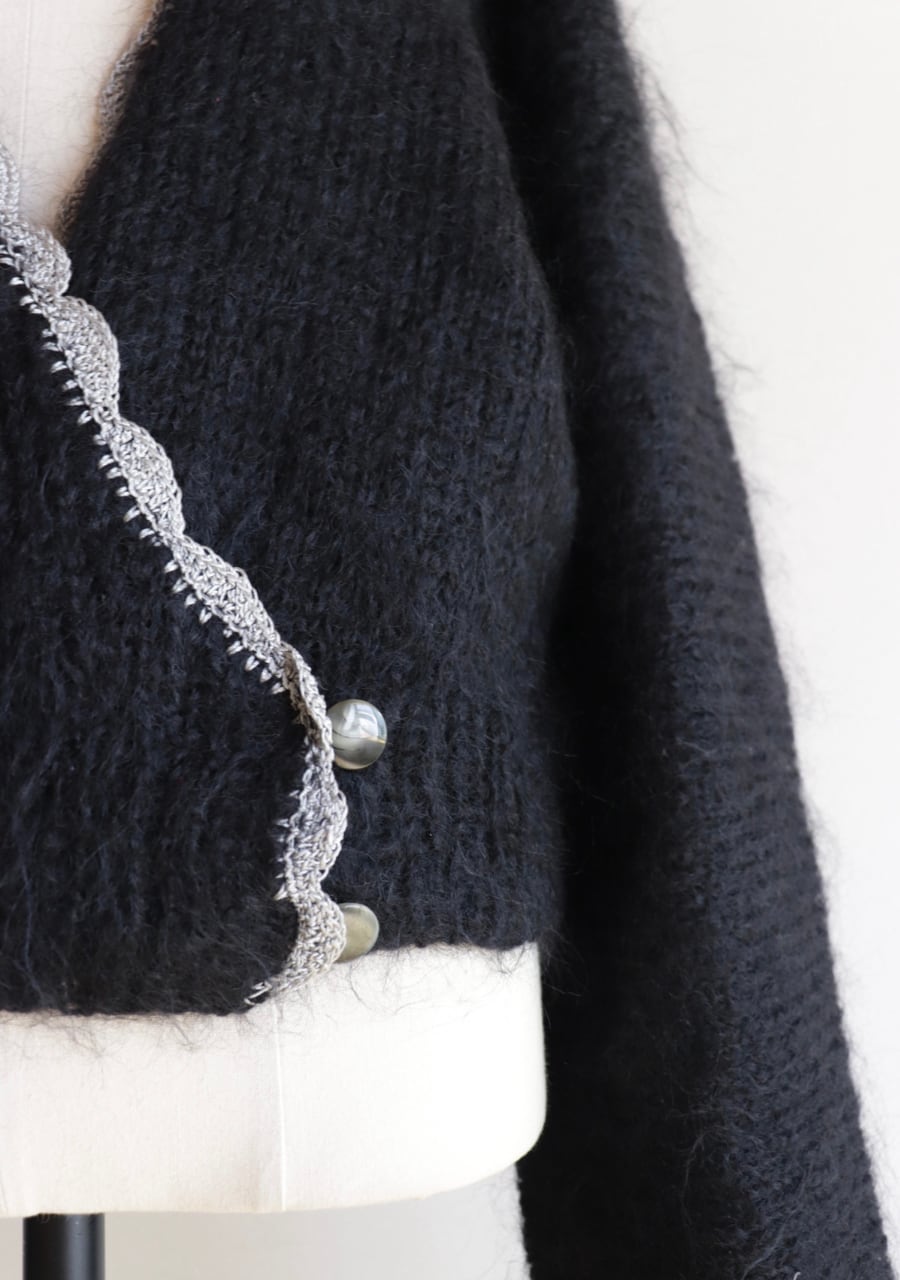 ふわっと軽いモヘア素材にシルバーの刺繍入りカーディガン。長めの袖が可愛くて左胸の花の刺繍がポイントでカシュクールなデザインの縁取りにも同じくシルバーの刺繍。インパクトがありながら大人っぽさと可愛らしさを兼ね備えているカーディガン。モノトーンの中に刺繍ポイントが華やかで、コーデの主役にもぴったりです。