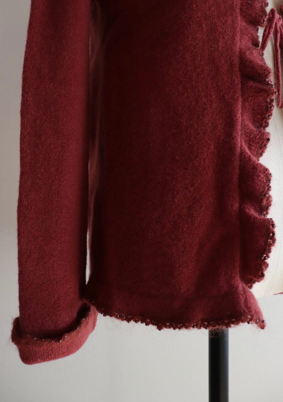 大きく開いた胸元とフリルに小さなビーズを施され女性らしく可愛らしいニットカーディガン。モヘア混の素材で柔らかく肌触り良く暖かい。伸縮性があり体にフィットするシルエット。コーディネートのポイント使いに◎