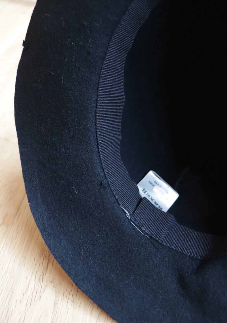 シンプルでありながら美しいシルエットととブラックの上品さを兼ね備えているハット。やはりシックでありエレガント。やや薄手の厚みだけどシルエットを崩さない。硬くなり過ぎない柔らかさが雰囲気をより一層高めて着用すれば一気におしゃれなスタイリングに。指図感も良く大変おすすめのアイテムです。