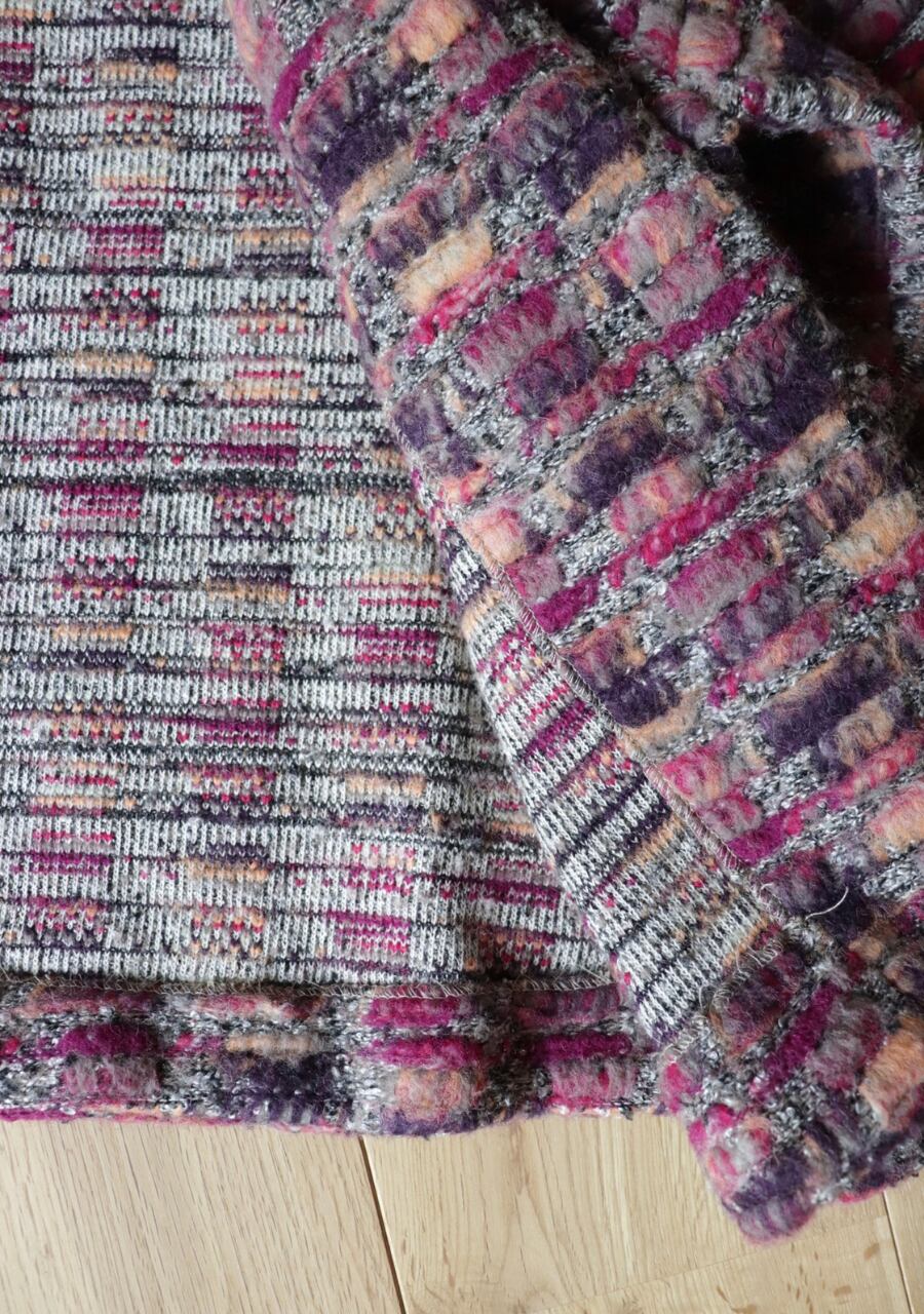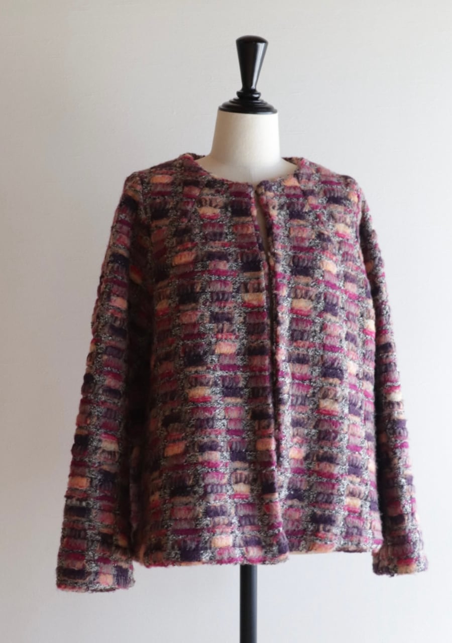 白と黒のまばらなニットにピンクやパープルやグレージュオレンジなどのウール素材が可愛いブロックで表情を作っているジャケット。柔らかくやや薄手のとても使いやすいジャケットで女性らしいシルエット。温かみがあって個性がある。羽織るだけで華やかでコーディネートの