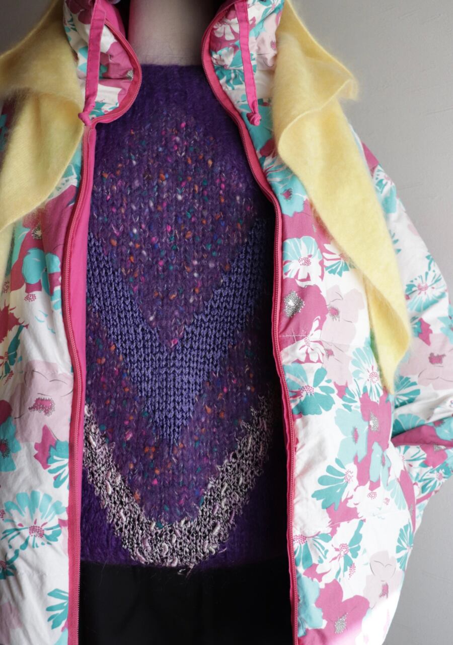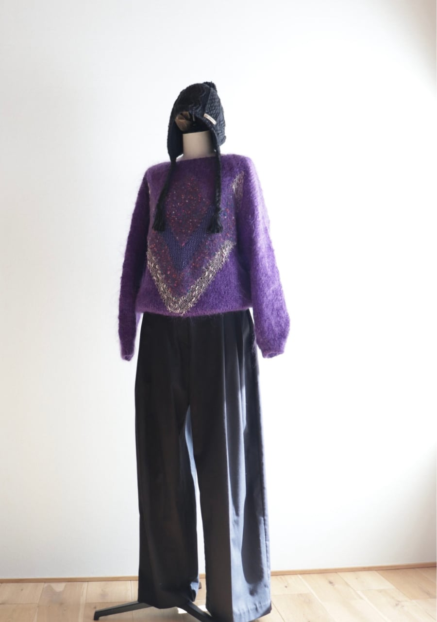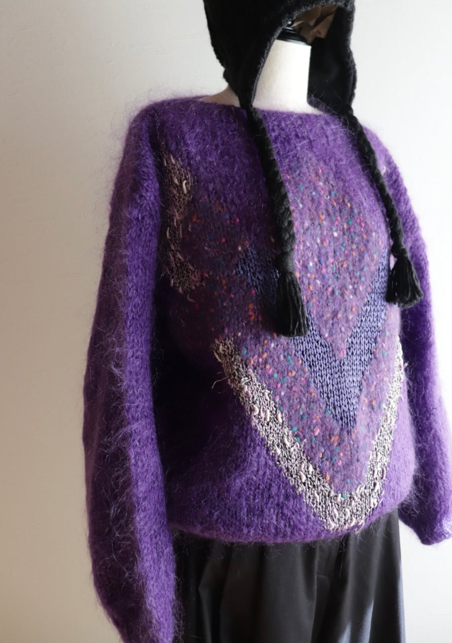 鮮やかなパープルカラーの毛並みが上品なモヘアニット。柔らかく暖かい。状態も大変良くシルエットがモヘアの毛並みと相まって女性らしくかわいい。開きすぎないボートネックとフロントの素材を変えた編みのデザインも素敵。一枚で可愛い存在感溢れるニットです。