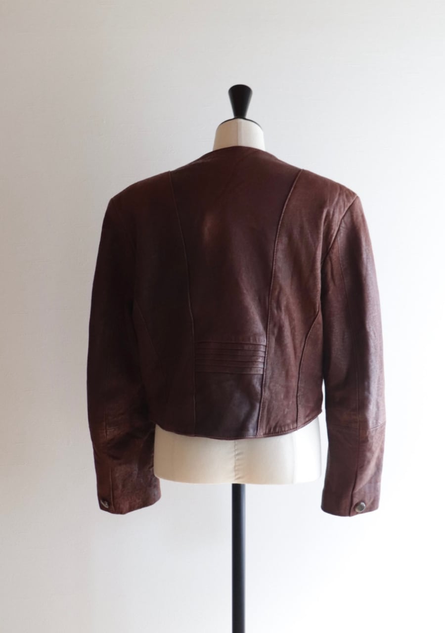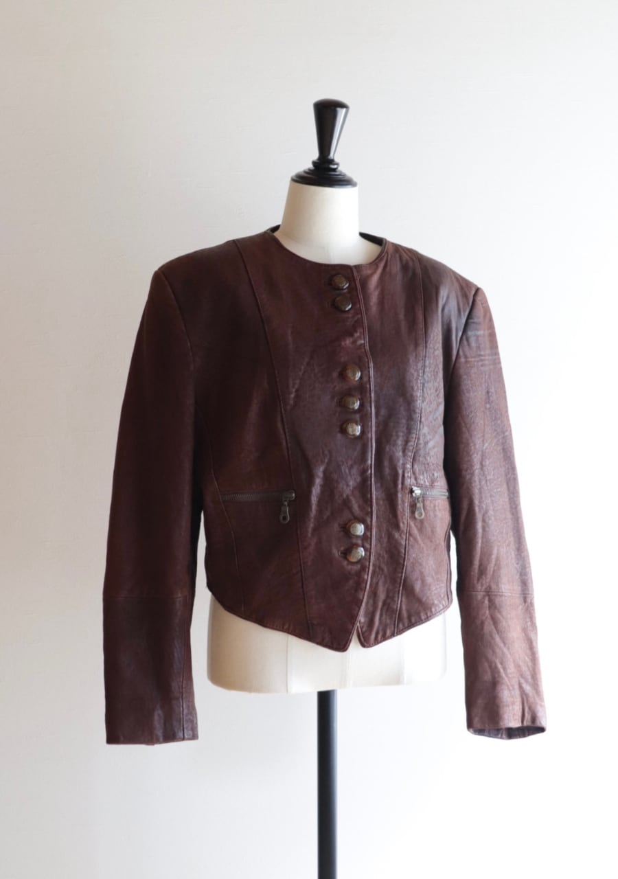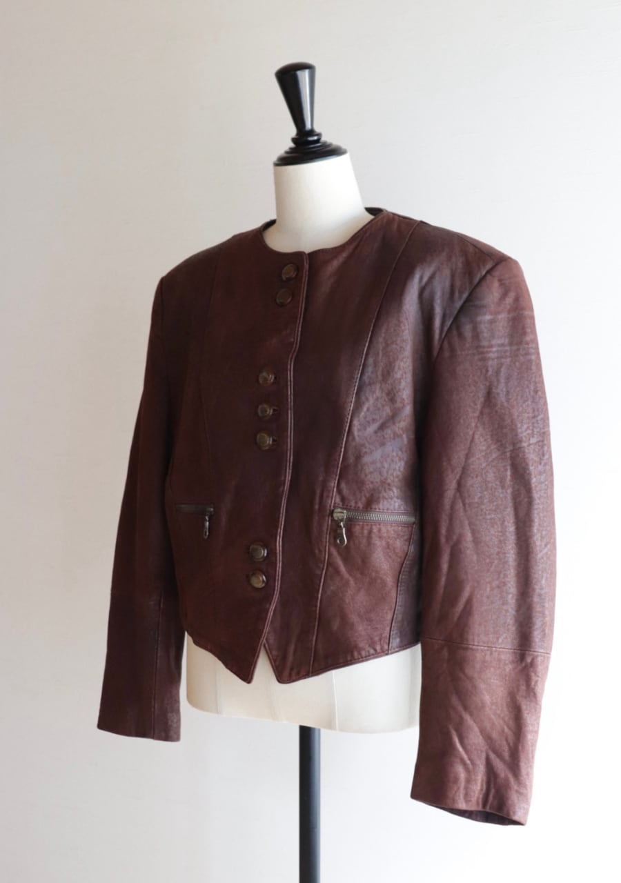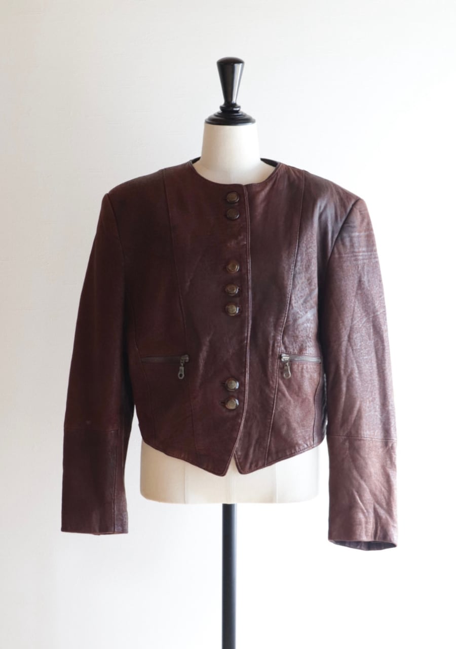 上品な艶と柔らかさのあるレザージャケット。ショート丈でノーカラーのデザインはとても女性らしく個性もあり素敵。赤味あるブラウン。質感が古着ならではの雰囲気がたまらなく良い。上質で雰囲気とトレンド感ある一着です。
