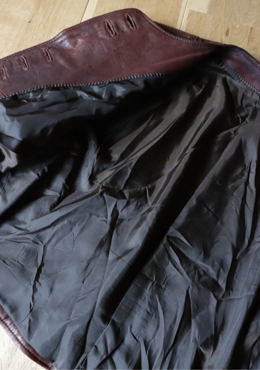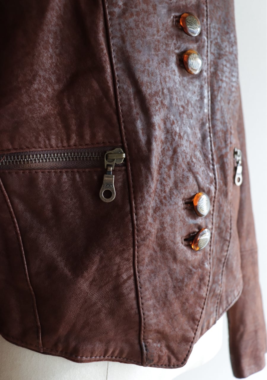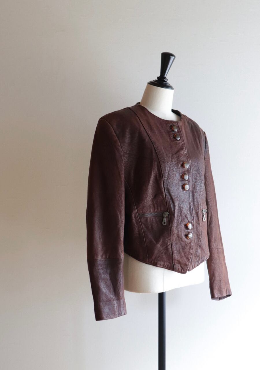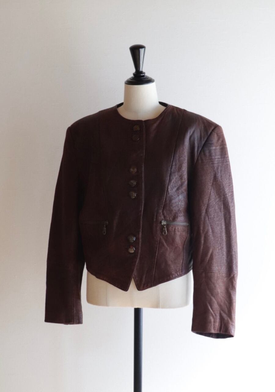 上品な艶と柔らかさのあるレザージャケット。ショート丈でノーカラーのデザインはとても女性らしく個性もあり素敵。赤味あるブラウン。質感が古着ならではの雰囲気がたまらなく良い。上質で雰囲気とトレンド感ある一着です。
