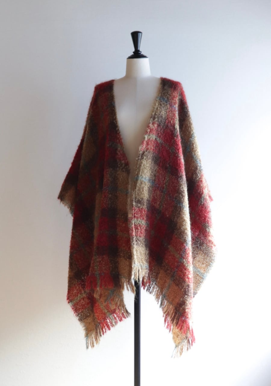 暖かみあるモヘア混の羽織れる大判ストール。色味が良くて大き目のチェック柄が存在感があって可愛い。肌触りがよく柔らかく軽くて暖かい。ループのある糸で編まれたストールで表面の立体感があり優しい印象。気軽に羽織れるタイプで大活躍できるアイテムです。