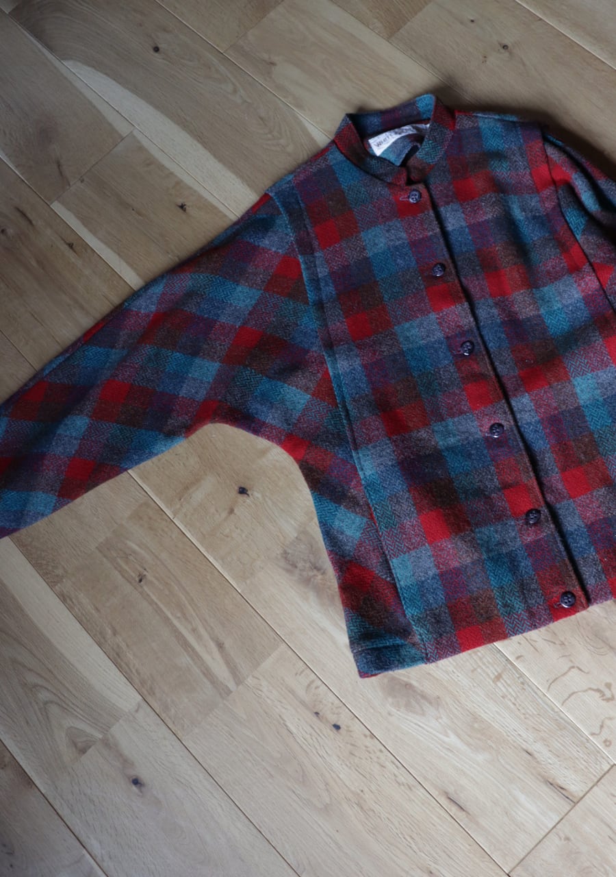 やや中厚の生地感でウールの温かみある生地。裏地はなし。赤とブラウン、グリーンのチェックが可愛くてドルマンスリーブの肩のラインからひだを入れたてのラインをすっきりと見せたデザインが特徴。腕周りは大き目で袖にはゴムが入っていてフロントサイドにポケット付きのジャケットのようにも着用していただけます。ウールの生地とデザインで素材の良さを実感できる冬のコーディネートをお楽しみいただけます。