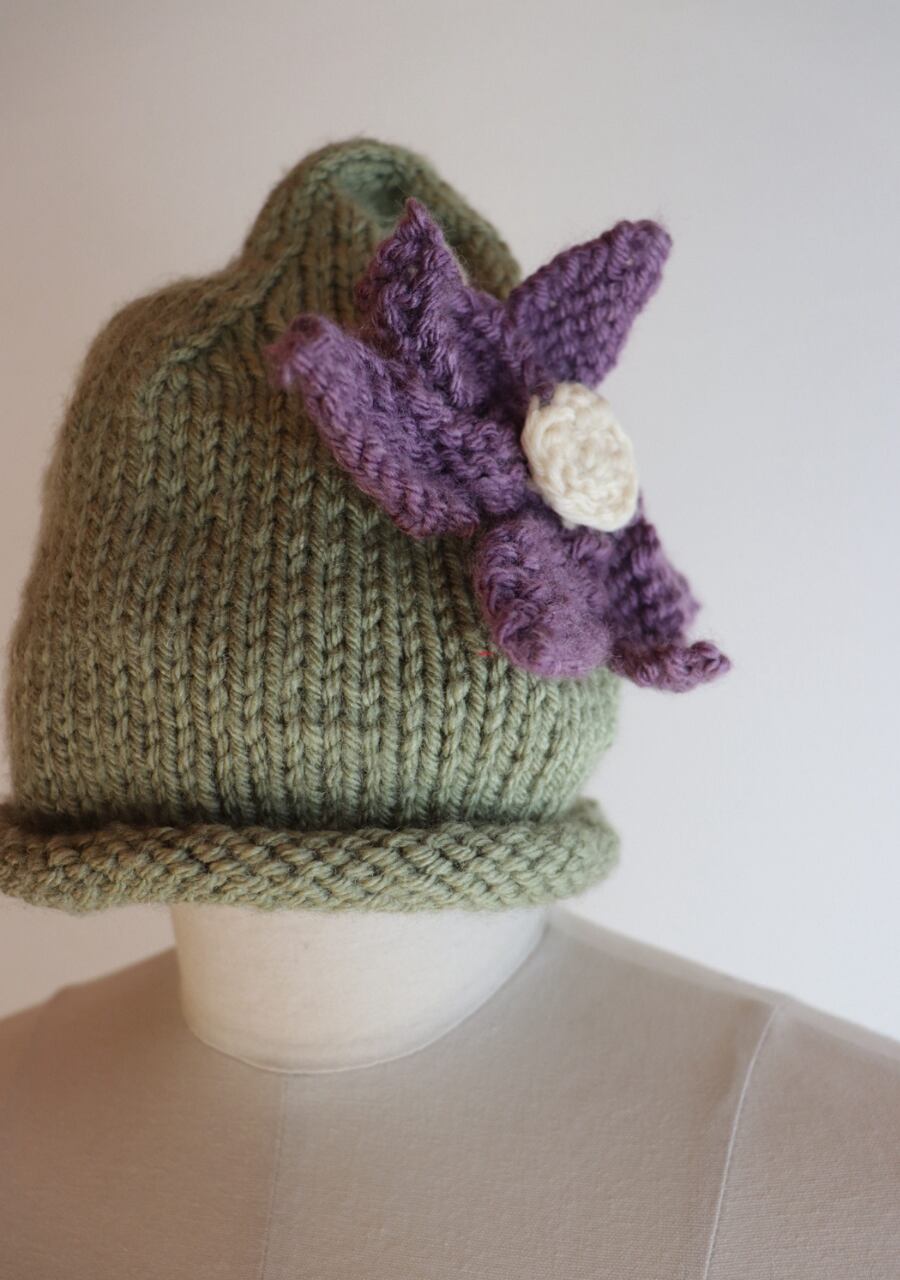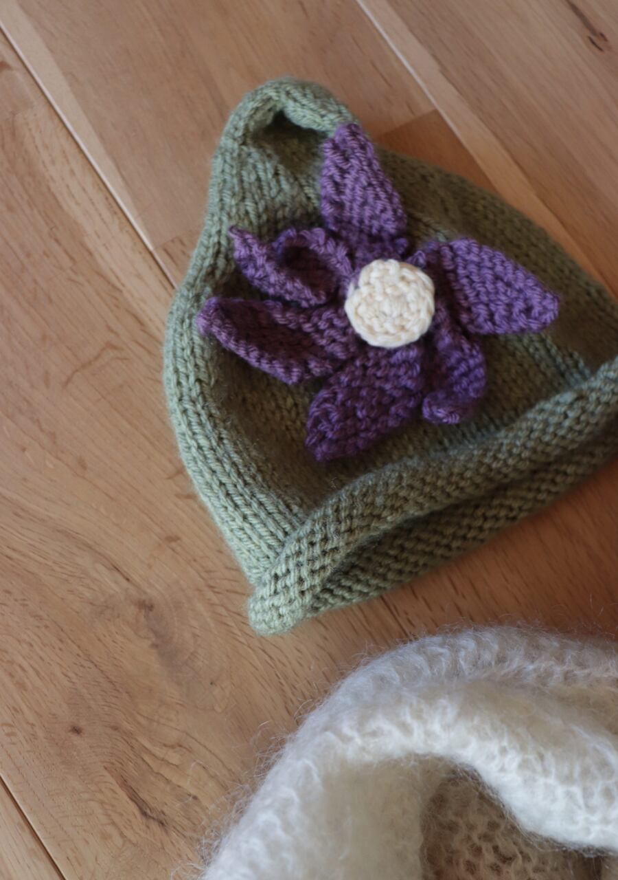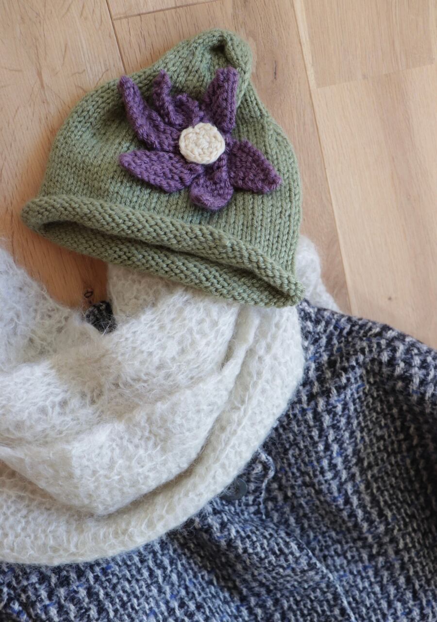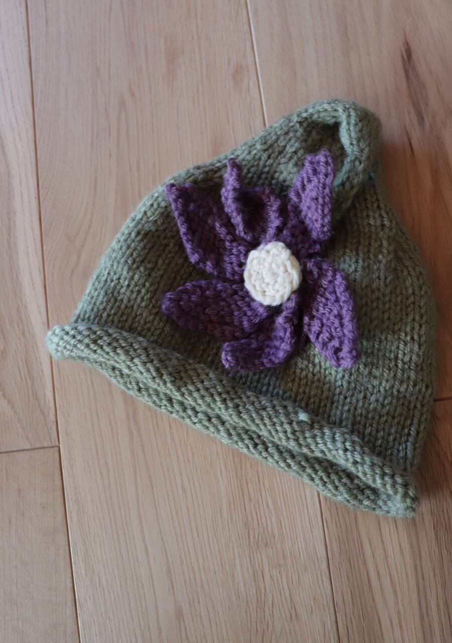 毛糸で編まれた大きなお花のコサージュがポイントで先がくるんと丸まった可愛いデザイン。