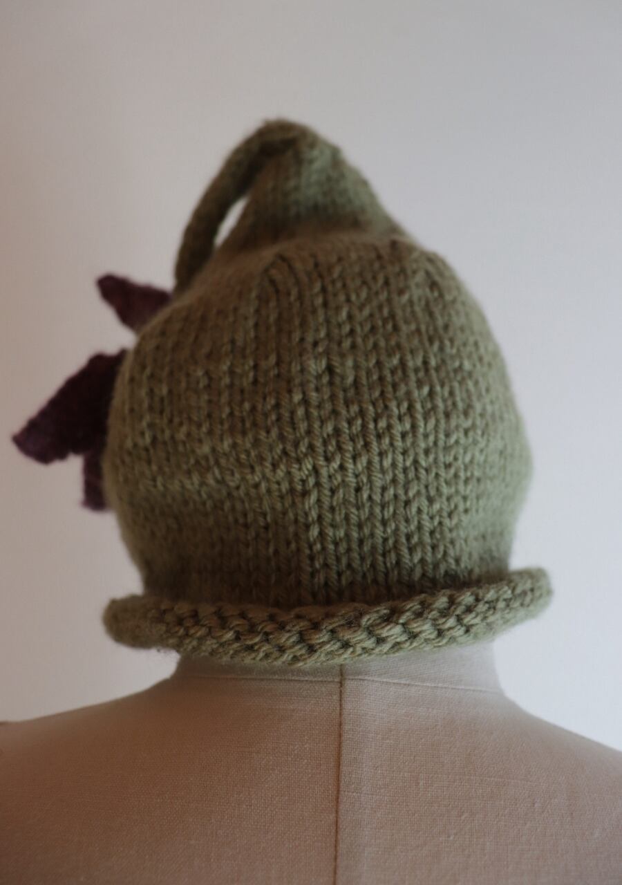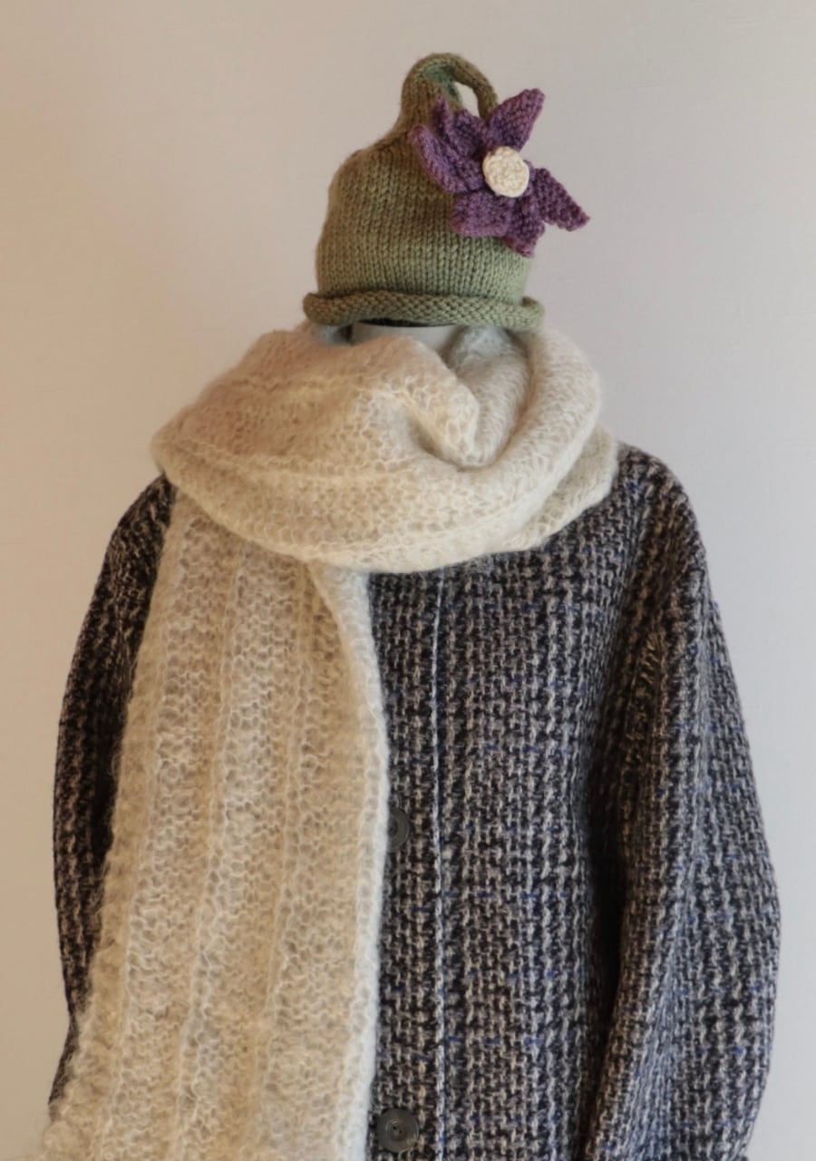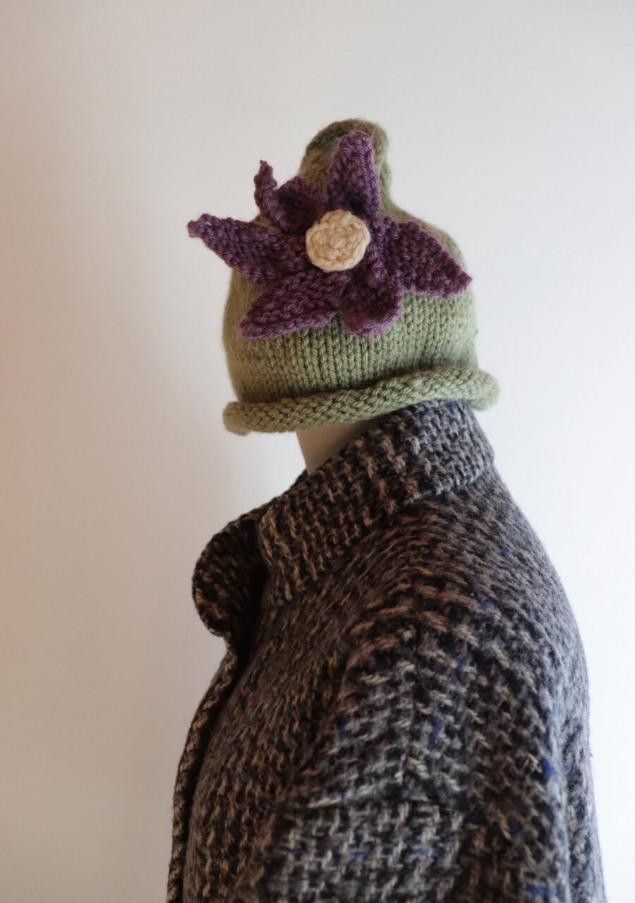 毛糸で編まれた大きなお花のコサージュがポイントで先がくるんと丸まった可愛いデザイン。