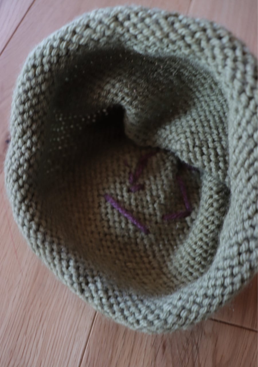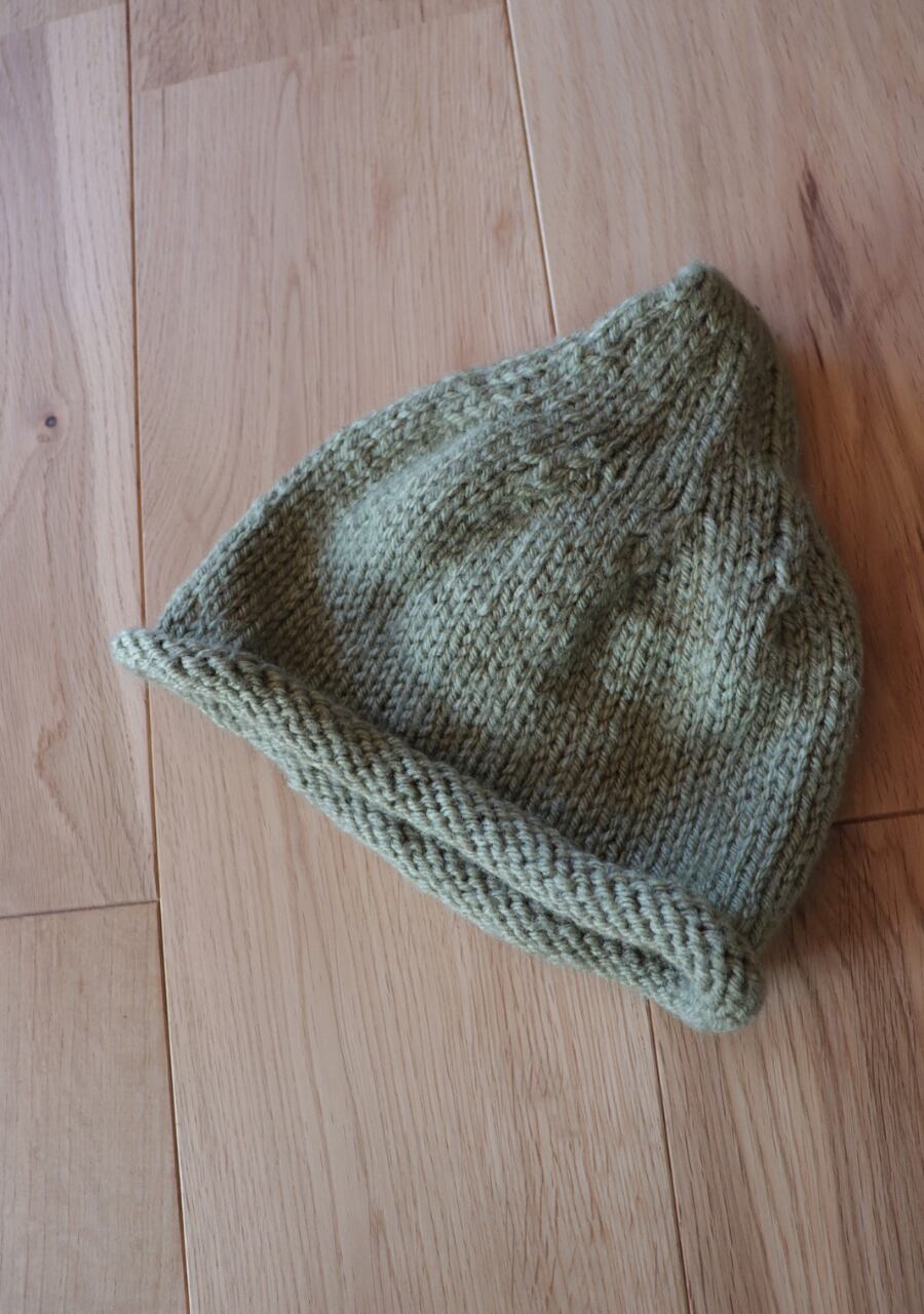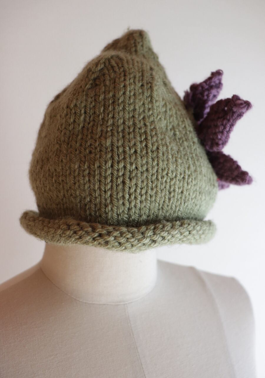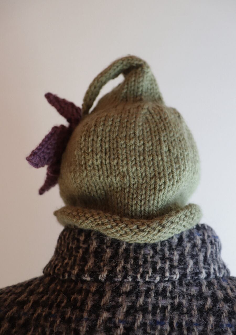 毛糸で編まれた大きなお花のコサージュがポイントで先がくるんと丸まった可愛いデザイン。