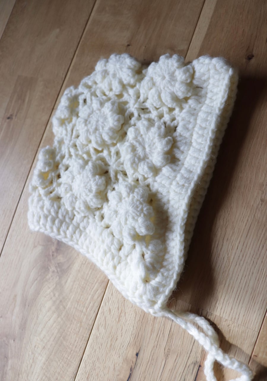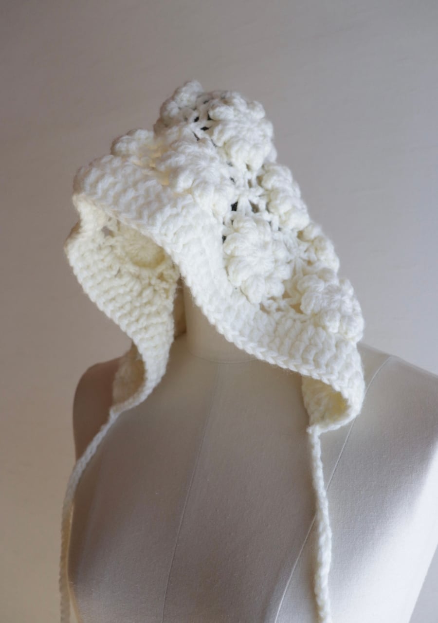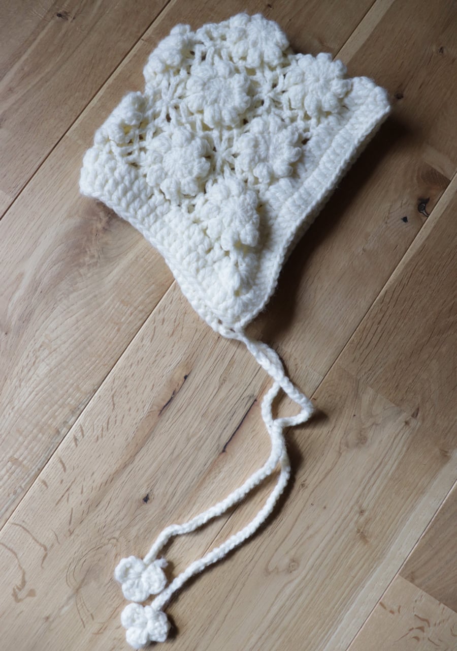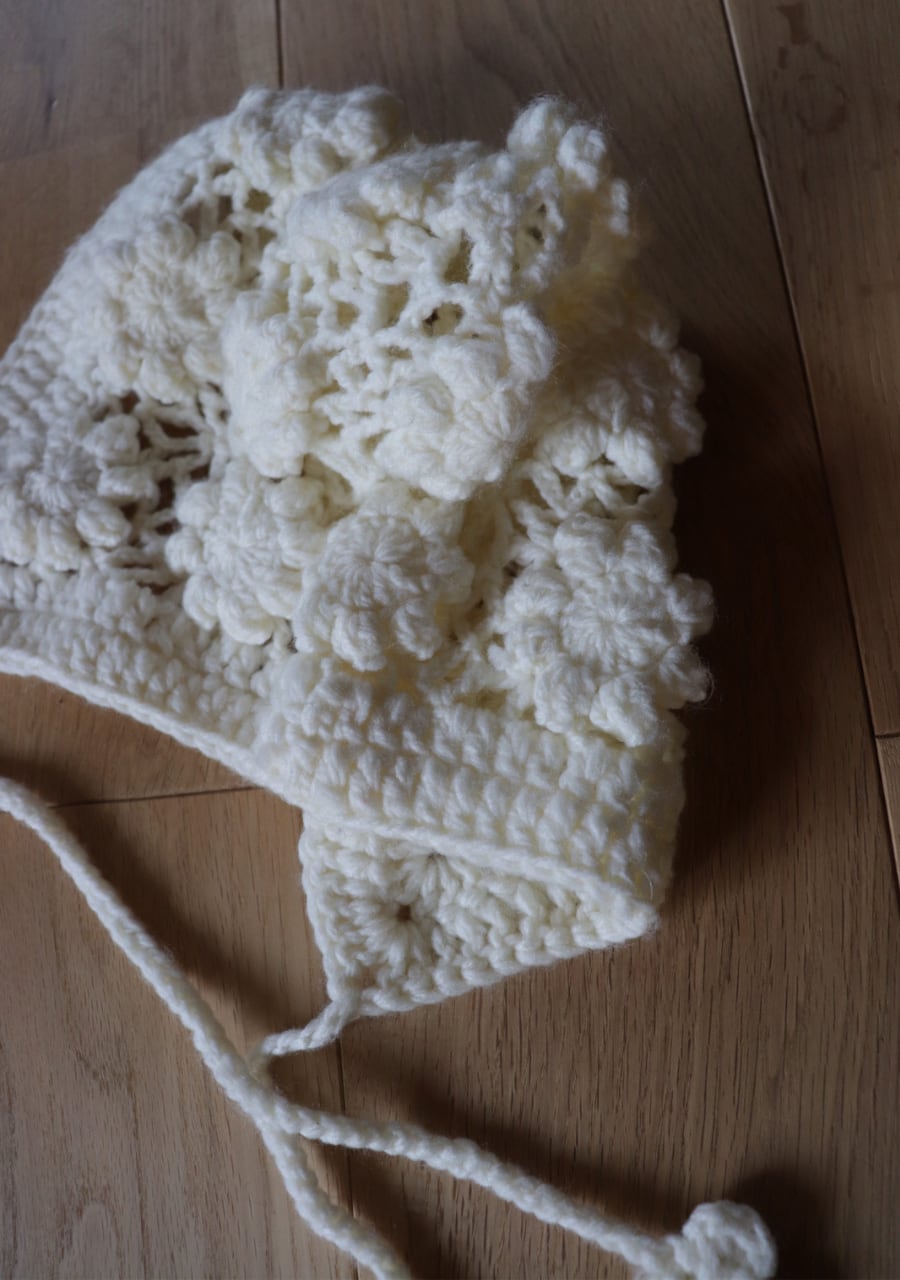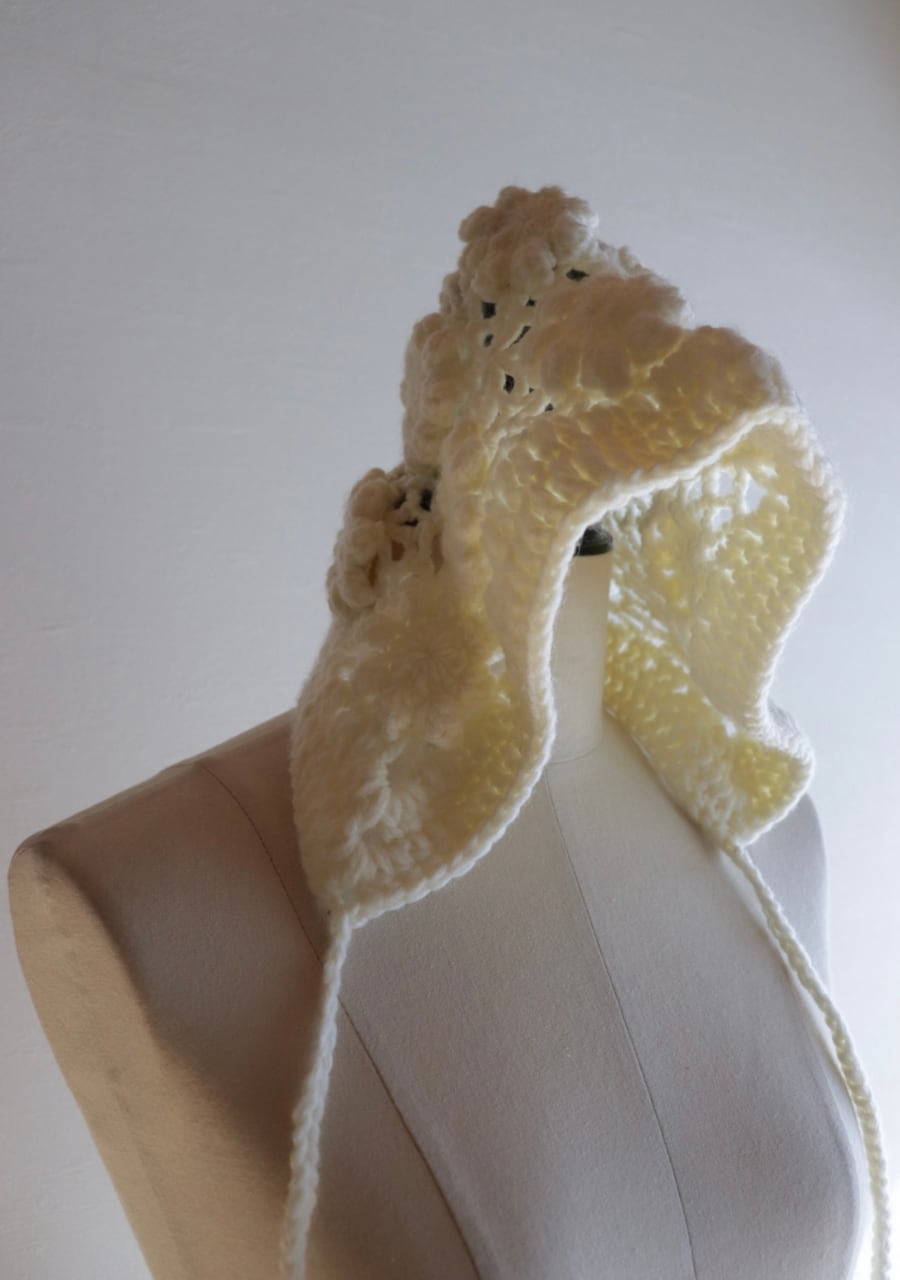 かぎ編で編まれた立体感溢れるお花がとにかく可愛い。耳も覆うそのシルエットはキュートでガーリーな印象。このボンネットはスタイリングのアクセントに。大人もちゃんと被れるサイズです。