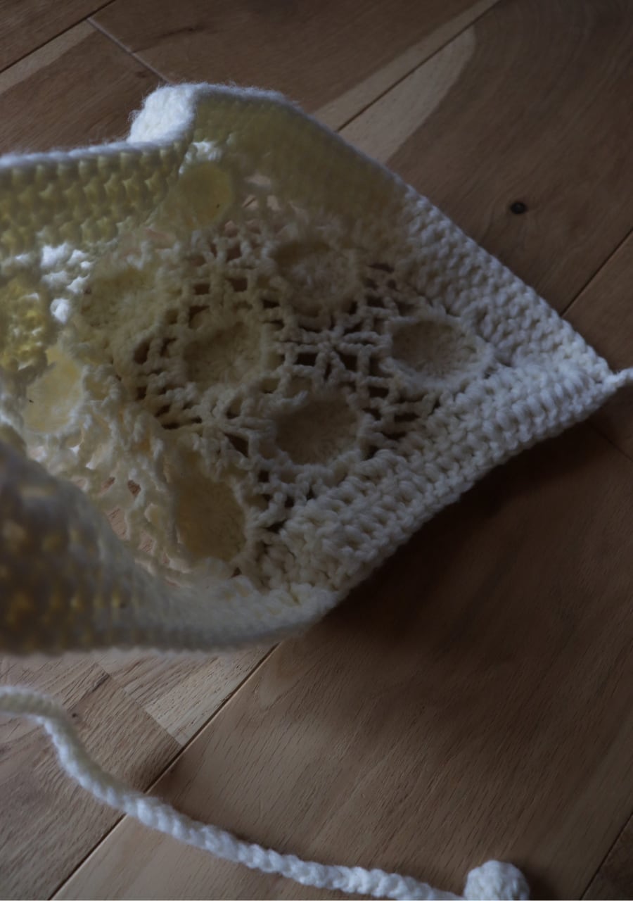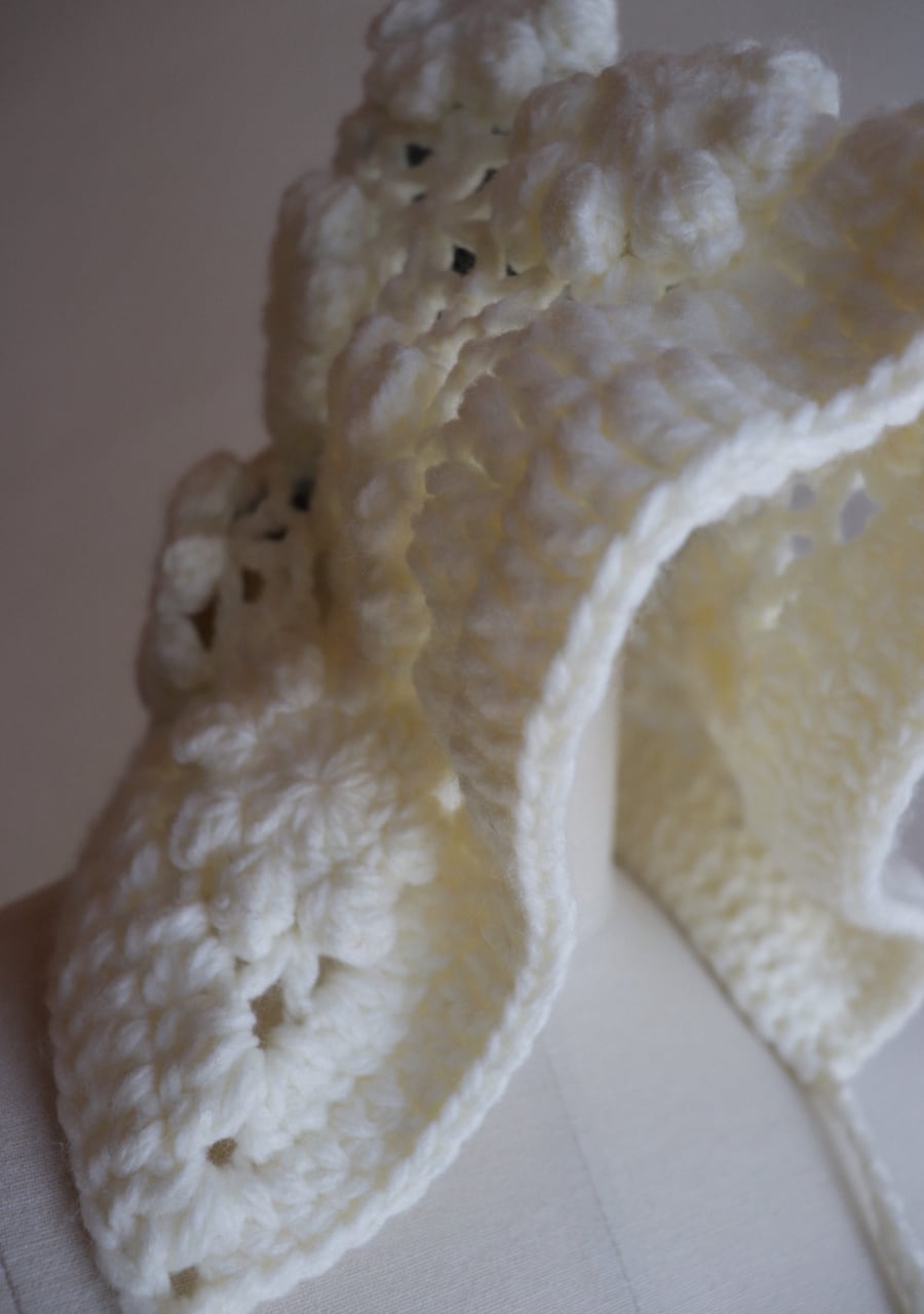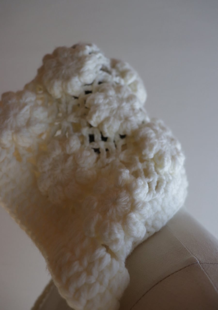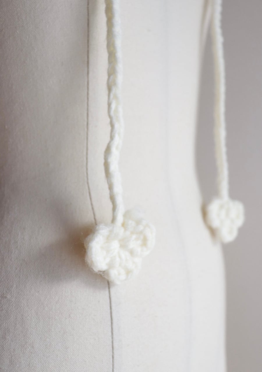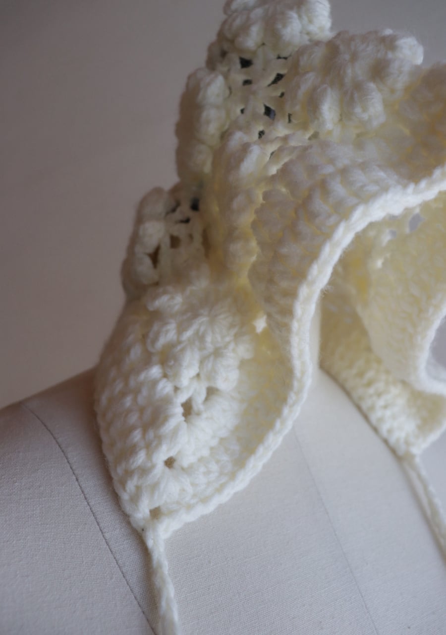 かぎ編で編まれた立体感溢れるお花がとにかく可愛い。耳も覆うそのシルエットはキュートでガーリーな印象。このボンネットはスタイリングのアクセントに。大人もちゃんと被れるサイズです。