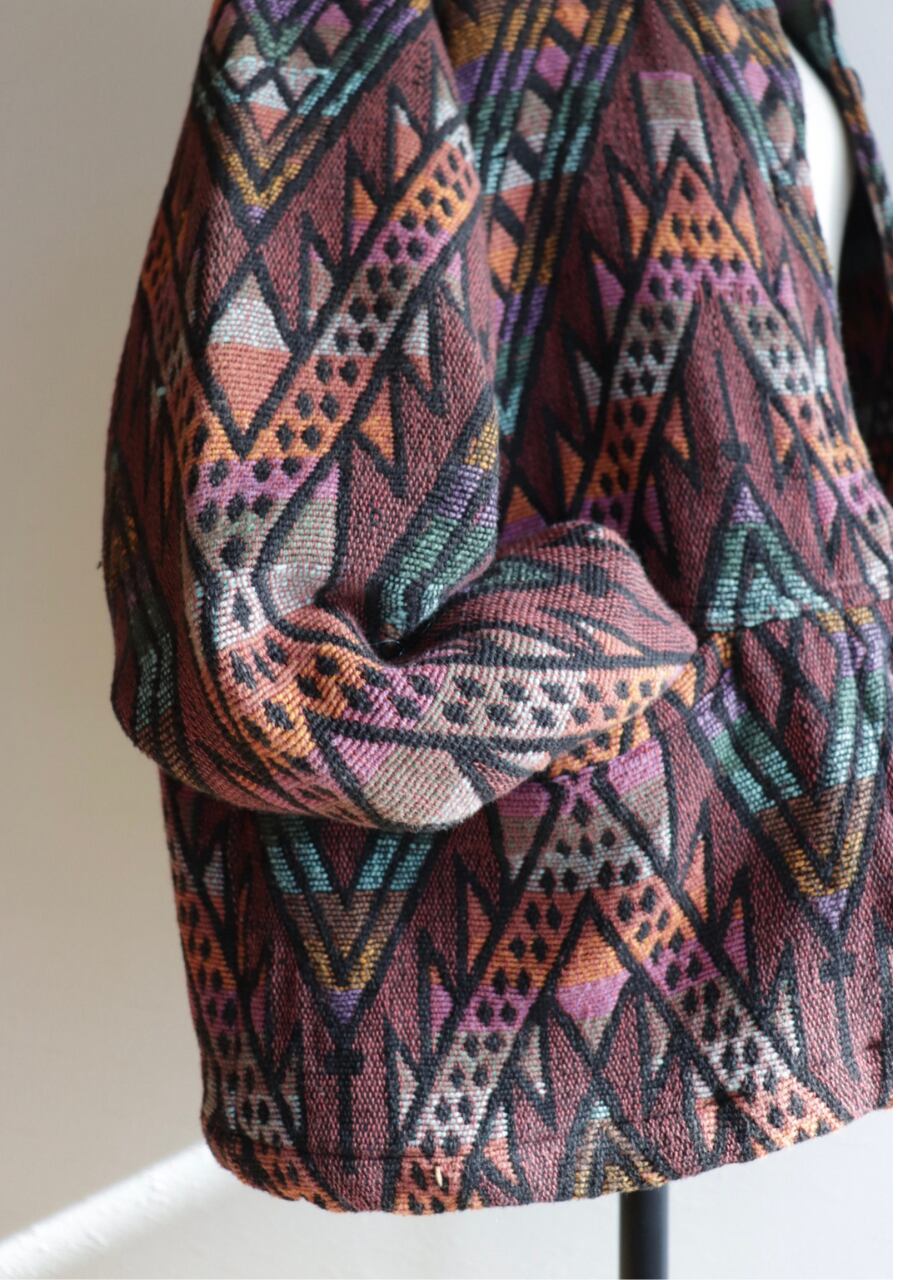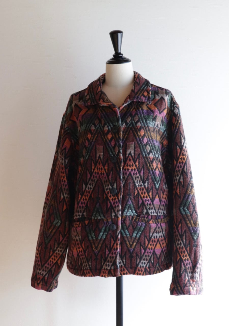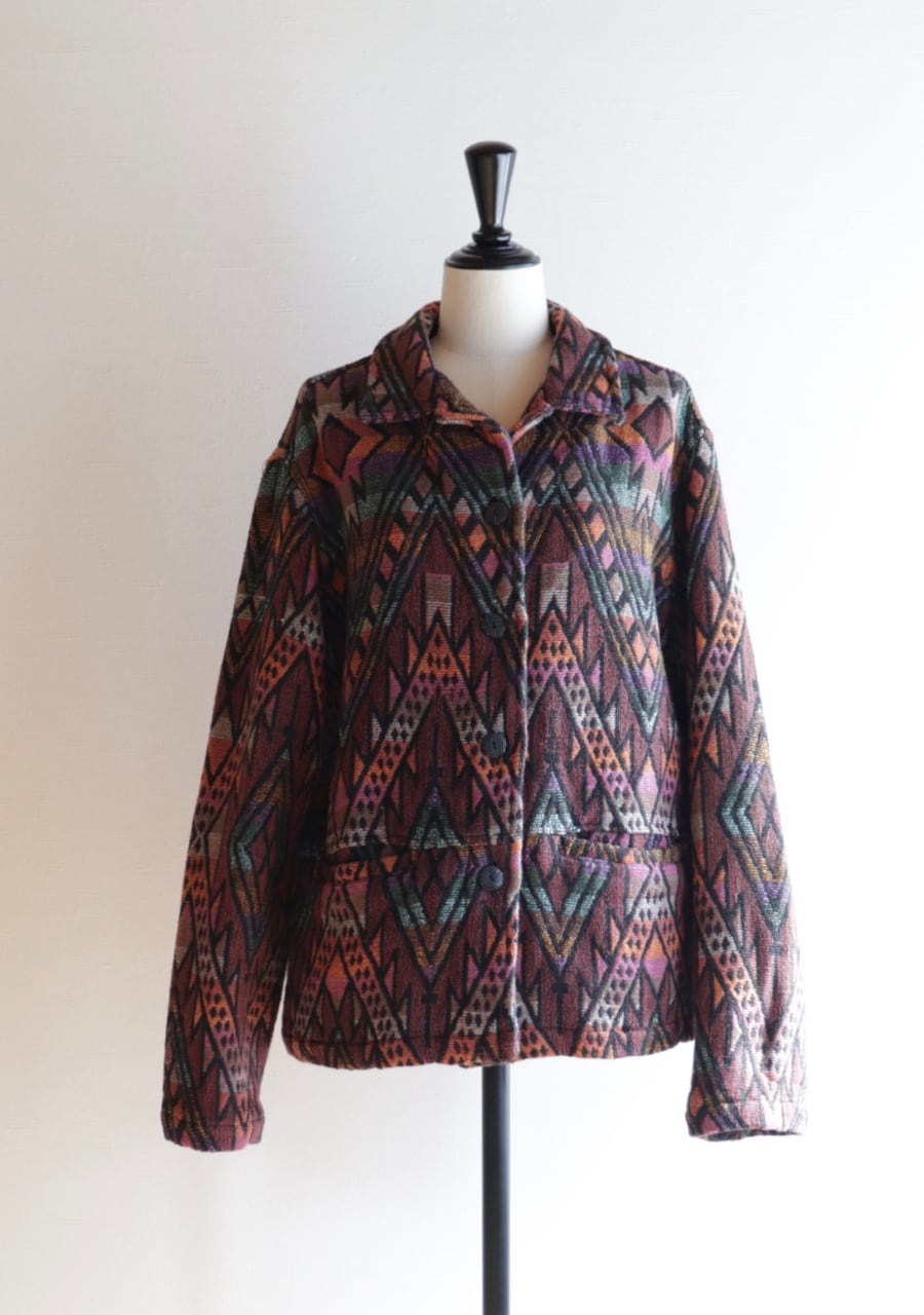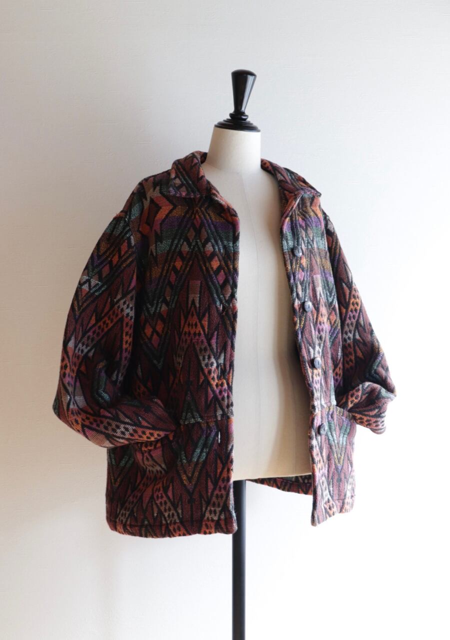 ゴブラン織りの生地が特徴で中厚生地のジャケット。温かみある色味が良い。ボタンを開けてもも閉めてもスタイリングしやすくレイヤードも楽しんでいただけます。