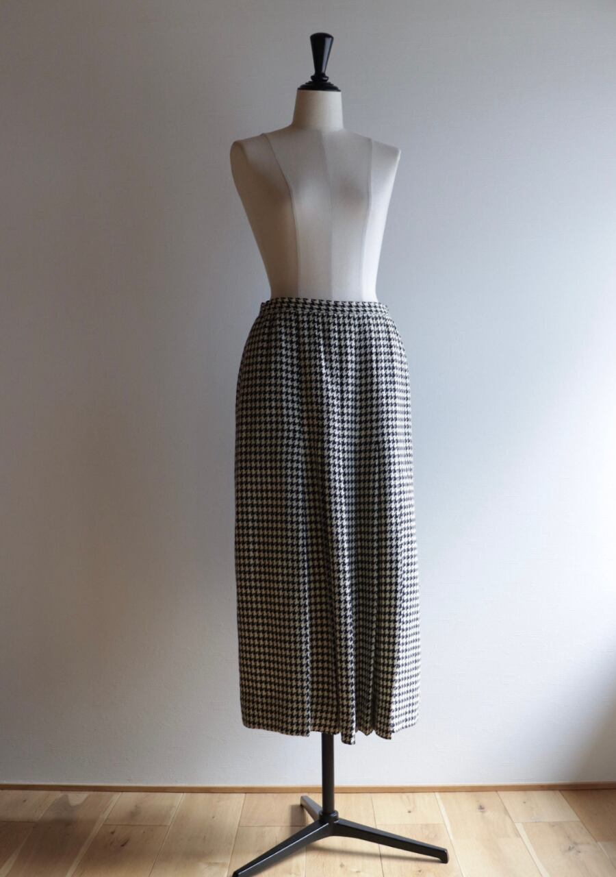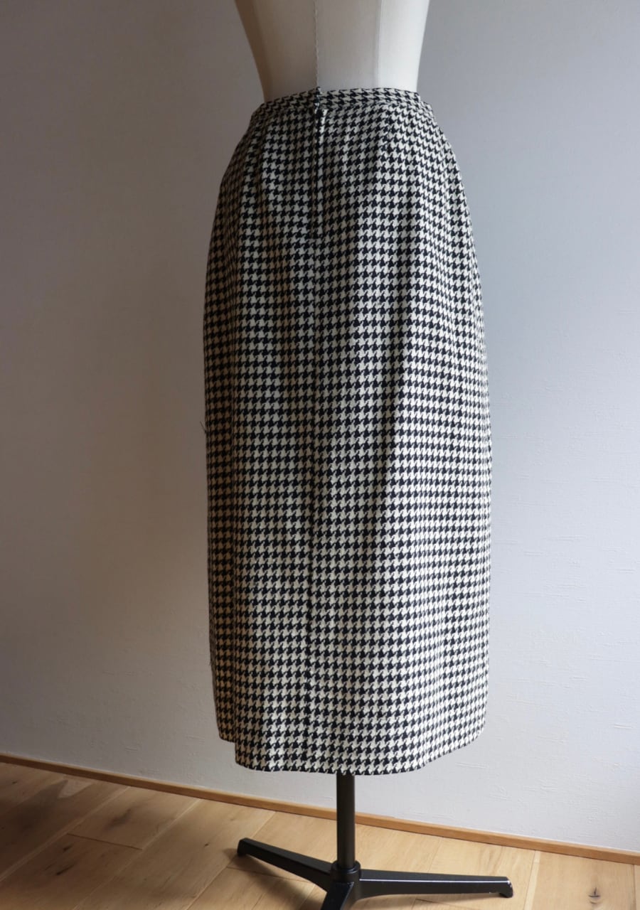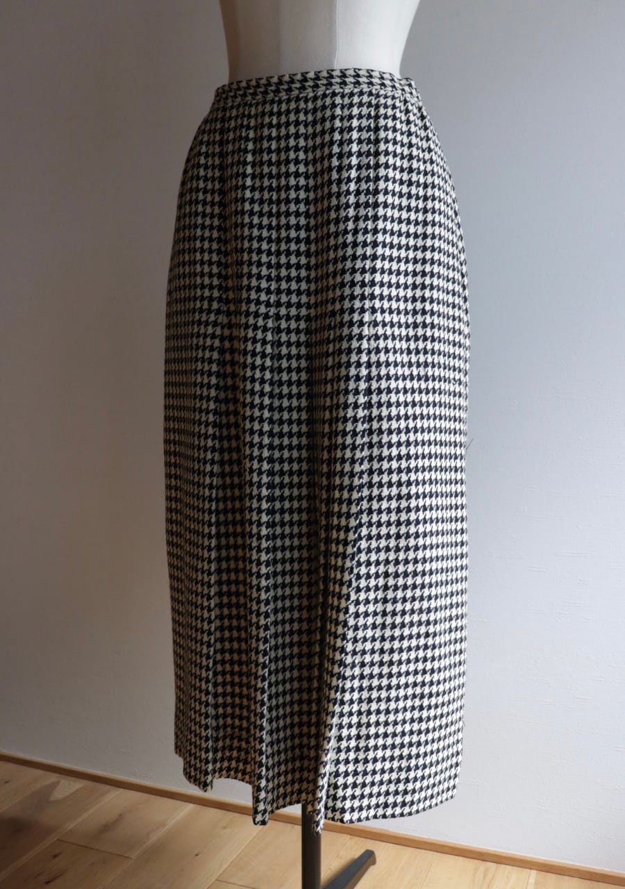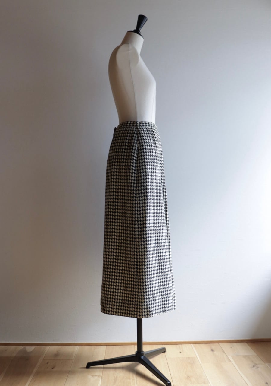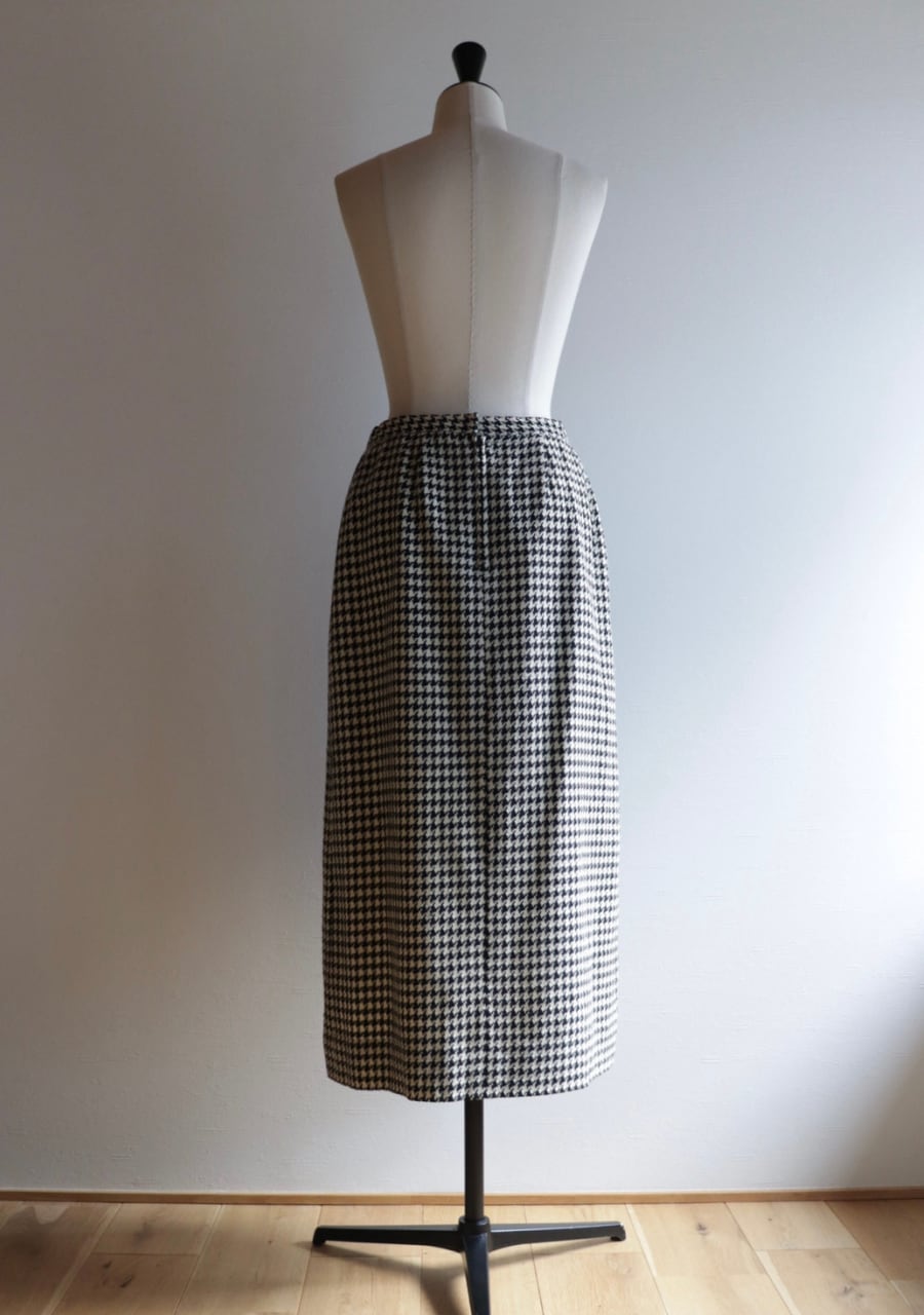 TALONジップを採用していて形より70S~の物と思われます。やや薄手の生地は柔らかく肌触りの良い温かみある上品な生地。緩やかなタイトシルエットでフロント部分のプリーツデザインと長めの丈感がとても上品。シンプルでシックな千鳥格子柄で大人っぽくも可愛くもスタイリング次第で雰囲気可能。両サイドにポケットありでホックが二段階なのもうれしい。素敵なスカートです。