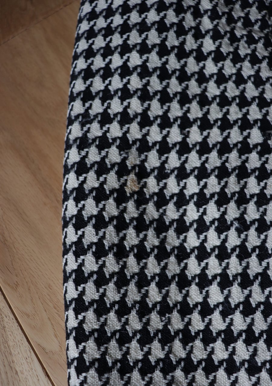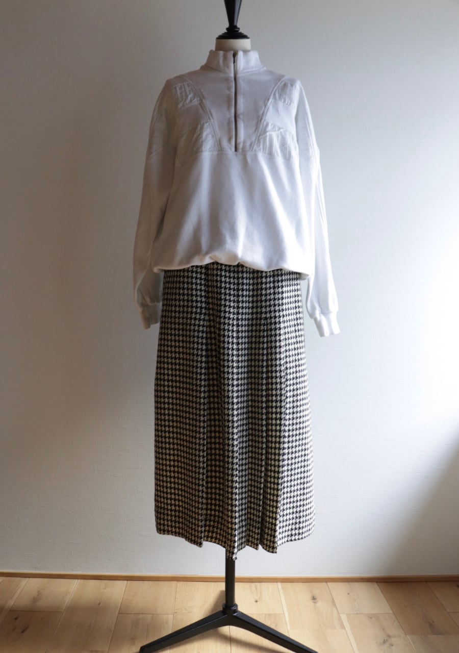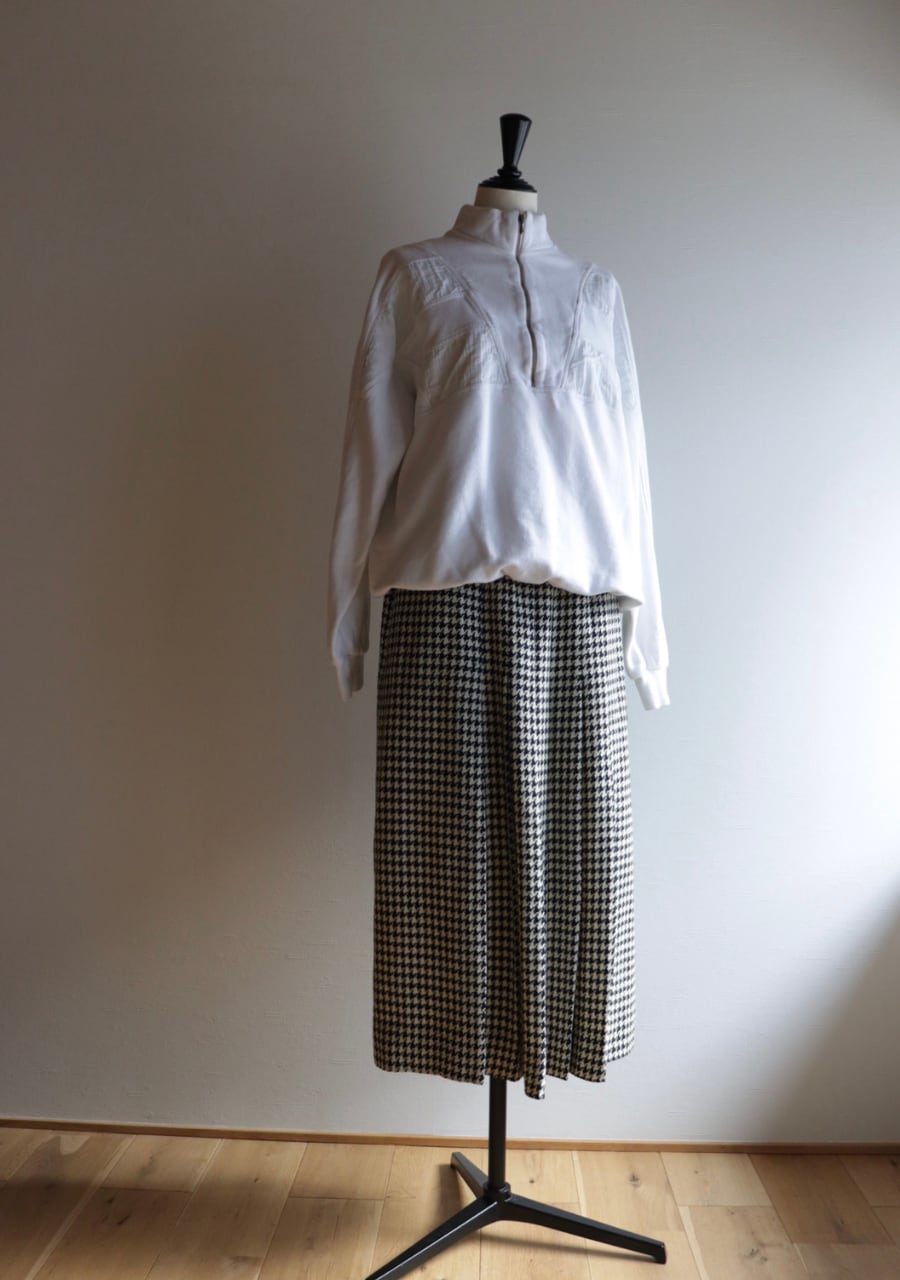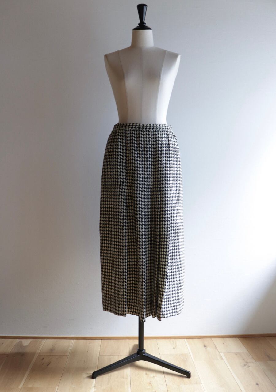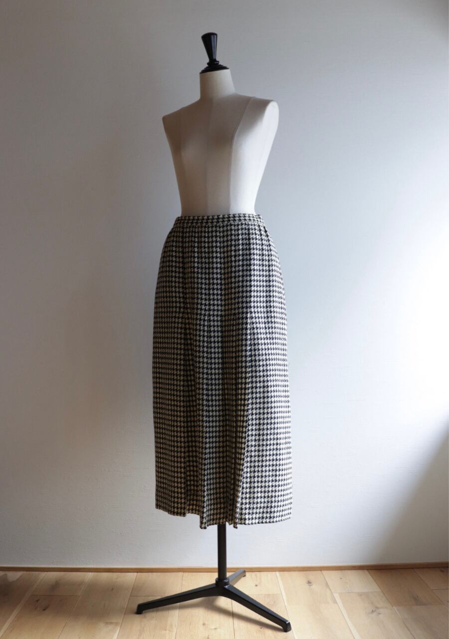 TALONジップを採用していて形より70S~の物と思われます。やや薄手の生地は柔らかく肌触りの良い温かみある上品な生地。緩やかなタイトシルエットでフロント部分のプリーツデザインと長めの丈感がとても上品。シンプルでシックな千鳥格子柄で大人っぽくも可愛くもスタイリング次第で雰囲気可能。両サイドにポケットありでホックが二段階なのもうれしい。素敵なスカートです。