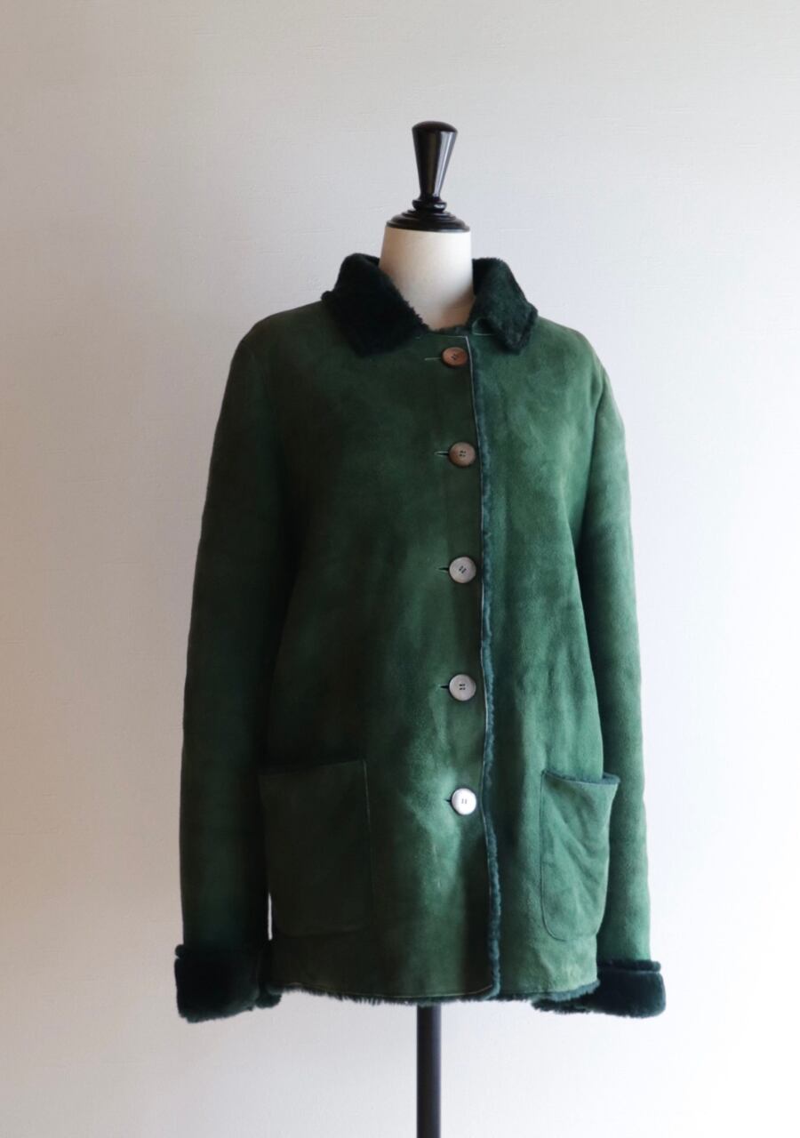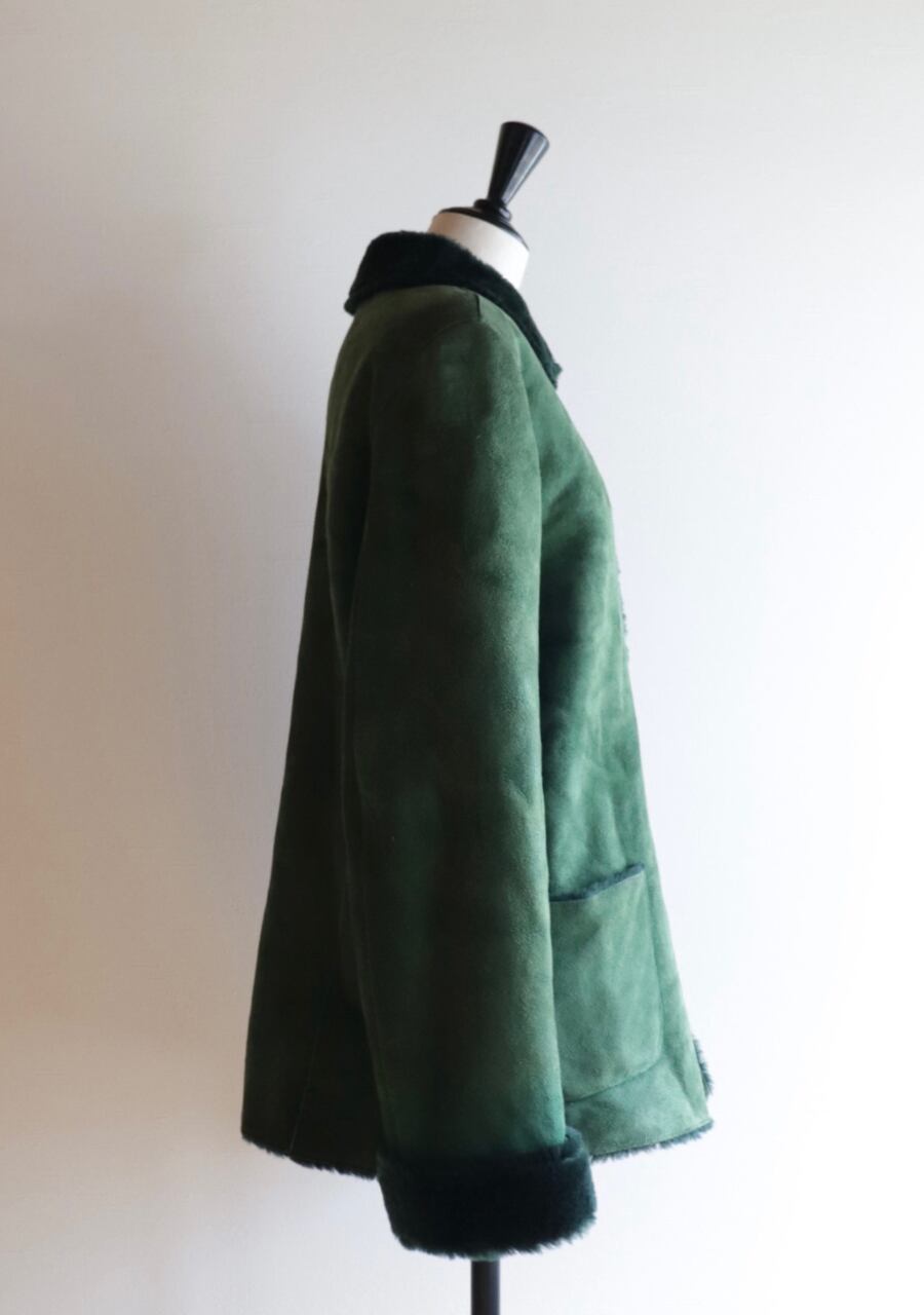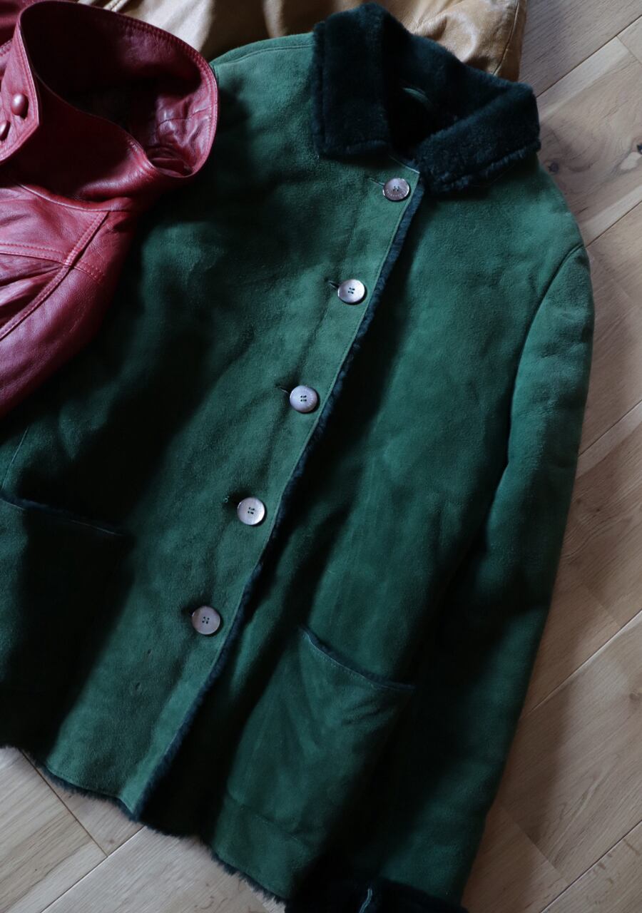 深いグリーンcolorが特徴のムートンジャケット。ふんわり肌触りも良く抜群の暖かさ。色味が大人っぽいのに折り返した襟と袖が可愛い。大き目のシェルの輝きが上品なボタンもポイント。大変素敵な一着です。