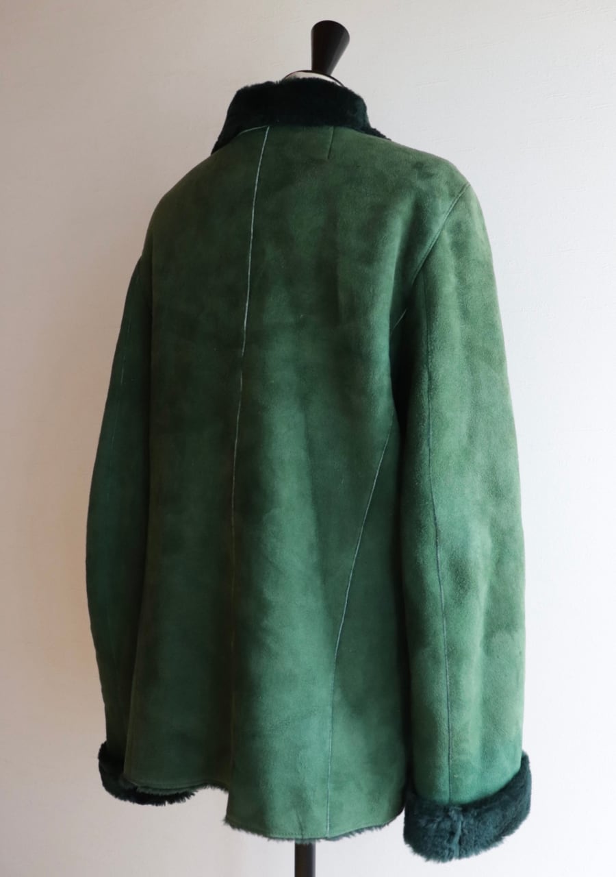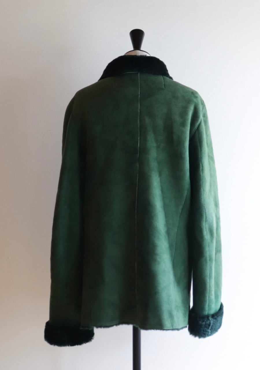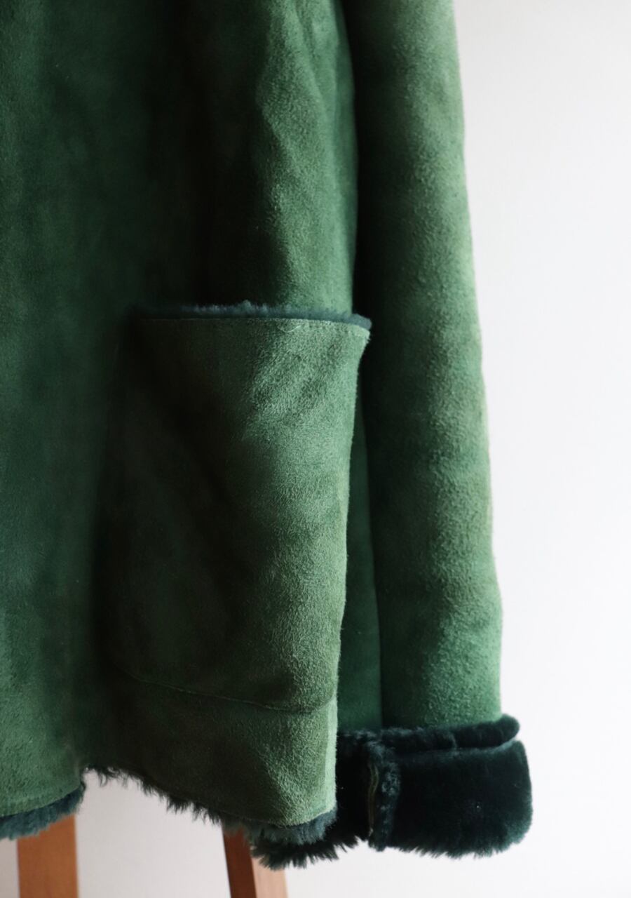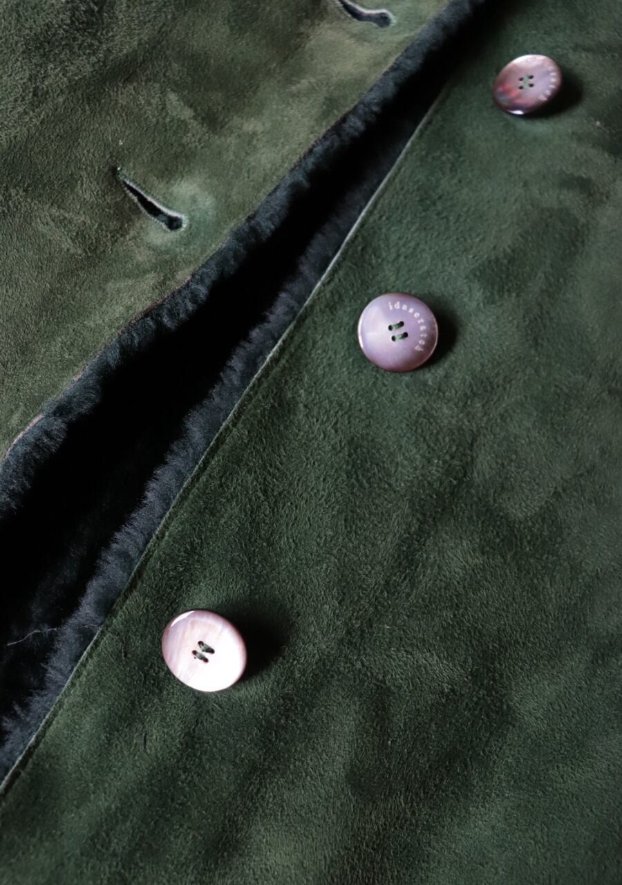 深いグリーンcolorが特徴のムートンジャケット。ふんわり肌触りも良く抜群の暖かさ。色味が大人っぽいのに折り返した襟と袖が可愛い。大き目のシェルの輝きが上品なボタンもポイント。大変素敵な一着です。