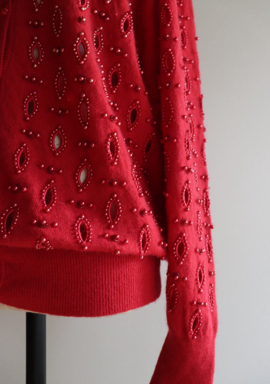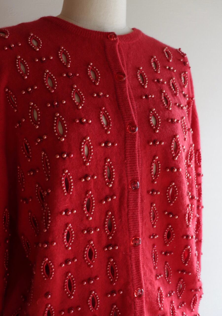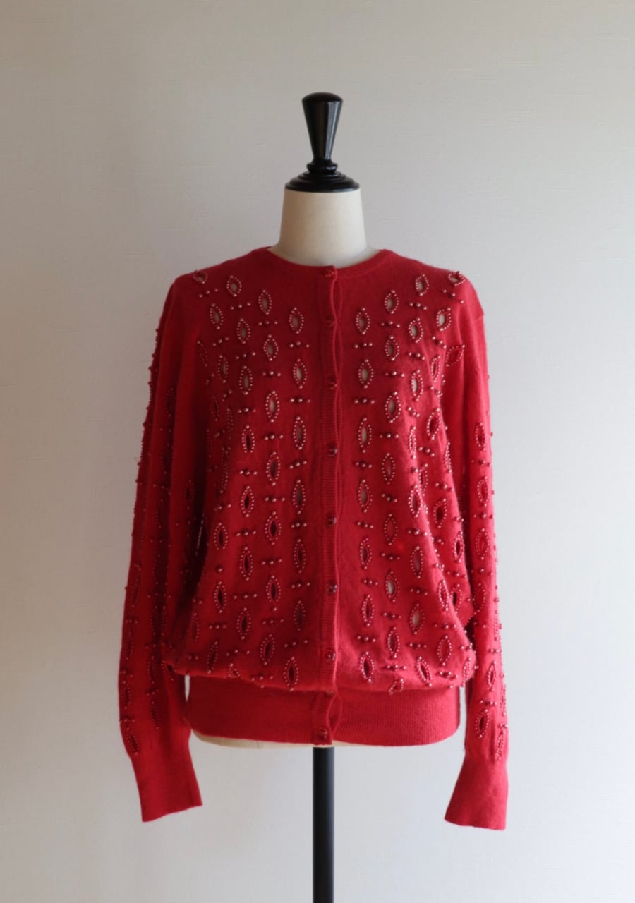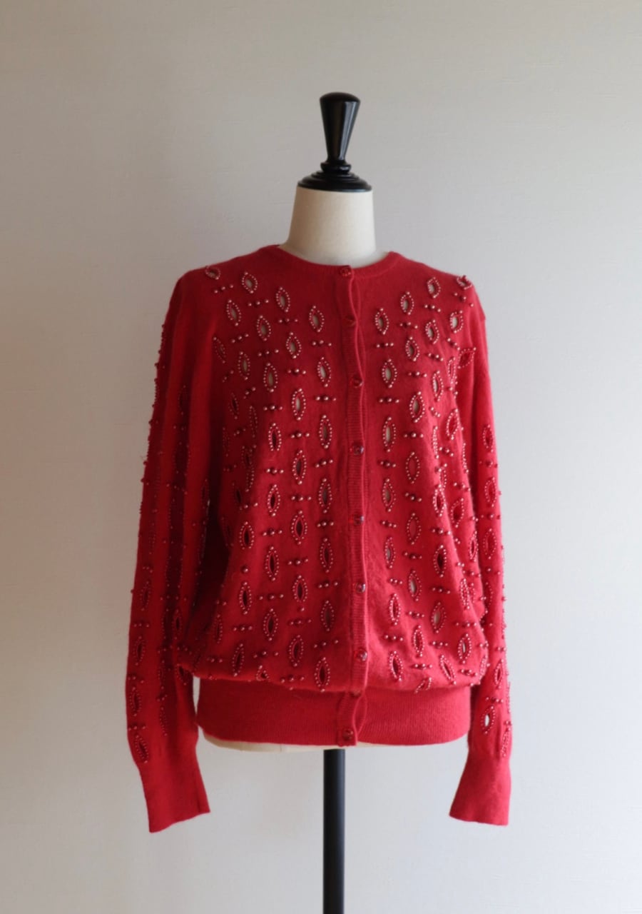 全体にカッティングとまわりにビーズを丁寧にしつらわれたデザインが可愛いカーディガン。生地はやわらかく肌触りの良いアンゴラ混のウールでビーズ装飾の程よい重みが生地をすとんと落とさせたような着用感はとても女性らしくシルエットも綺麗。こういう一点物のデザインがうれしく古着の魅力。ところどころビーズ装飾が取れてしまっている部分がありますが