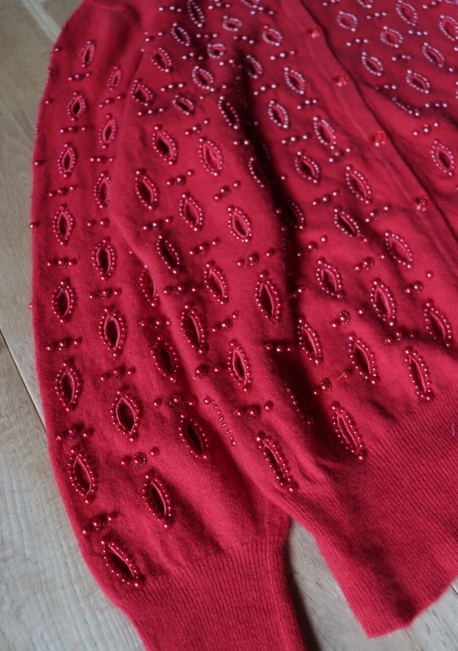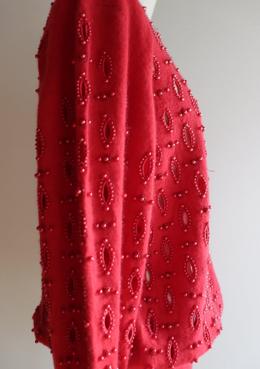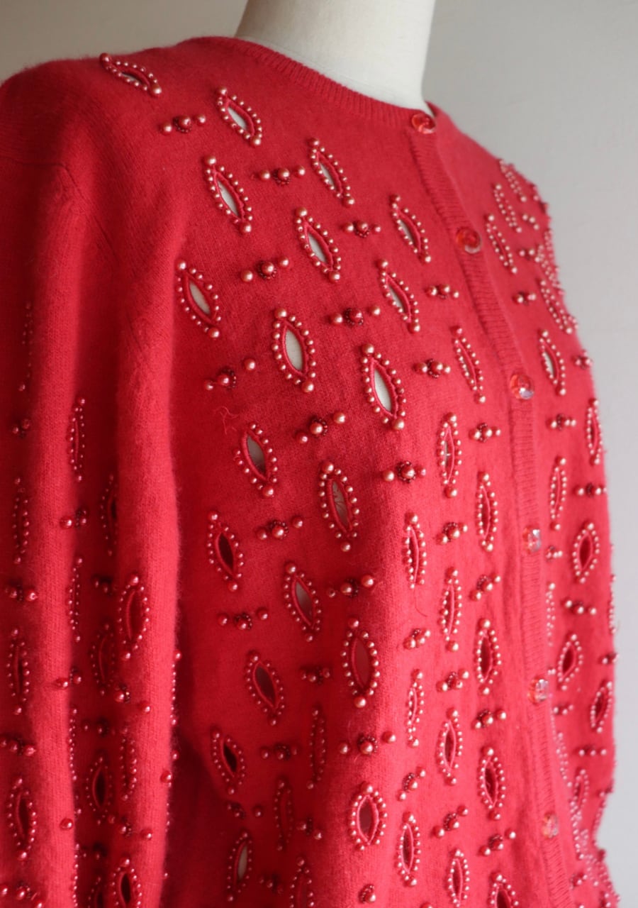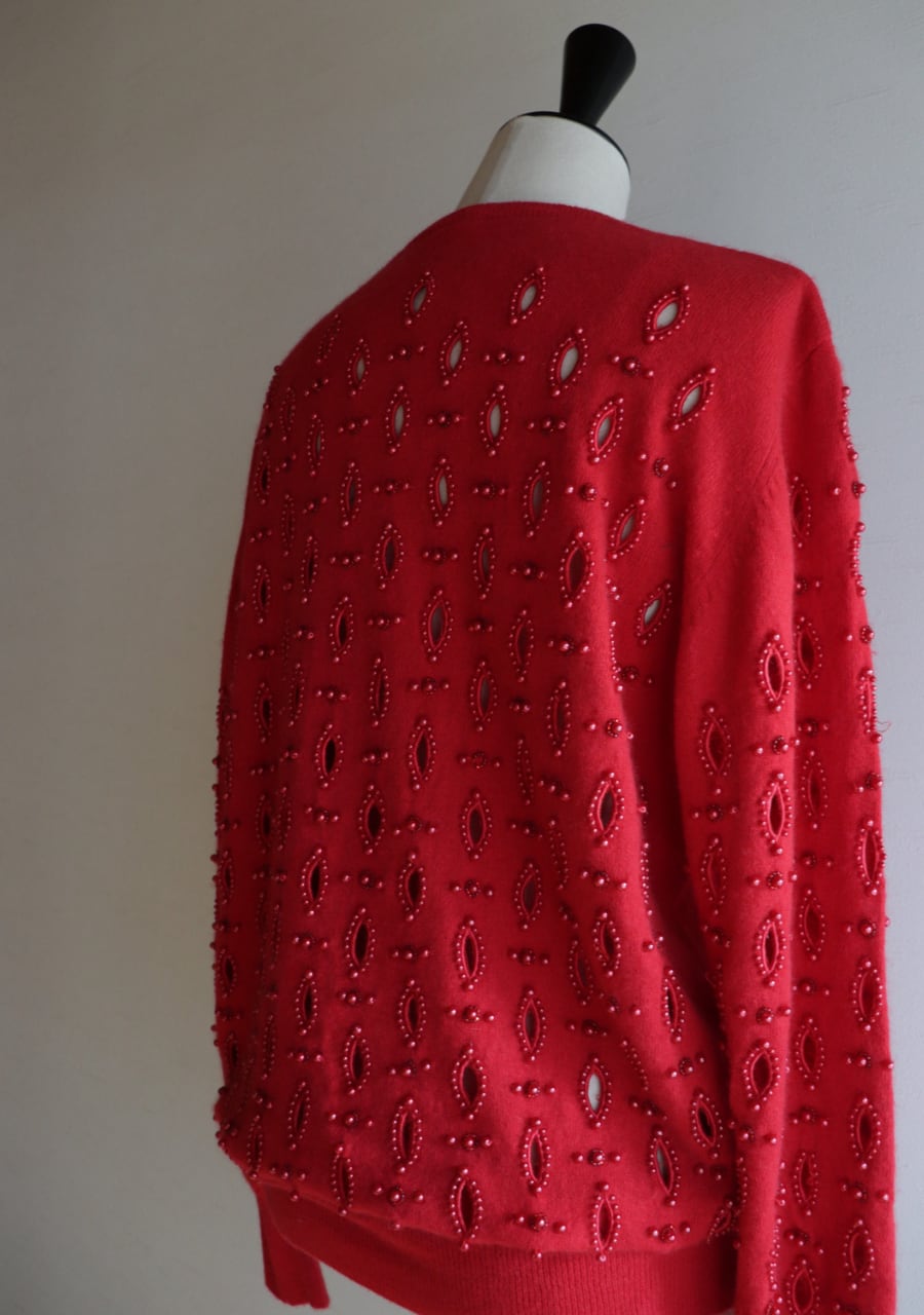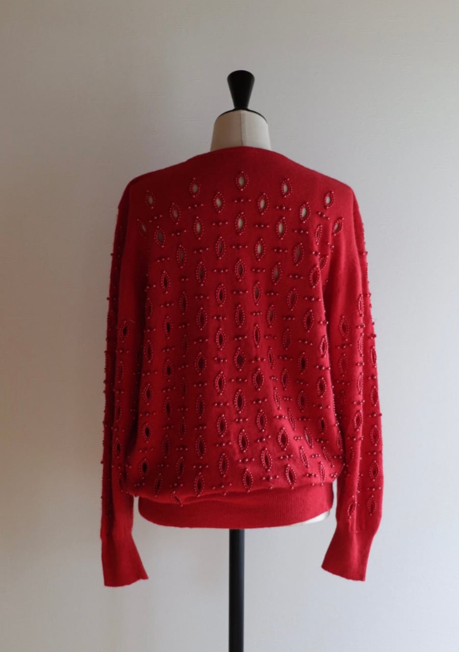 全体にカッティングとまわりにビーズを丁寧にしつらわれたデザインが可愛いカーディガン。生地はやわらかく肌触りの良いアンゴラ混のウールでビーズ装飾の程よい重みが生地をすとんと落とさせたような着用感はとても女性らしくシルエットも綺麗。こういう一点物のデザインがうれしく古着の魅力。ところどころビーズ装飾が取れてしまっている部分がありますが