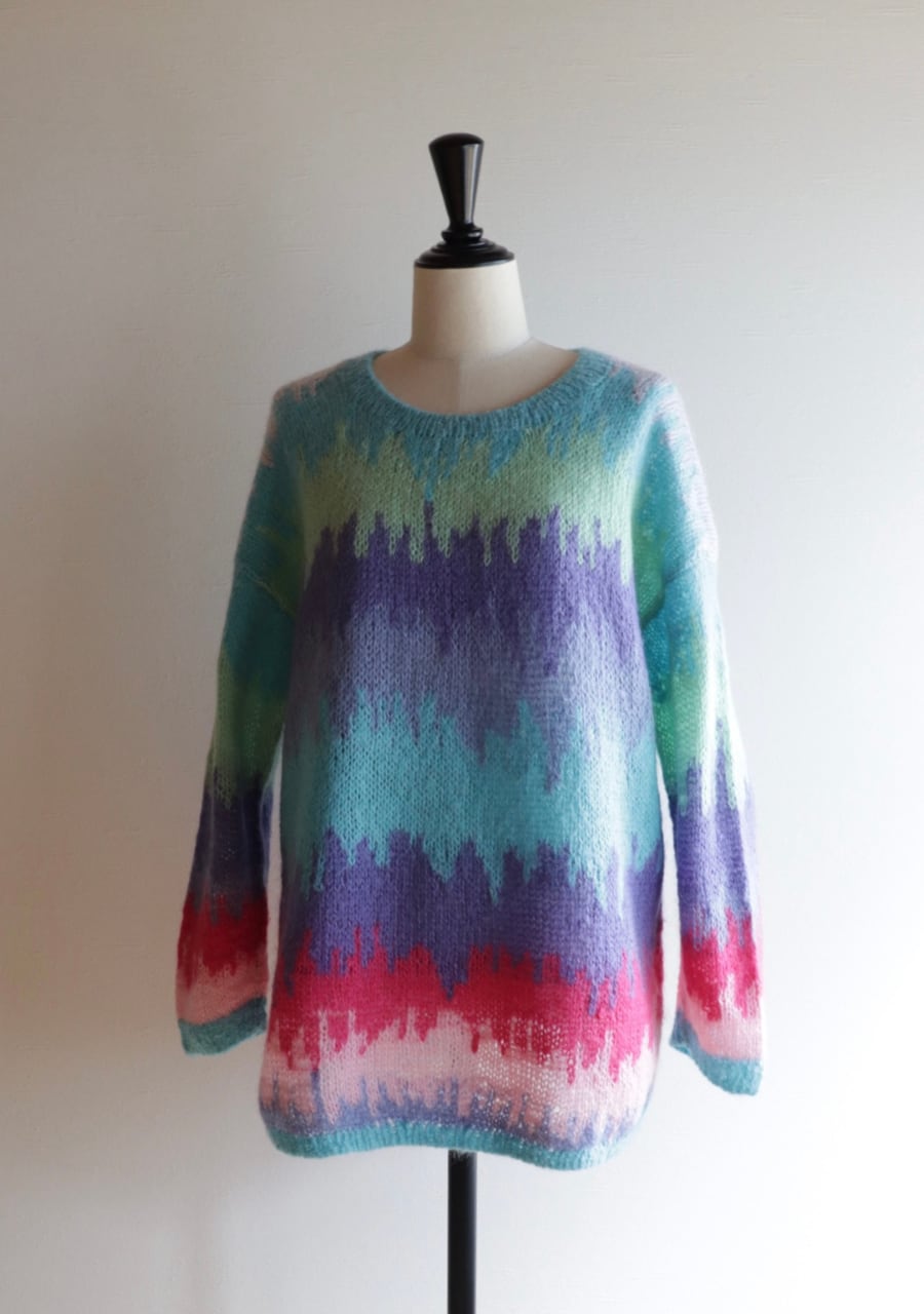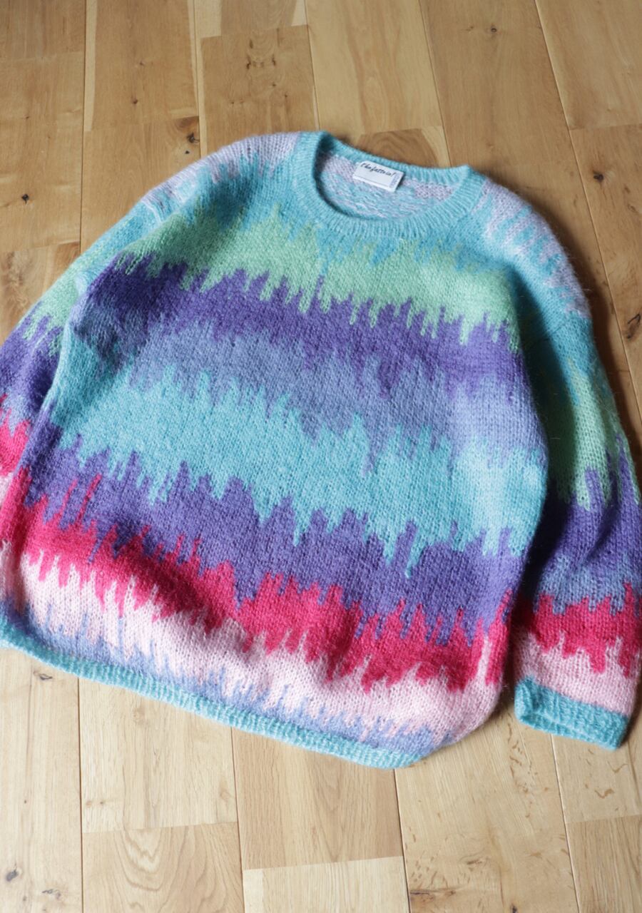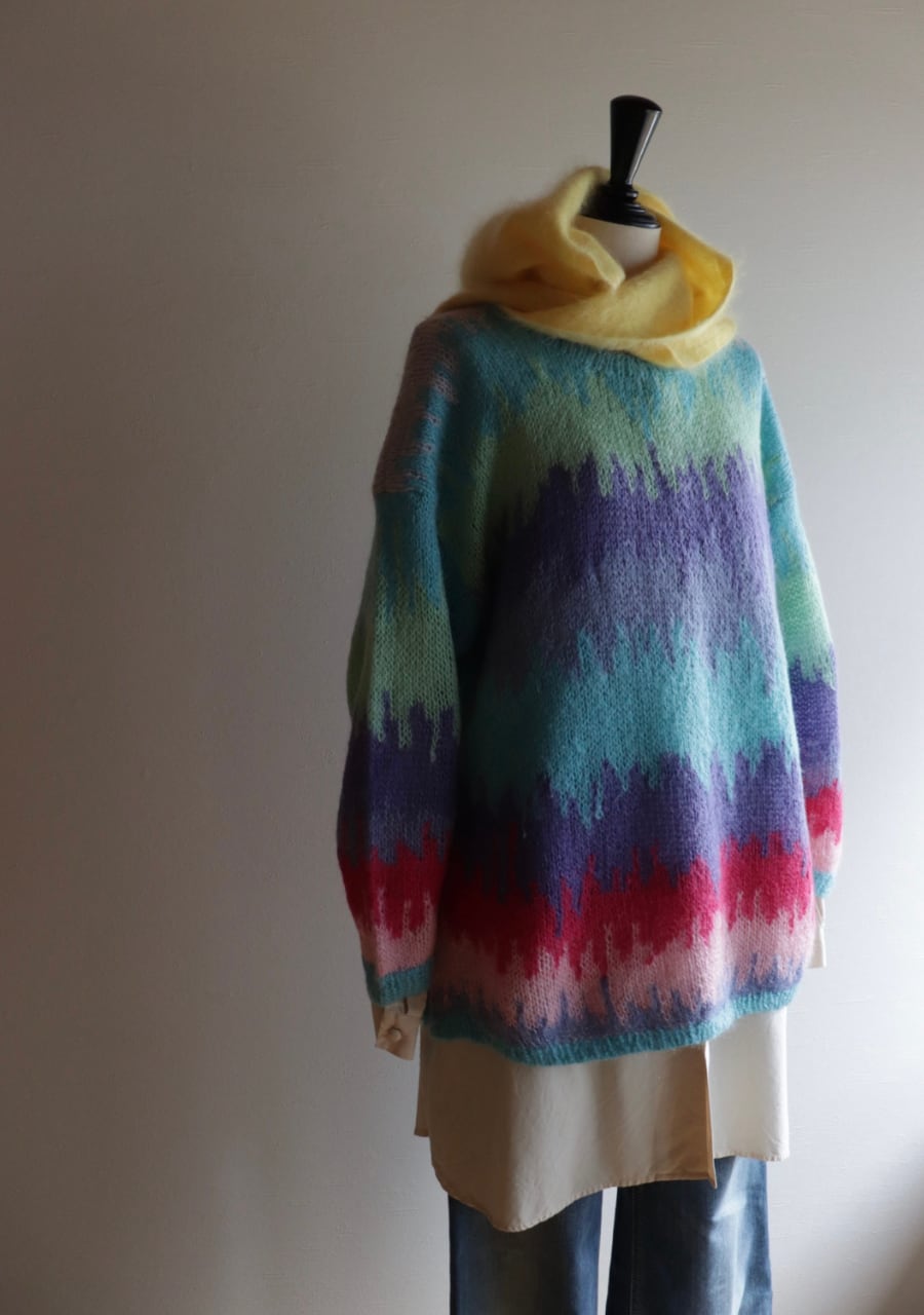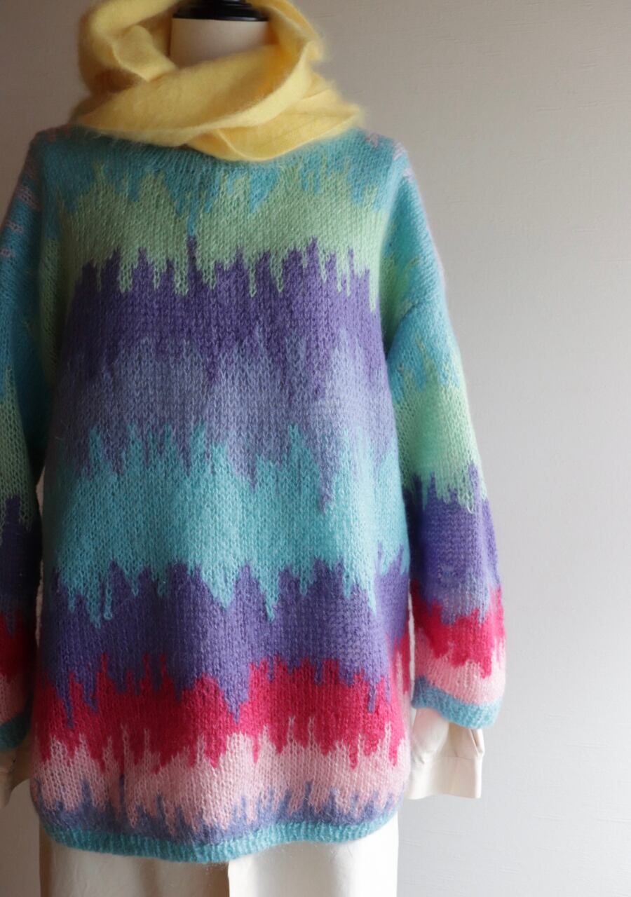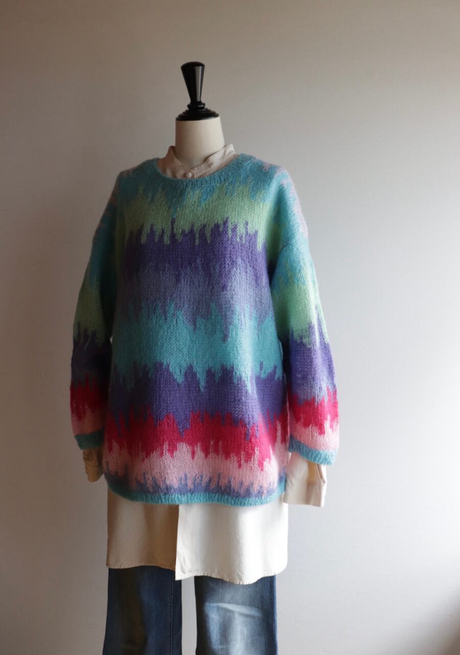カラフルな配色が可愛いハンドニット。やや薄手で軽くとても暖かいニット。159cm着用でお尻が隠れる丈感。デニムやスカートとも相性良し。ポップなカラーで気分も良し。スタイリングの主役になるニットです。