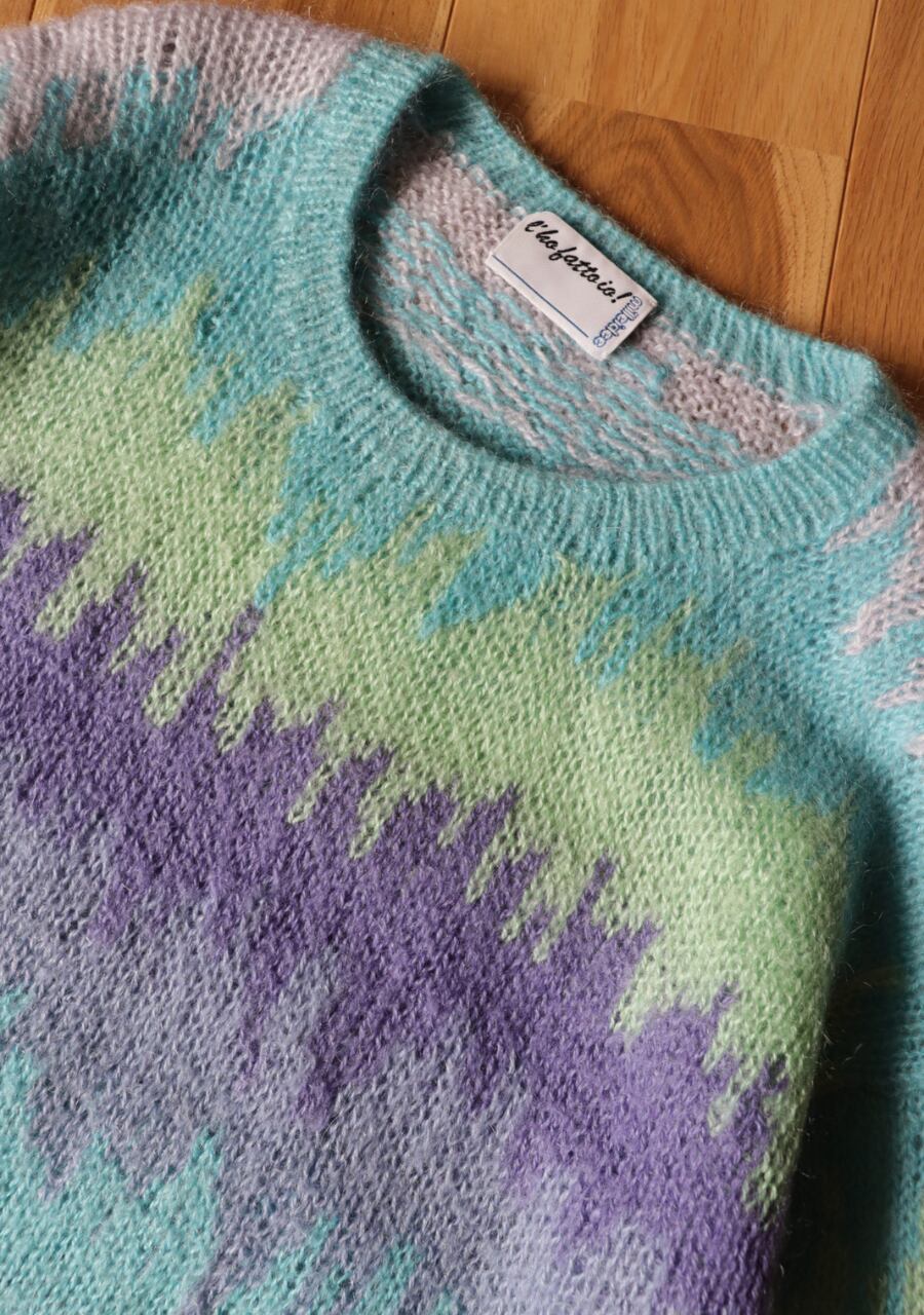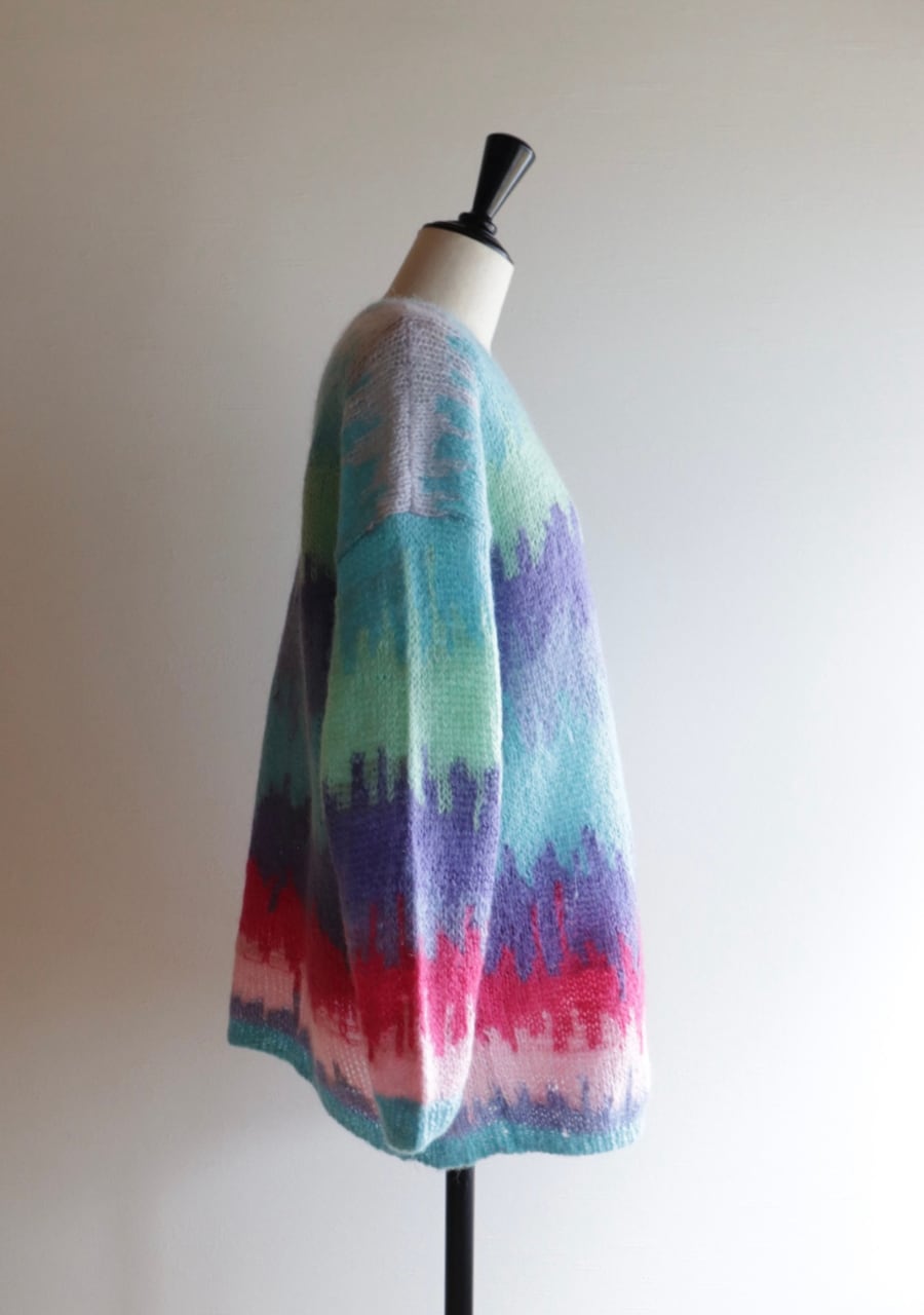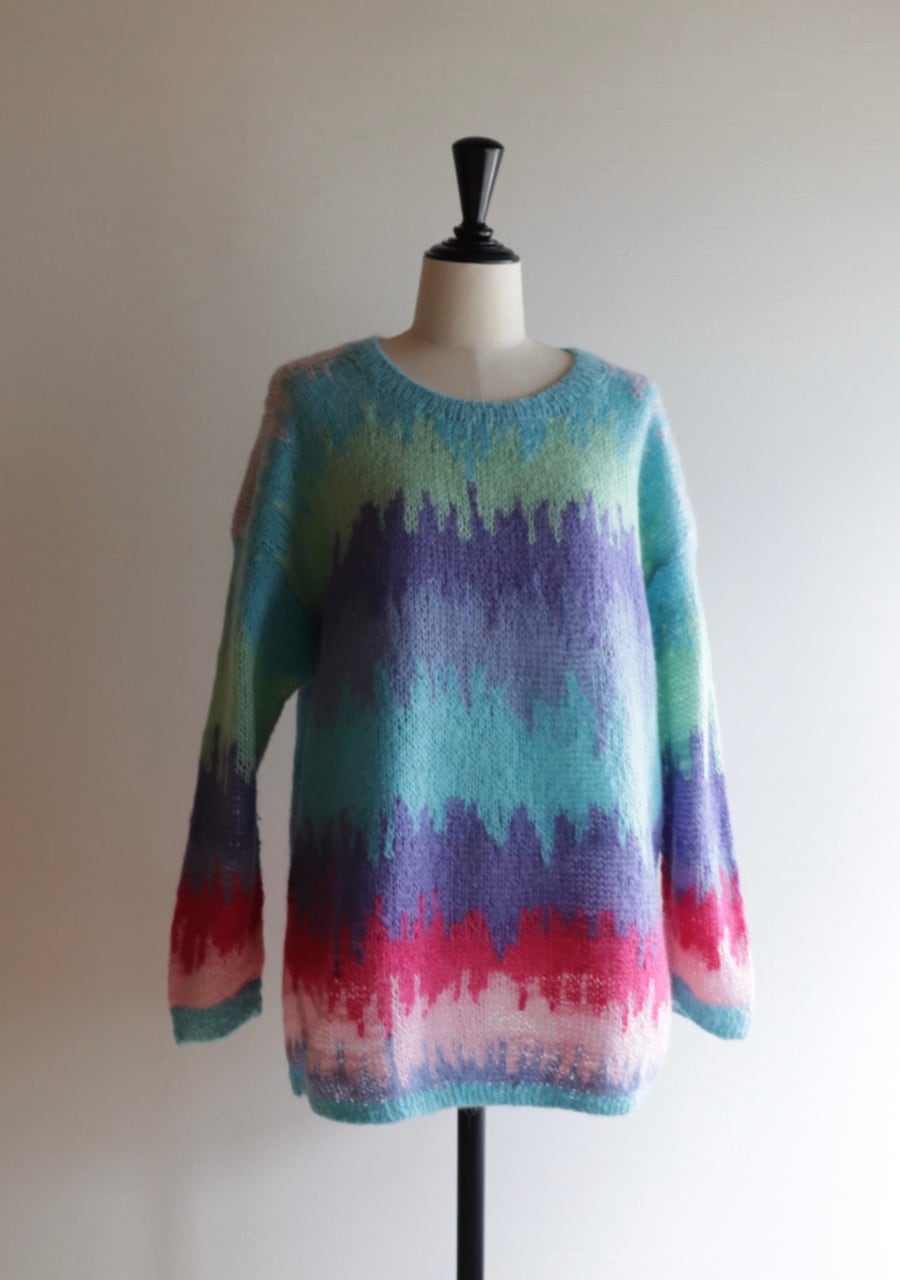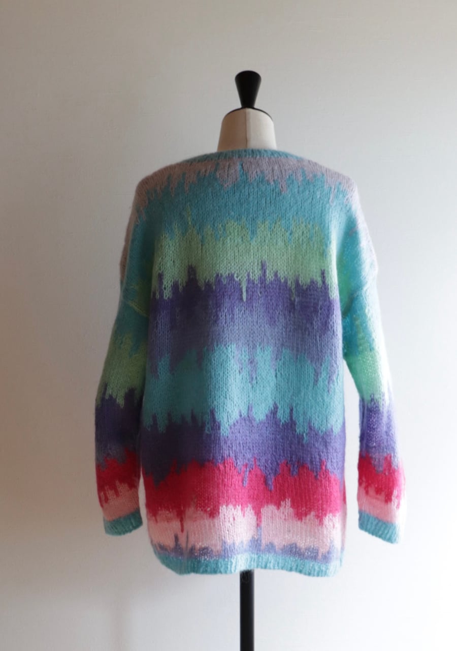 カラフルな配色が可愛いハンドニット。やや薄手で軽くとても暖かいニット。159cm着用でお尻が隠れる丈感。デニムやスカートとも相性良し。ポップなカラーで気分も良し。スタイリングの主役になるニットです。