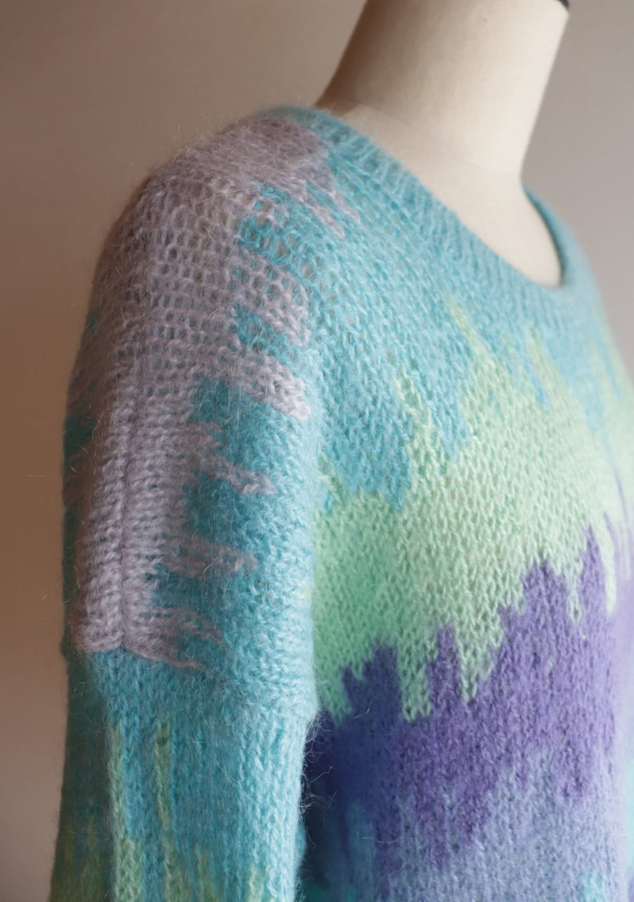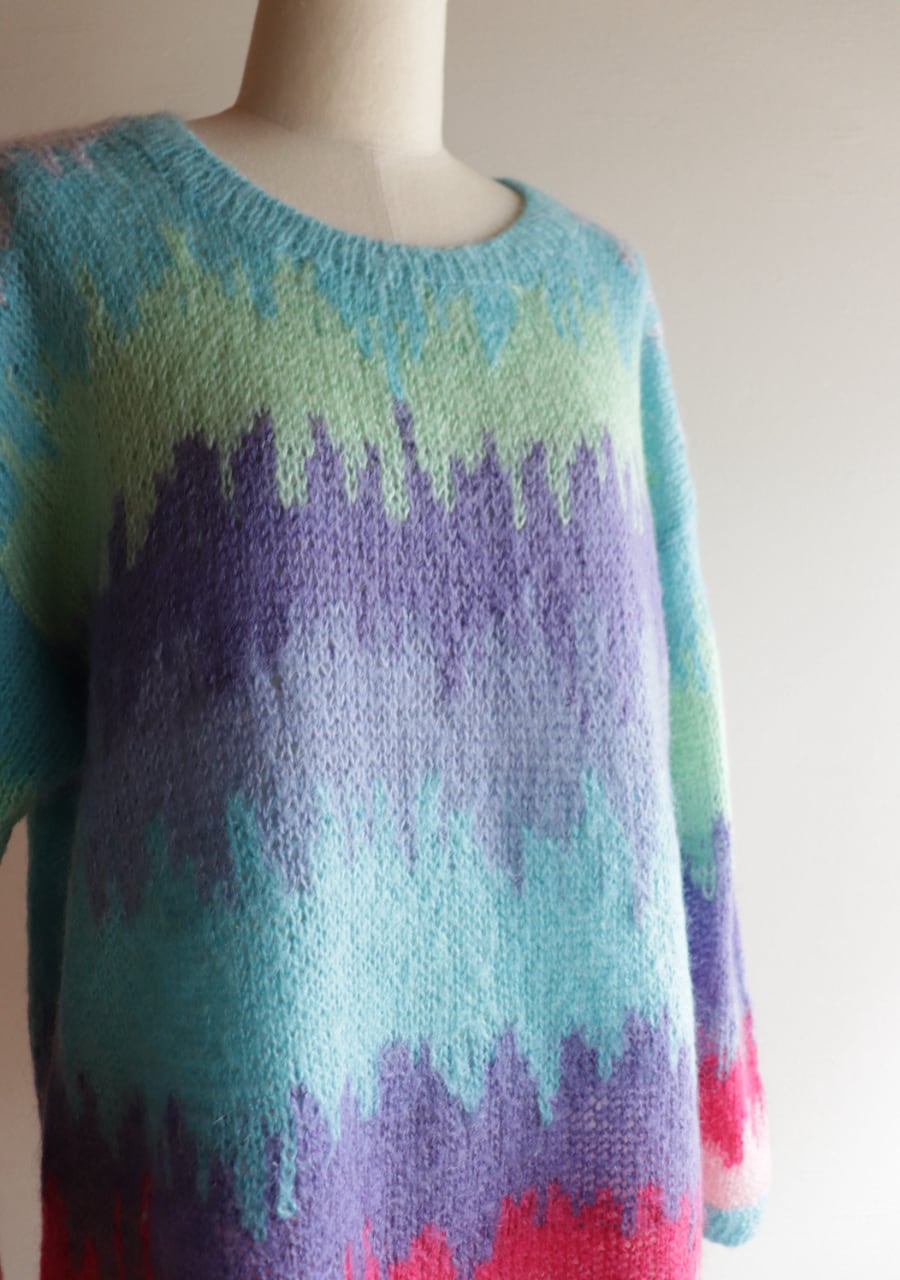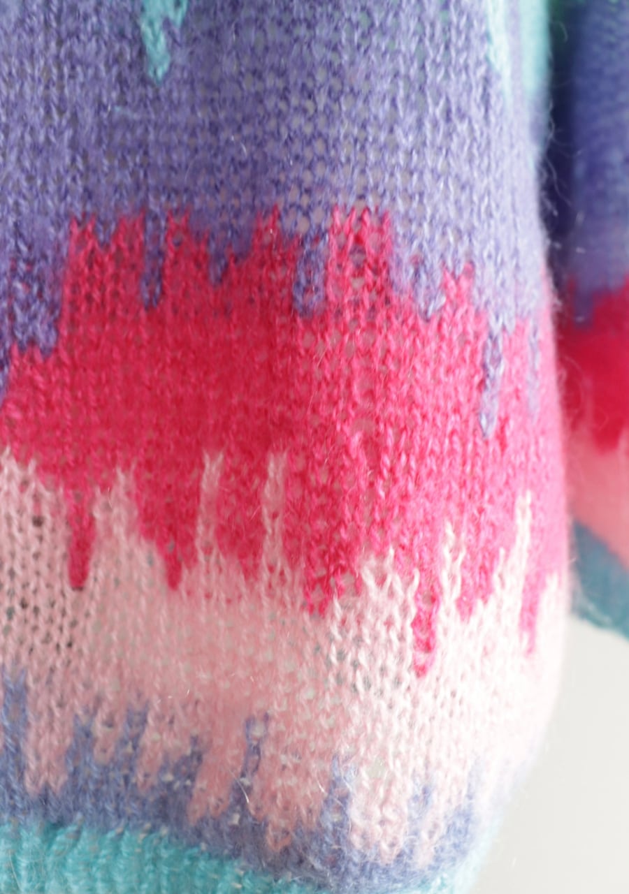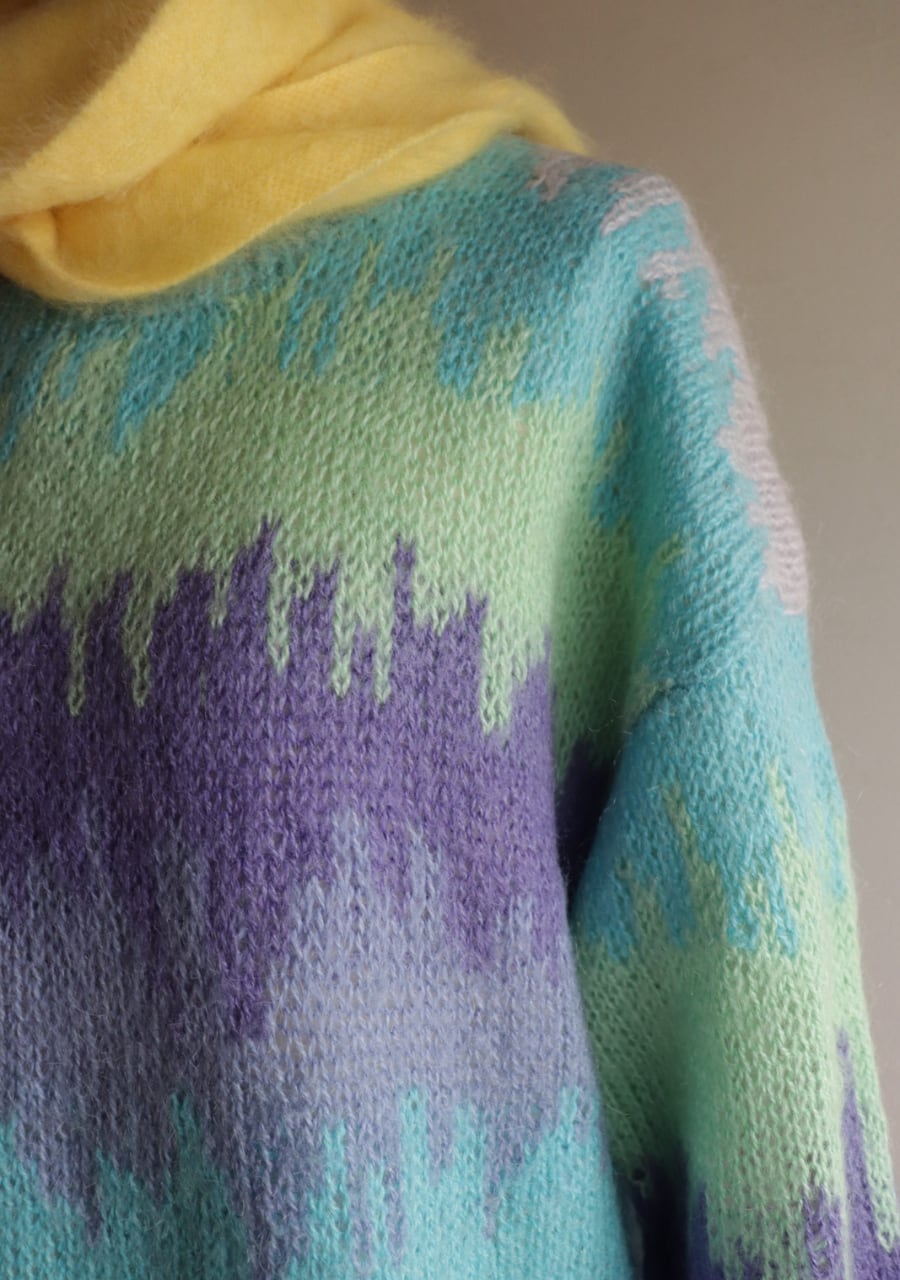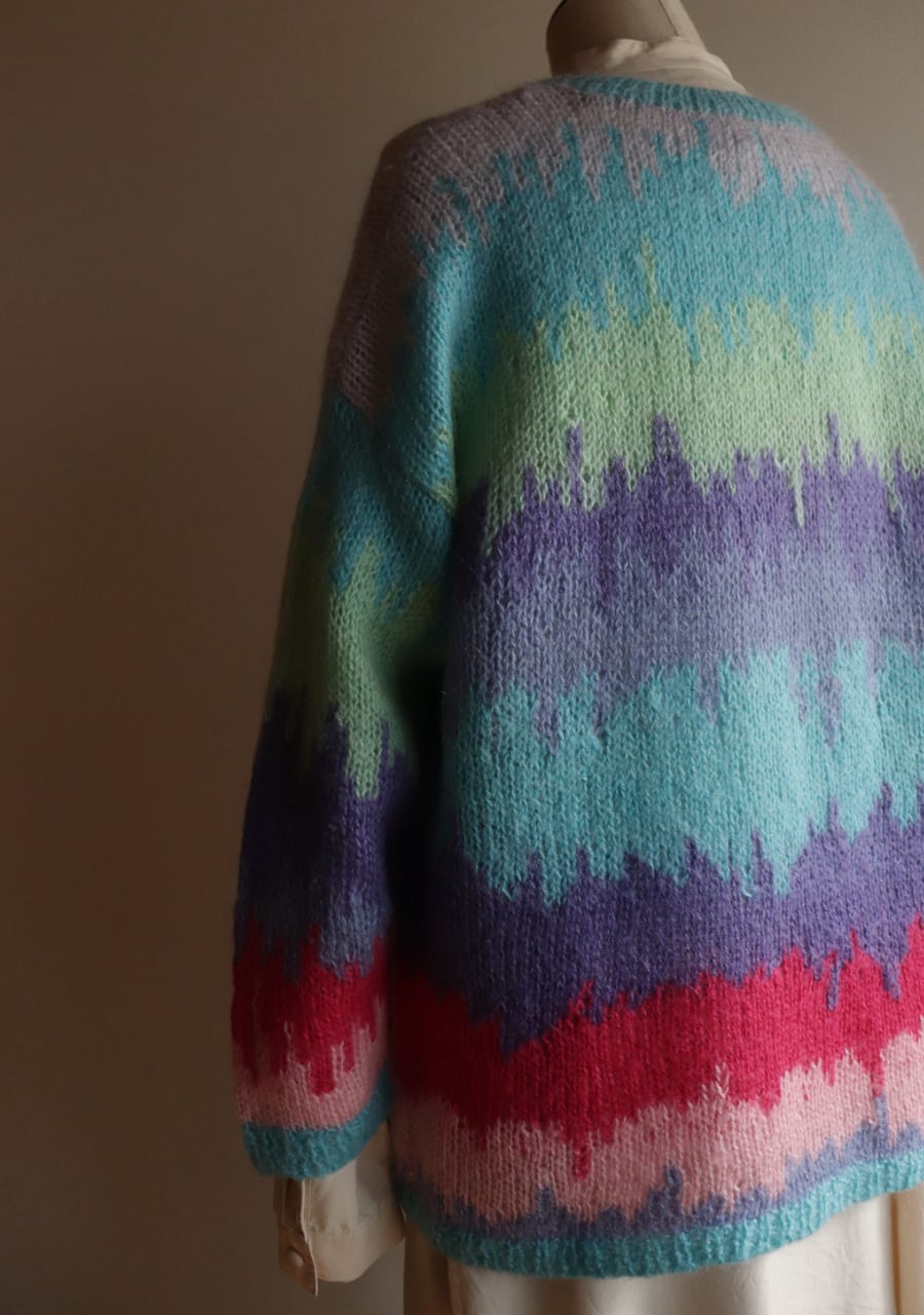 カラフルな配色が可愛いハンドニット。やや薄手で軽くとても暖かいニット。159cm着用でお尻が隠れる丈感。デニムやスカートとも相性良し。ポップなカラーで気分も良し。スタイリングの主役になるニットです。