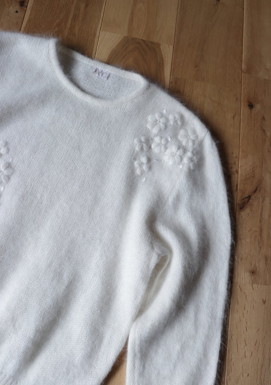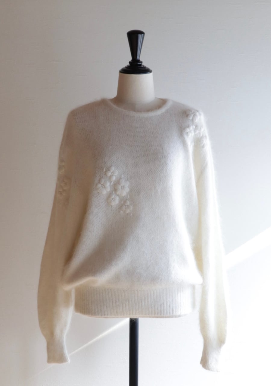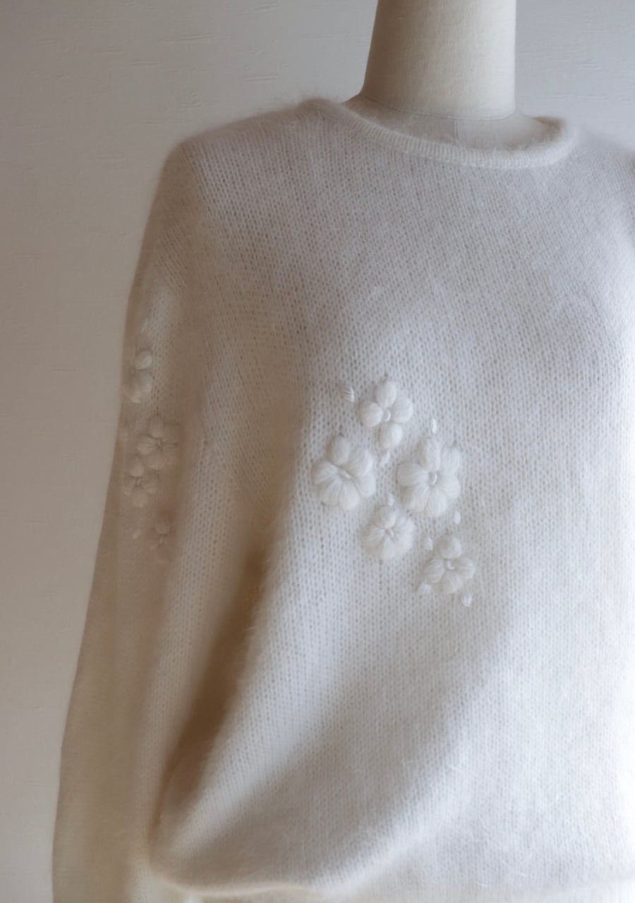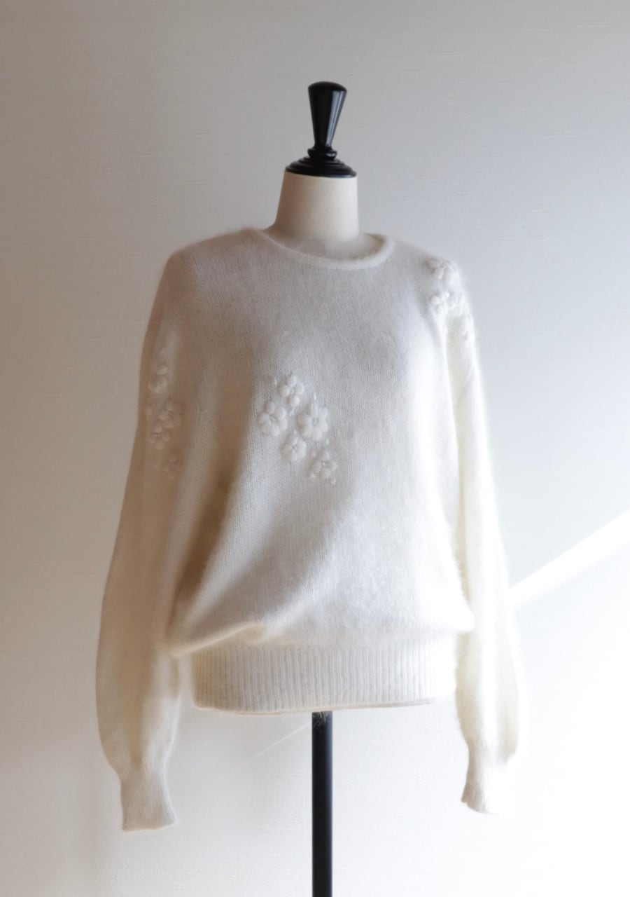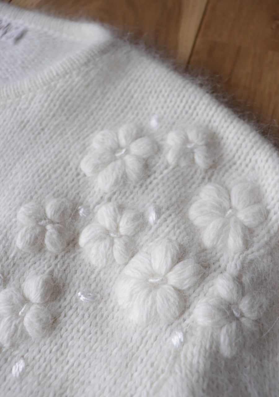ふんわりとした糸で編まれた伸縮性があり柔らかく暖かいニット。肩や腕、フロントに編まれた花の刺繍は同色のホワイトでふんわりしたボディと相まってとても可愛く女性らしい印象。ガーリーなシャツと合わせても可愛いし、ボトムスはメンズライクなパンツと合わせても素敵です。サイズ感も良くて春先まで活躍してくれるアイテム。