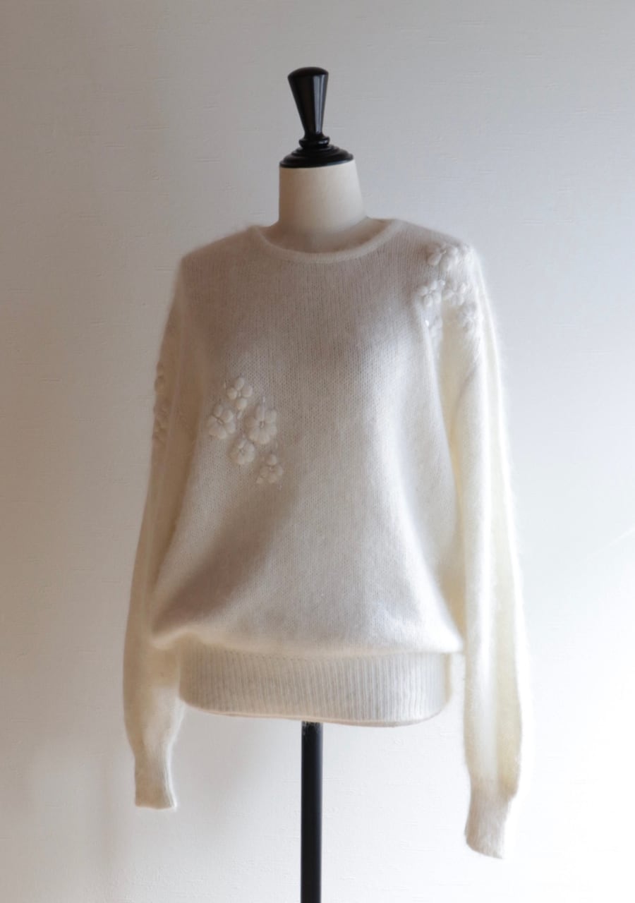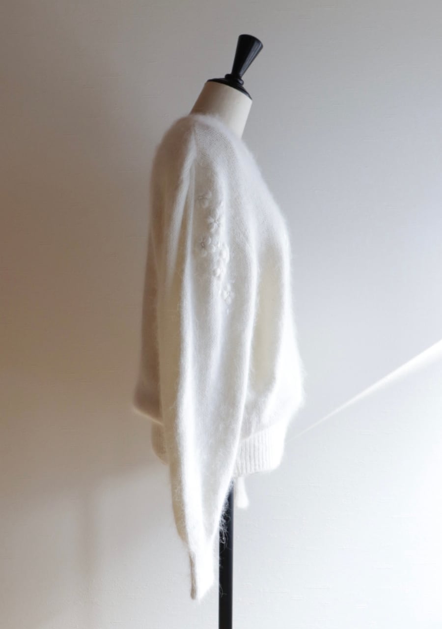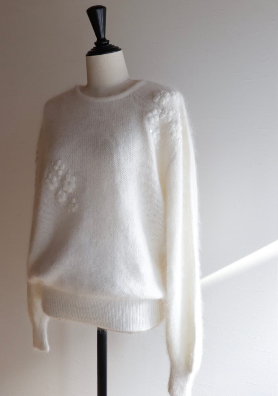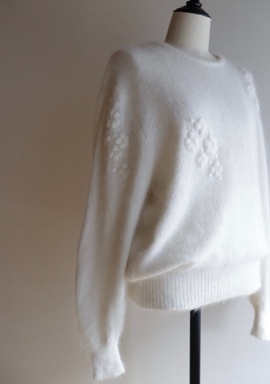 ふんわりとした糸で編まれた伸縮性があり柔らかく暖かいニット。肩や腕、フロントに編まれた花の刺繍は同色のホワイトでふんわりしたボディと相まってとても可愛く女性らしい印象。ガーリーなシャツと合わせても可愛いし、ボトムスはメンズライクなパンツと合わせても素敵です。サイズ感も良くて春先まで活躍してくれるアイテム。