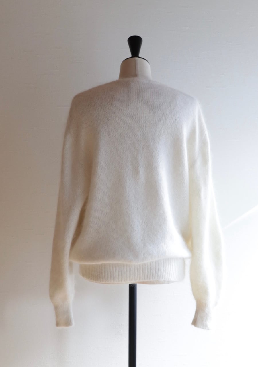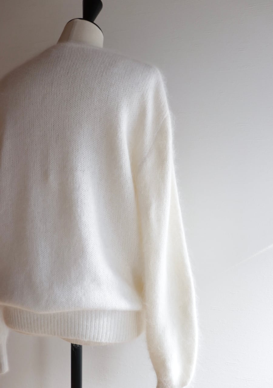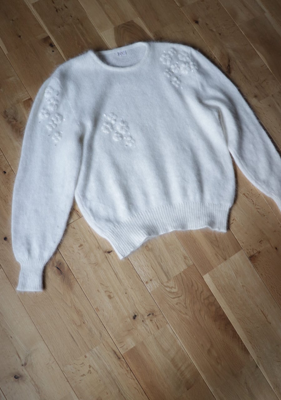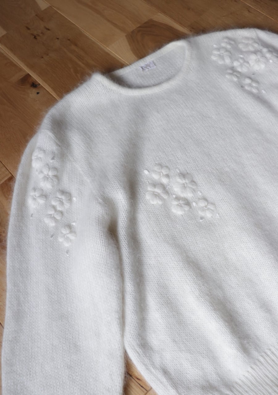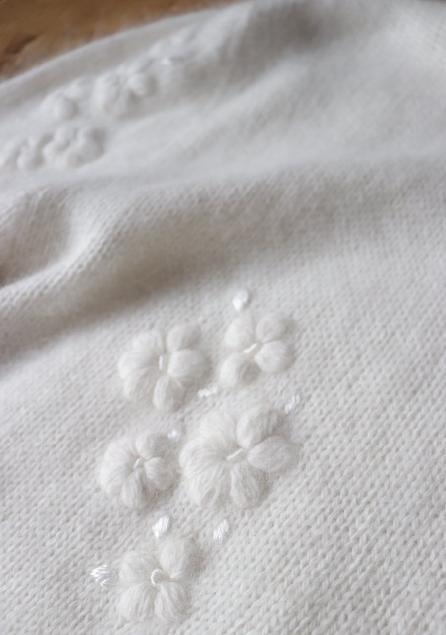 ふんわりとした糸で編まれた伸縮性があり柔らかく暖かいニット。肩や腕、フロントに編まれた花の刺繍は同色のホワイトでふんわりしたボディと相まってとても可愛く女性らしい印象。ガーリーなシャツと合わせても可愛いし、ボトムスはメンズライクなパンツと合わせても素敵です。サイズ感も良くて春先まで活躍してくれるアイテム。