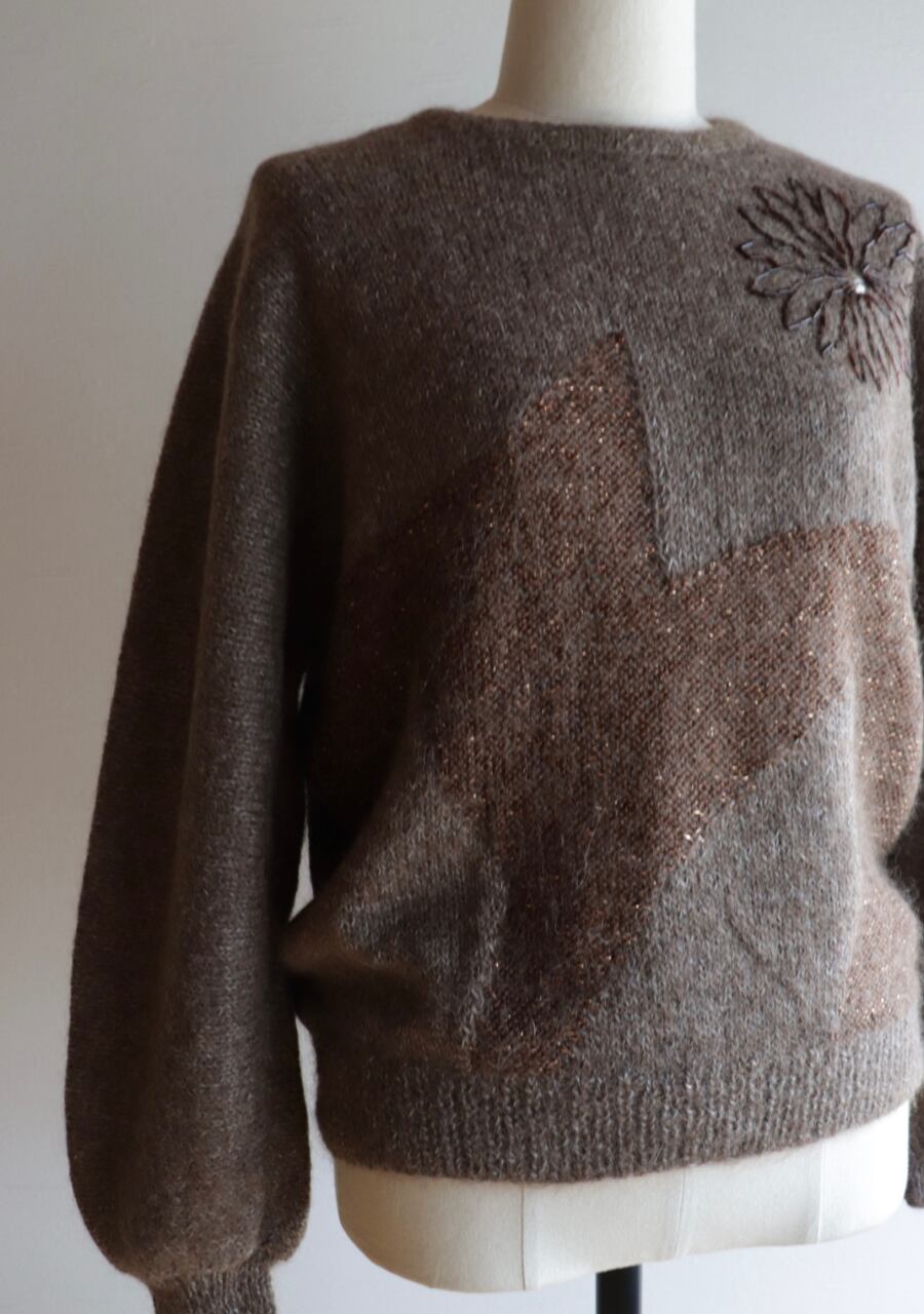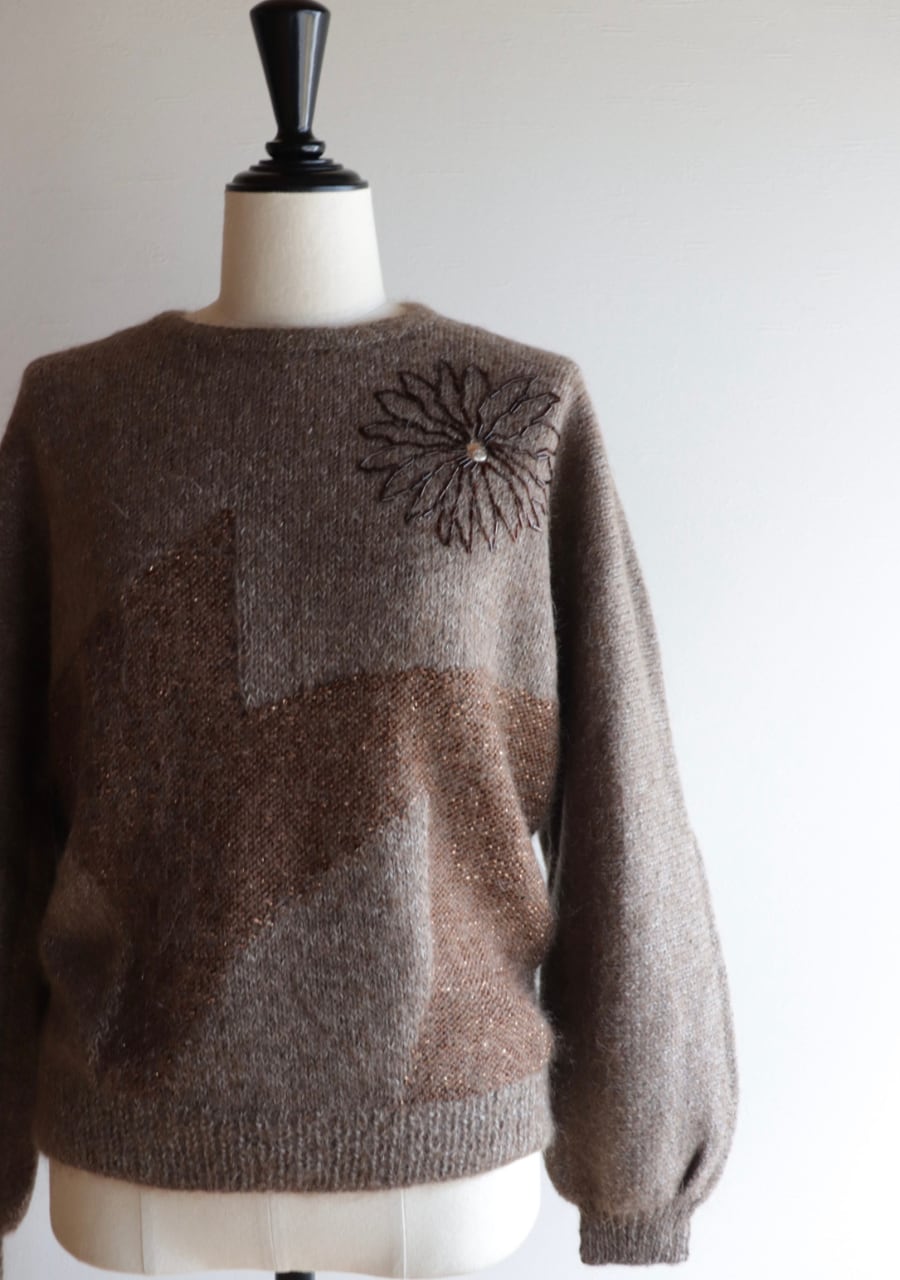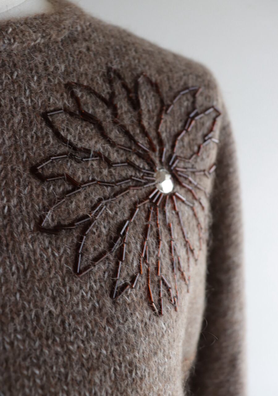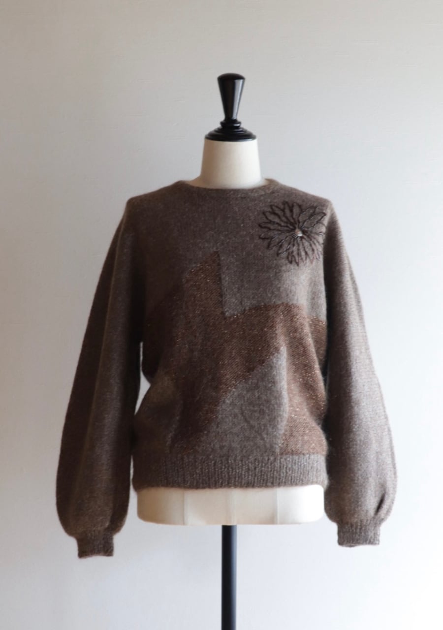 胸元のビーズでつくられた花柄がポイントのニット。やや薄手の柔らかく肌触りの良いニット。程よい腕のパフ感が女性らしく可愛いシルエット。色味も良くて素敵です。首元がやや締まったデザイン。着用した時の首元に窮屈感は感じませんが、着脱時に首の開きの少ないものとなりますので頭を通す際、窮屈を感じるサイズ感ではあります。