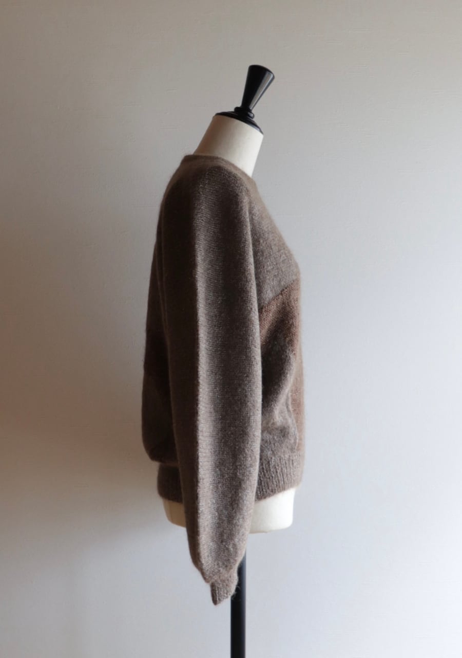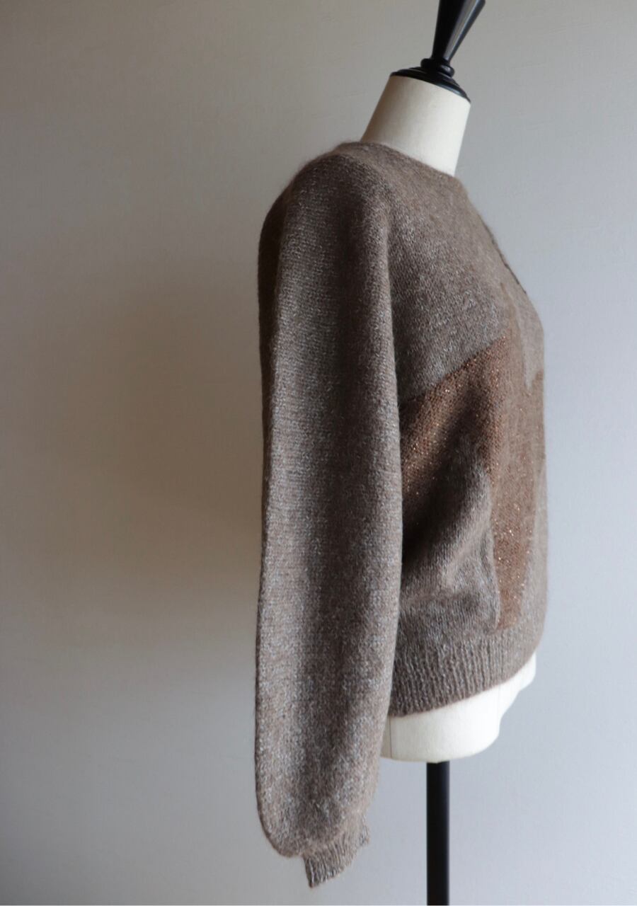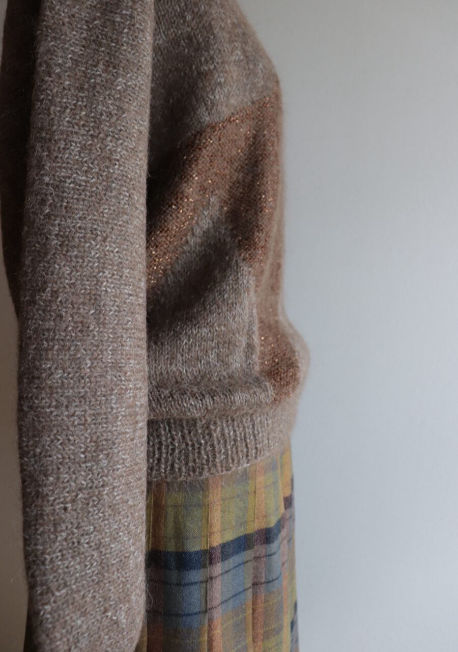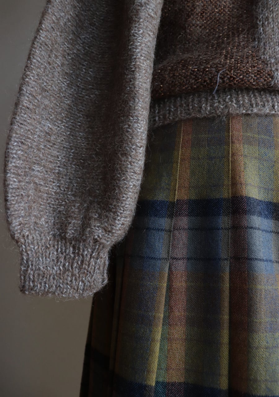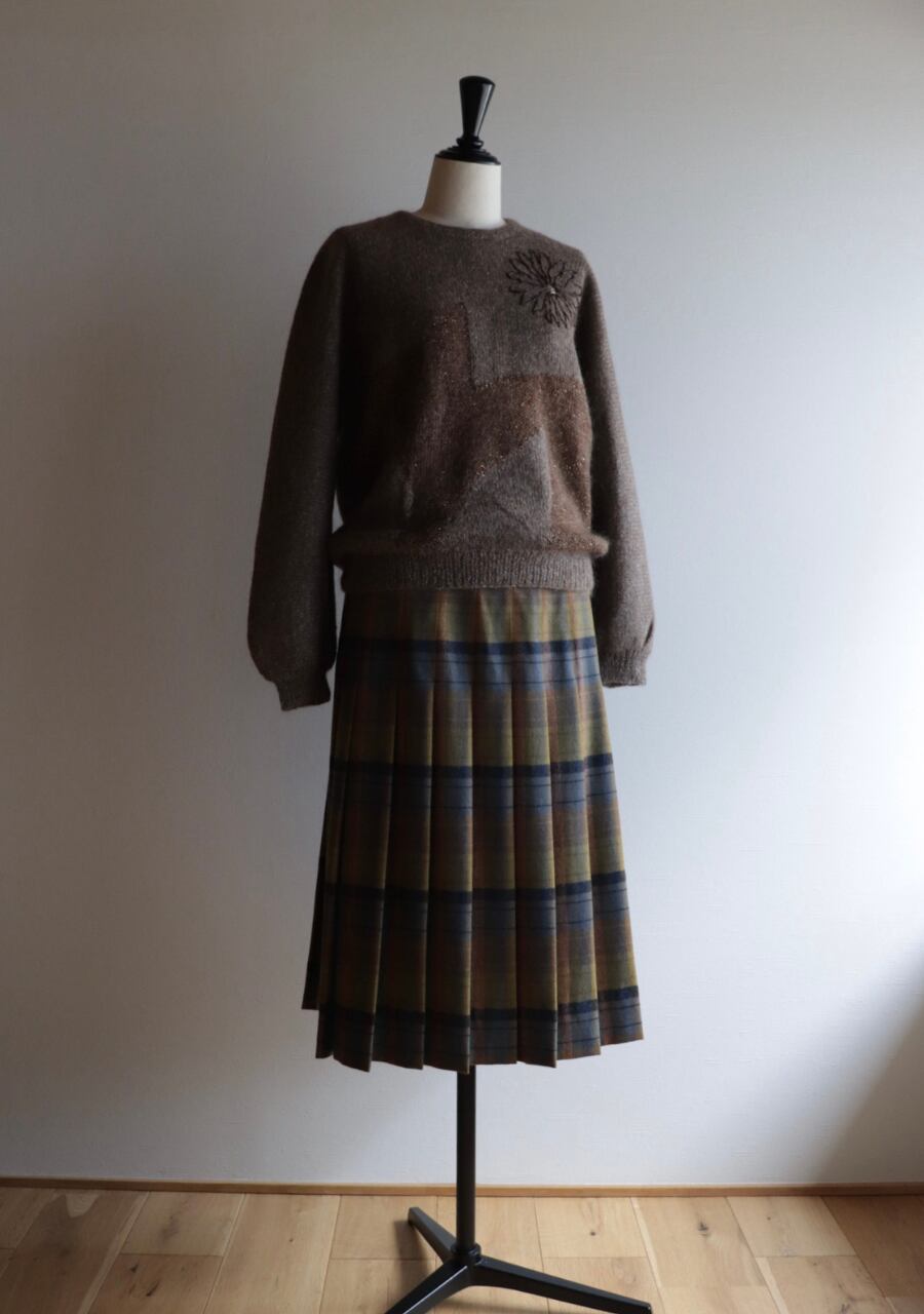胸元のビーズでつくられた花柄がポイントのニット。やや薄手の柔らかく肌触りの良いニット。程よい腕のパフ感が女性らしく可愛いシルエット。色味も良くて素敵です。首元がやや締まったデザイン。着用した時の首元に窮屈感は感じませんが、着脱時に首の開きの少ないものとなりますので頭を通す際、窮屈を感じるサイズ感ではあります。