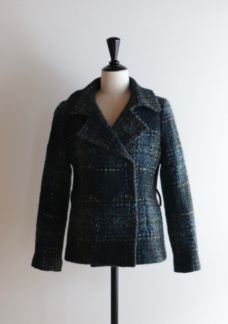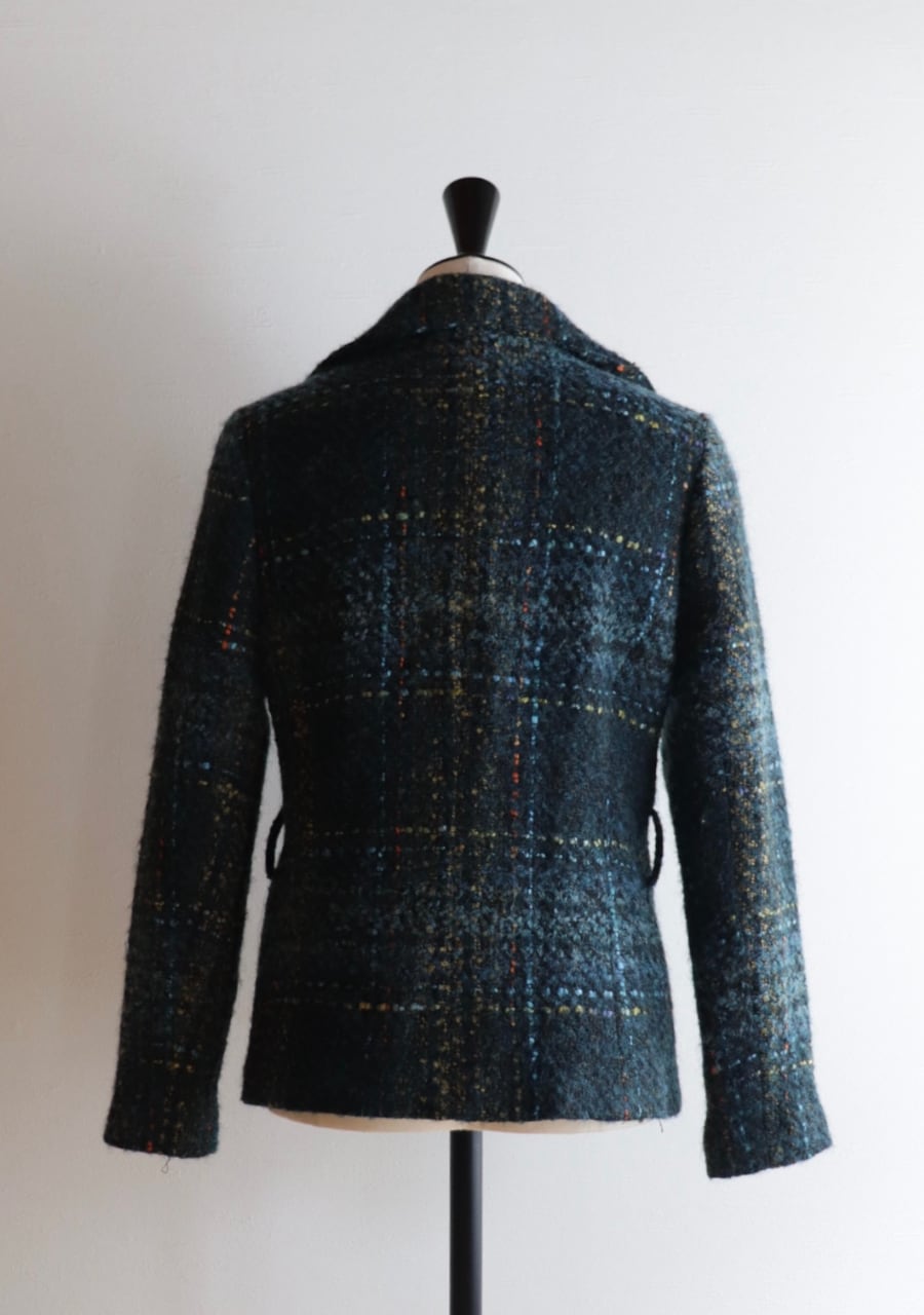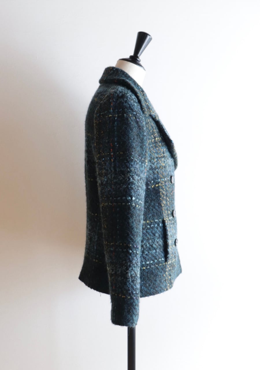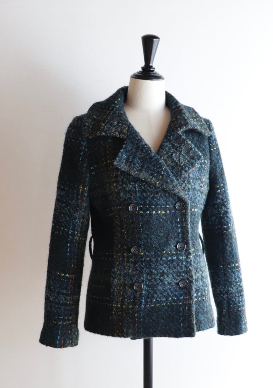 ウールの生地の温かみある素材感。やや薄手でコンパクト。軽くて伸縮性があり体にフィットするジャケットでとても動きやすい!。色味とチェックが可愛い。開けても閉めても女性らしいシルエット。暖かくてかわいい。フロントに両サイドにポケットありです。