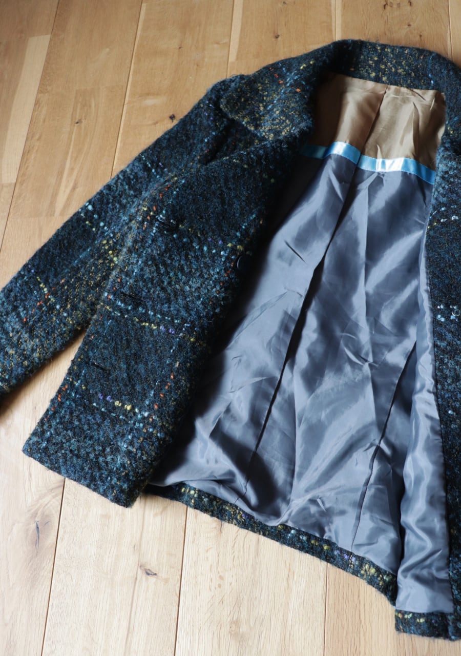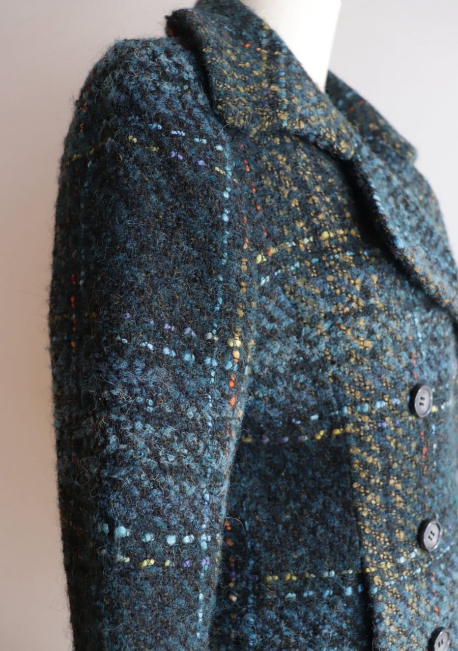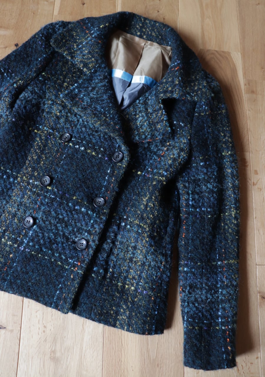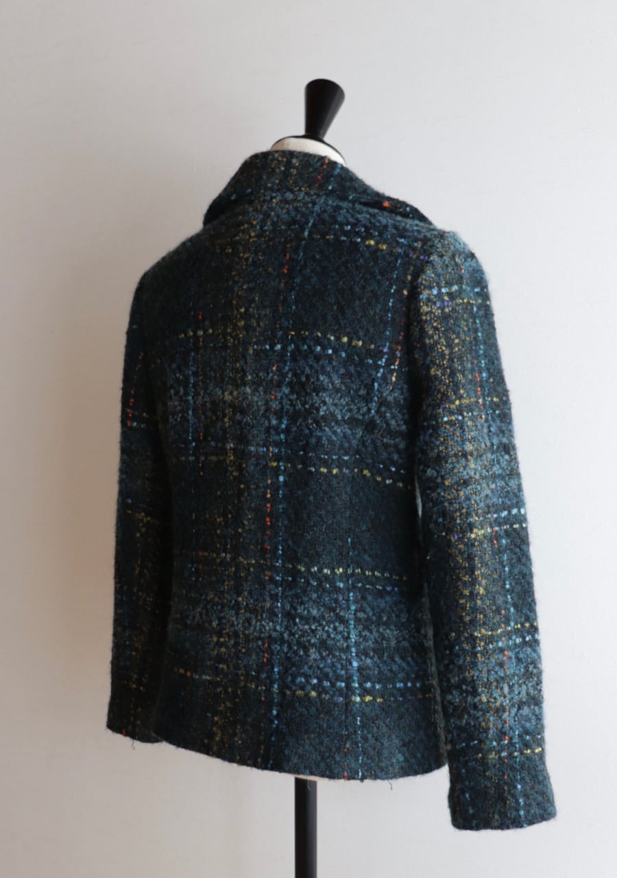 ウールの生地の温かみある素材感。やや薄手でコンパクト。軽くて伸縮性があり体にフィットするジャケットでとても動きやすい!。色味とチェックが可愛い。開けても閉めても女性らしいシルエット。暖かくてかわいい。フロントに両サイドにポケットありです。