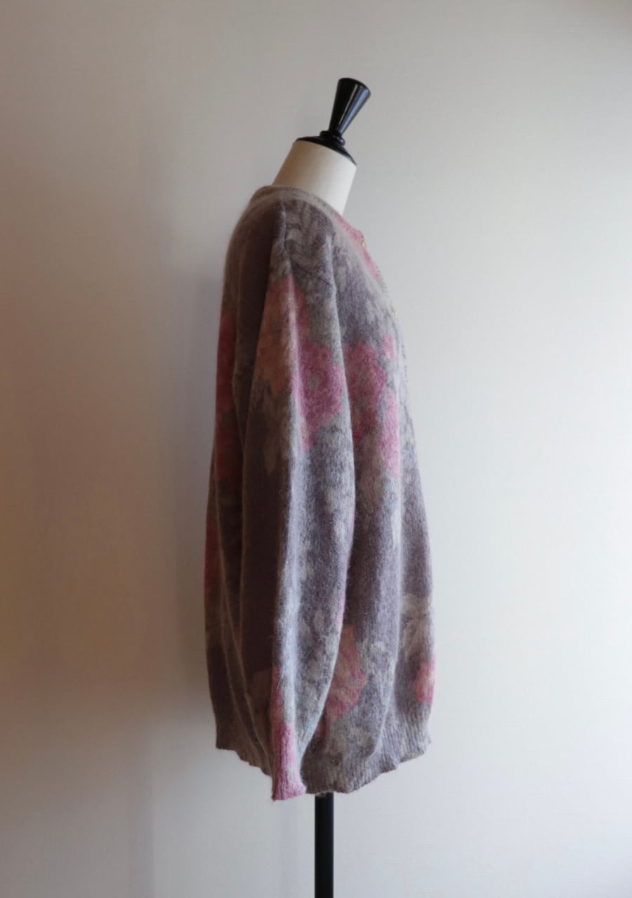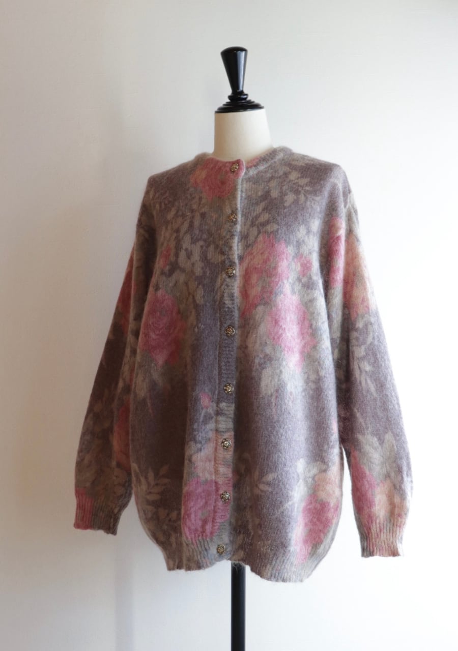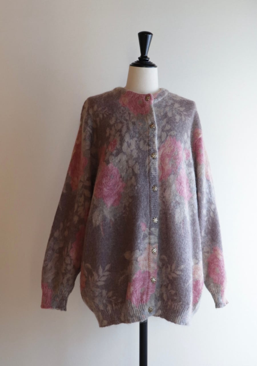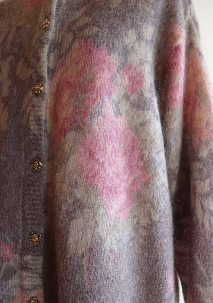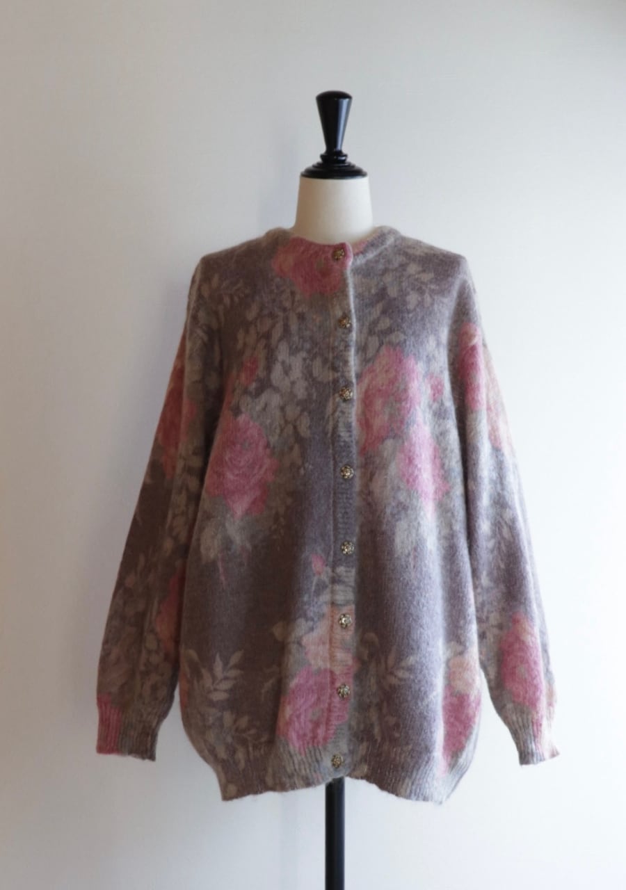 優しいブラウンベージュに花柄プリントされたニットカーディガン。大振りの花柄が個性的なのに柔しい色味とモヘア混の素材感が優しくナチュラルに見えて可愛い。大きめのサイズ感で159cm着用でお尻がすっぽりと隠れる丈に太目の袖、首元もボタンを一つ開けて着用してもスッキリととても癒されるシルエット。ゴールドのボタンもアクセントに。