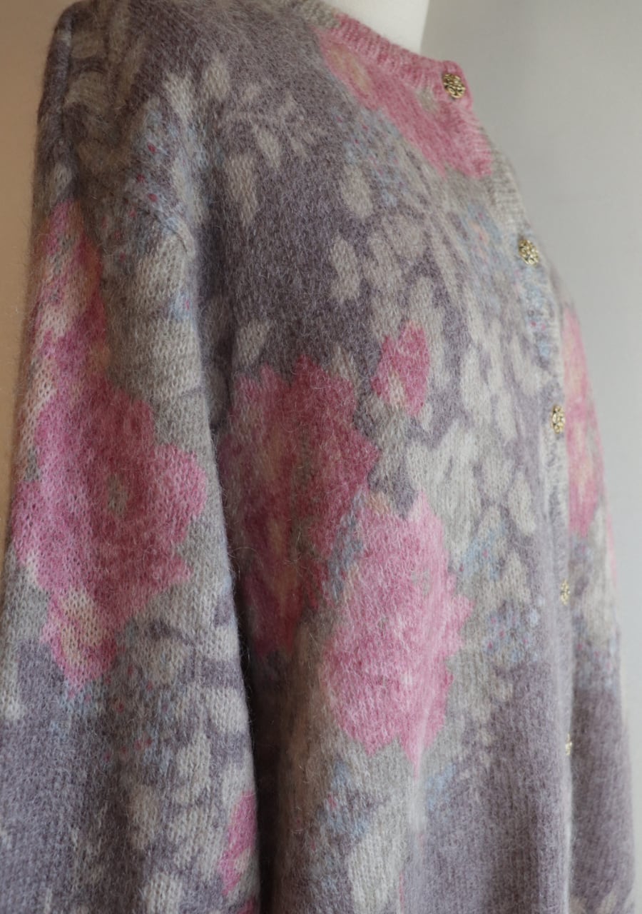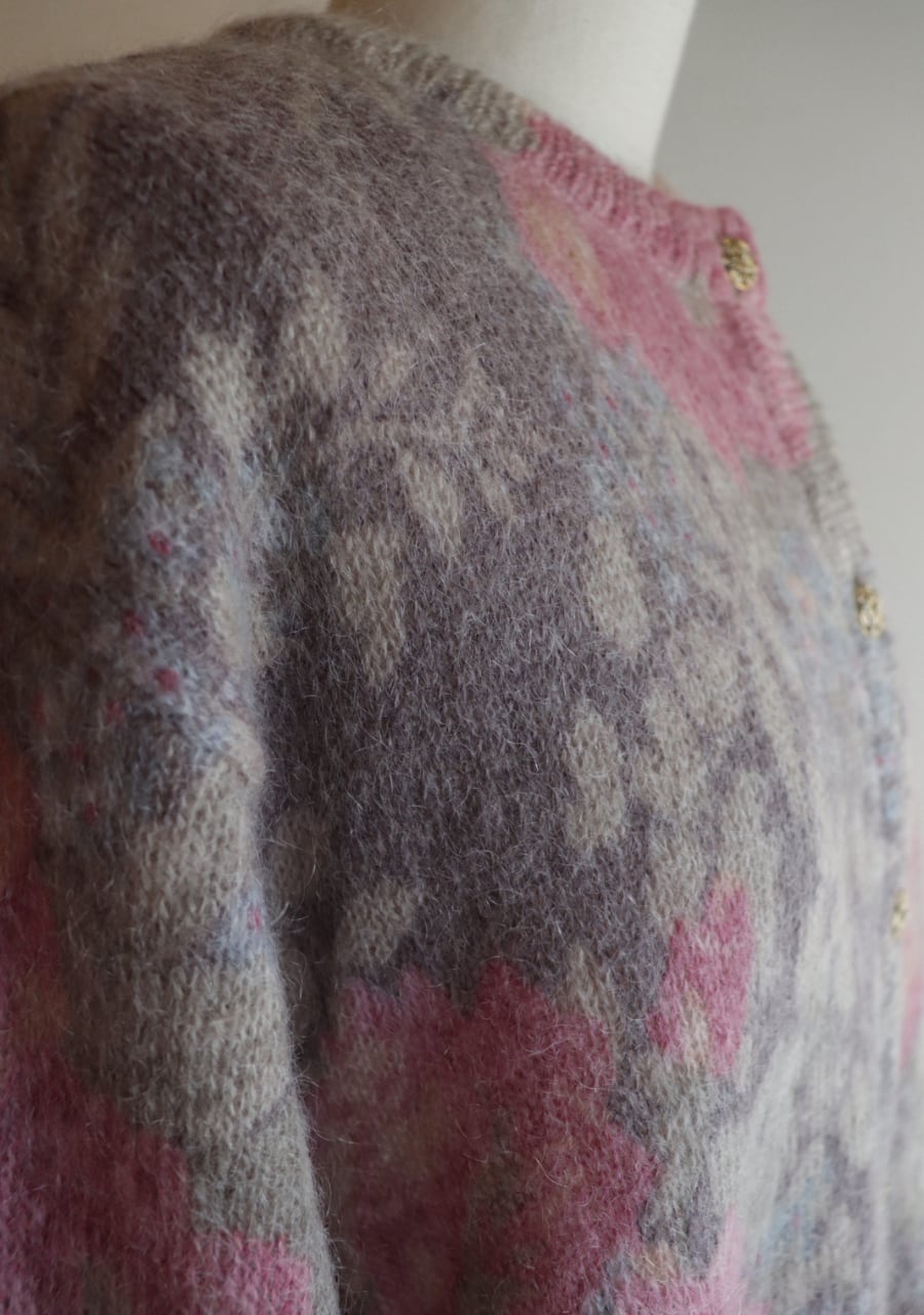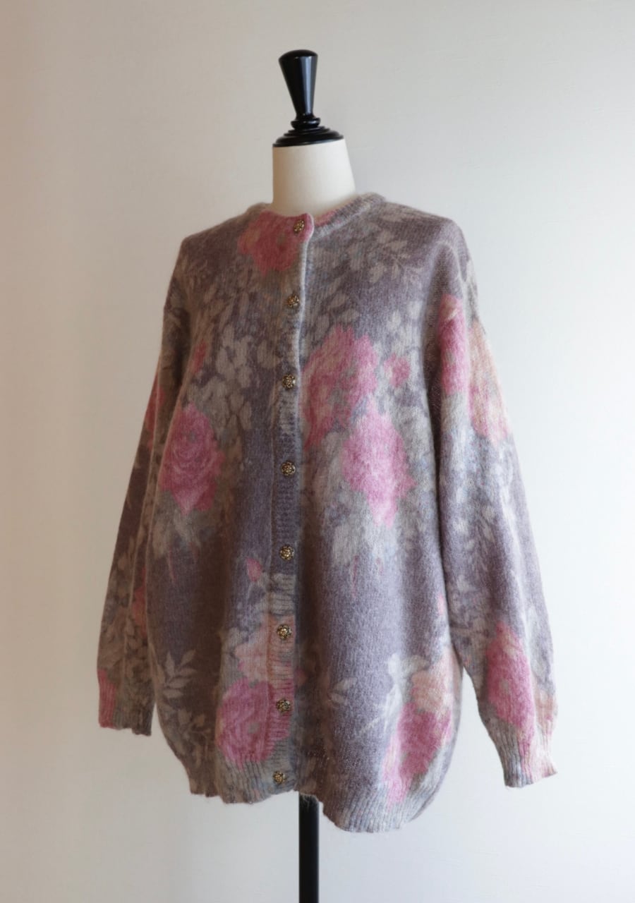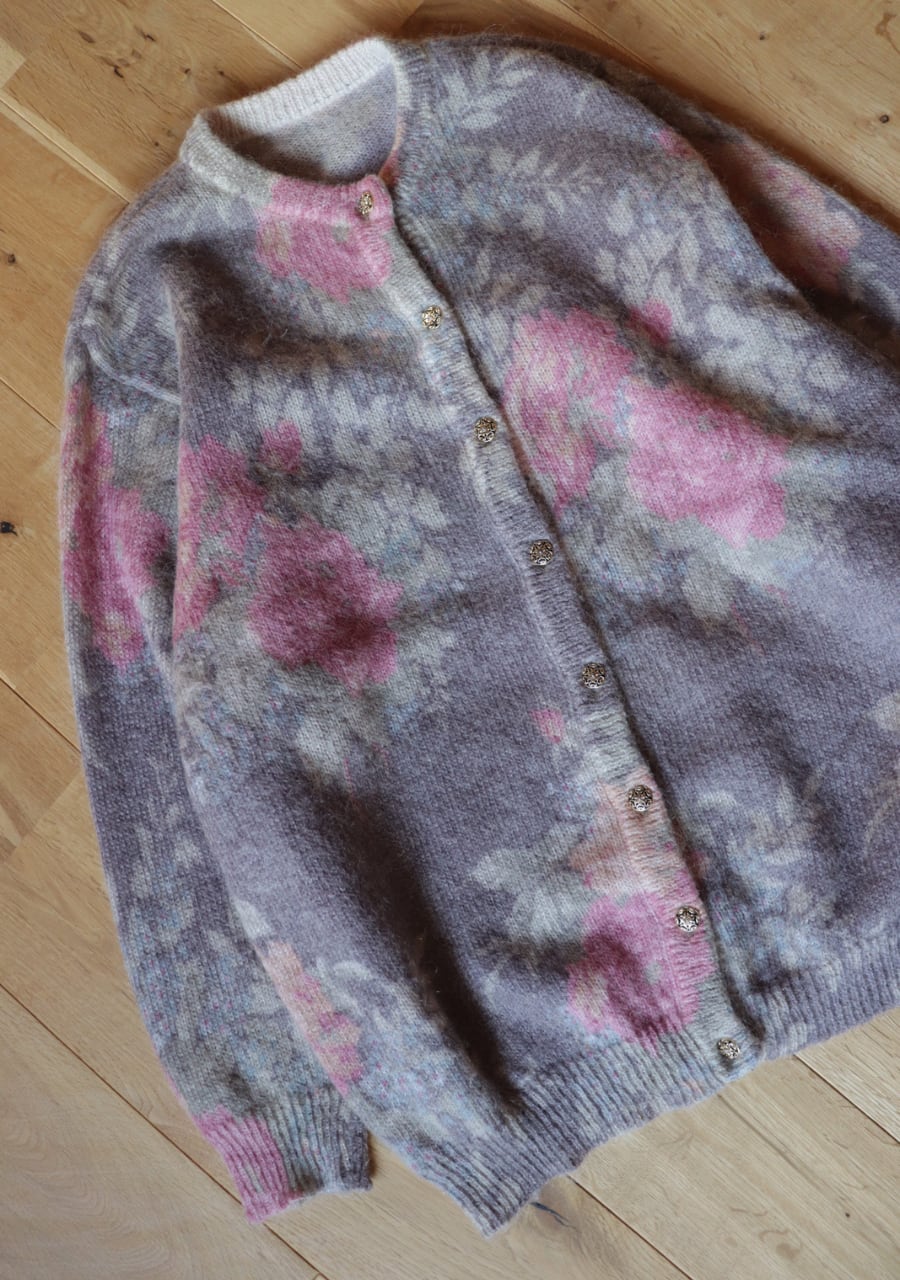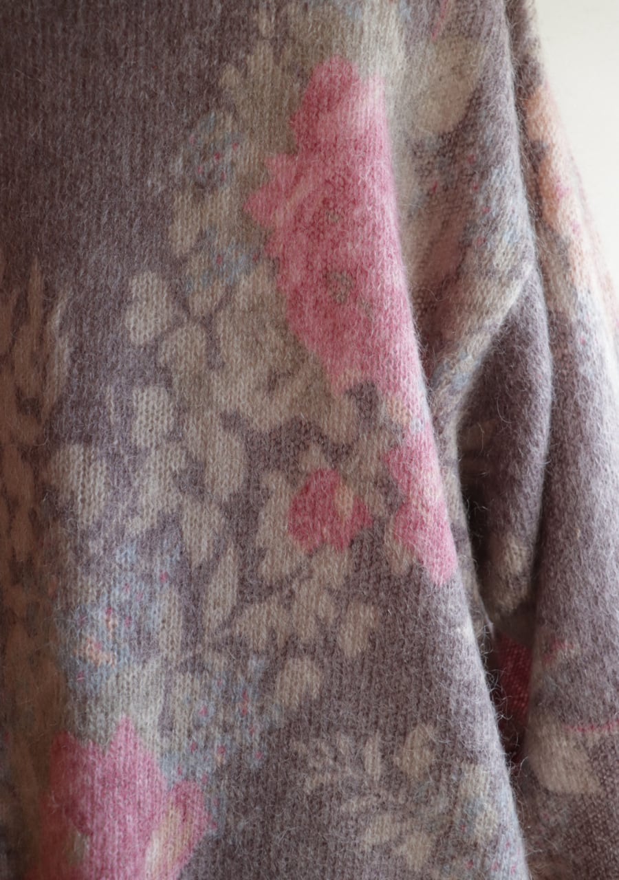 優しいブラウンベージュに花柄プリントされたニットカーディガン。大振りの花柄が個性的なのに柔しい色味とモヘア混の素材感が優しくナチュラルに見えて可愛い。大きめのサイズ感で159cm着用でお尻がすっぽりと隠れる丈に太目の袖、首元もボタンを一つ開けて着用してもスッキリととても癒されるシルエット。ゴールドのボタンもアクセントに。