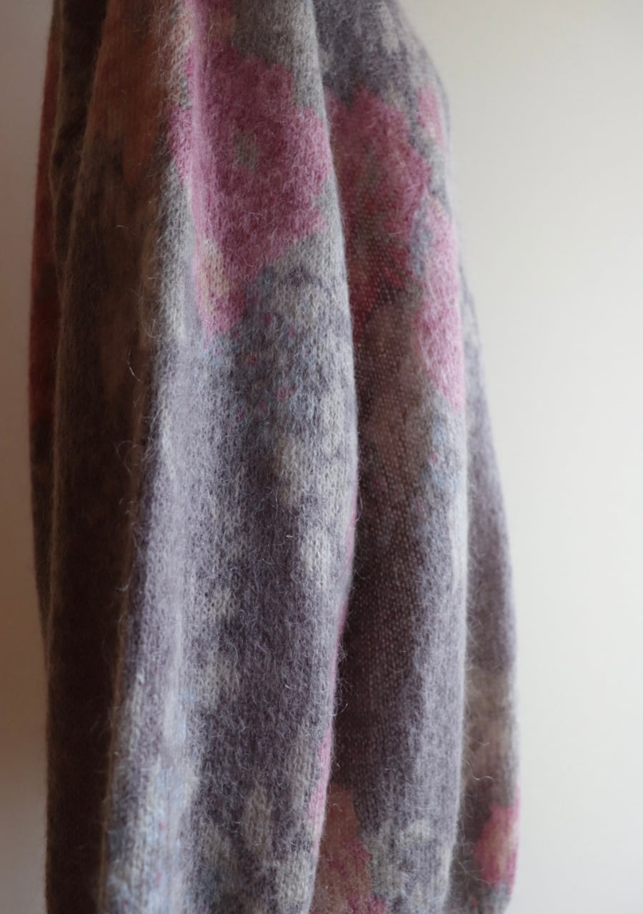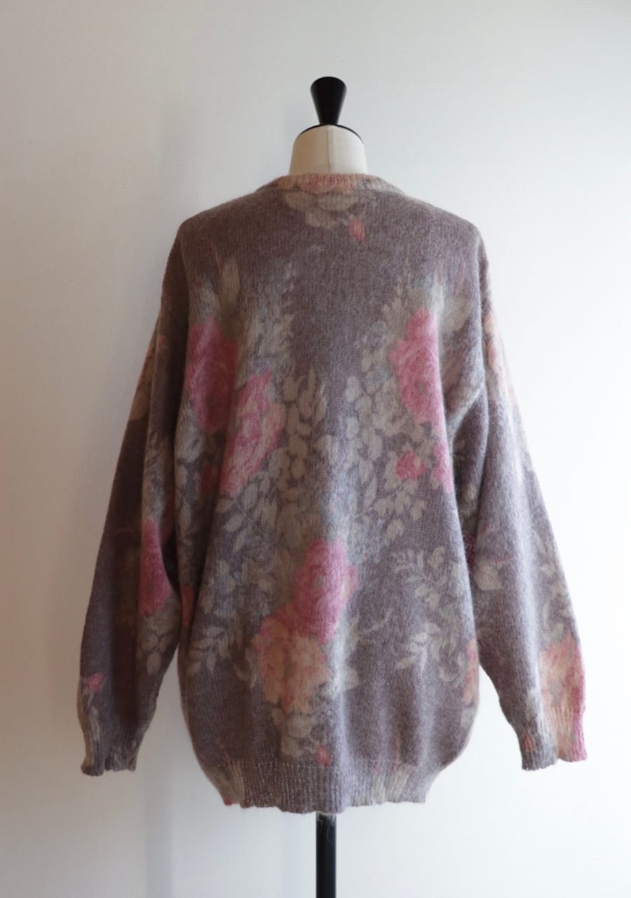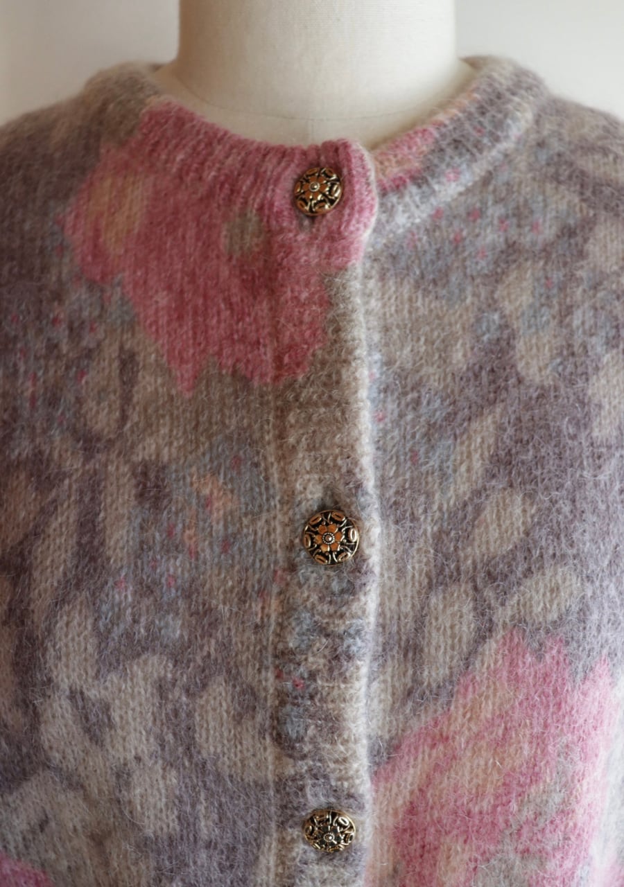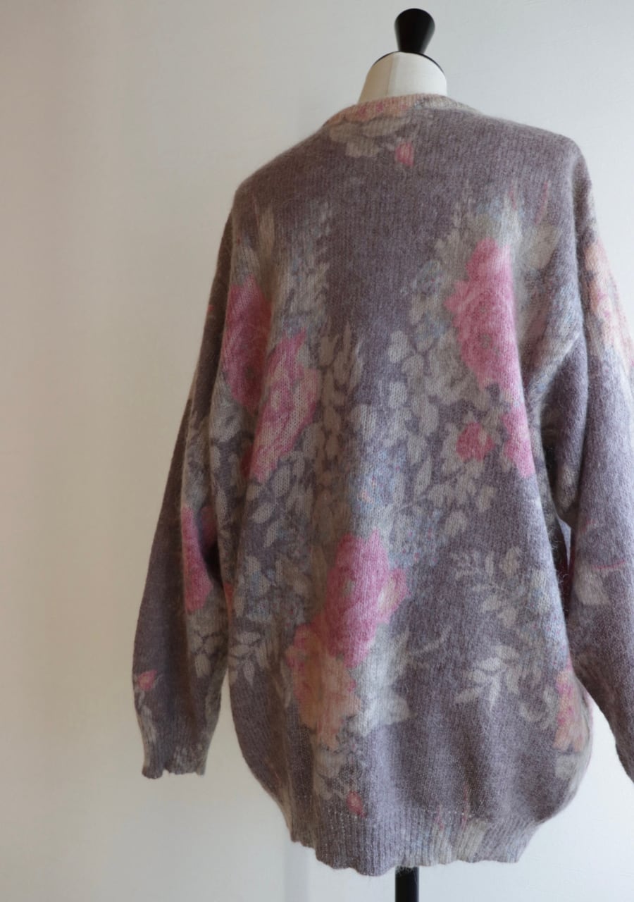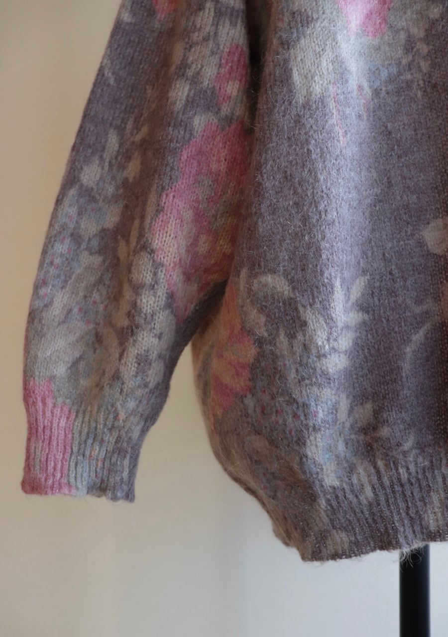 優しいブラウンベージュに花柄プリントされたニットカーディガン。大振りの花柄が個性的なのに柔しい色味とモヘア混の素材感が優しくナチュラルに見えて可愛い。大きめのサイズ感で159cm着用でお尻がすっぽりと隠れる丈に太目の袖、首元もボタンを一つ開けて着用してもスッキリととても癒されるシルエット。ゴールドのボタンもアクセントに。