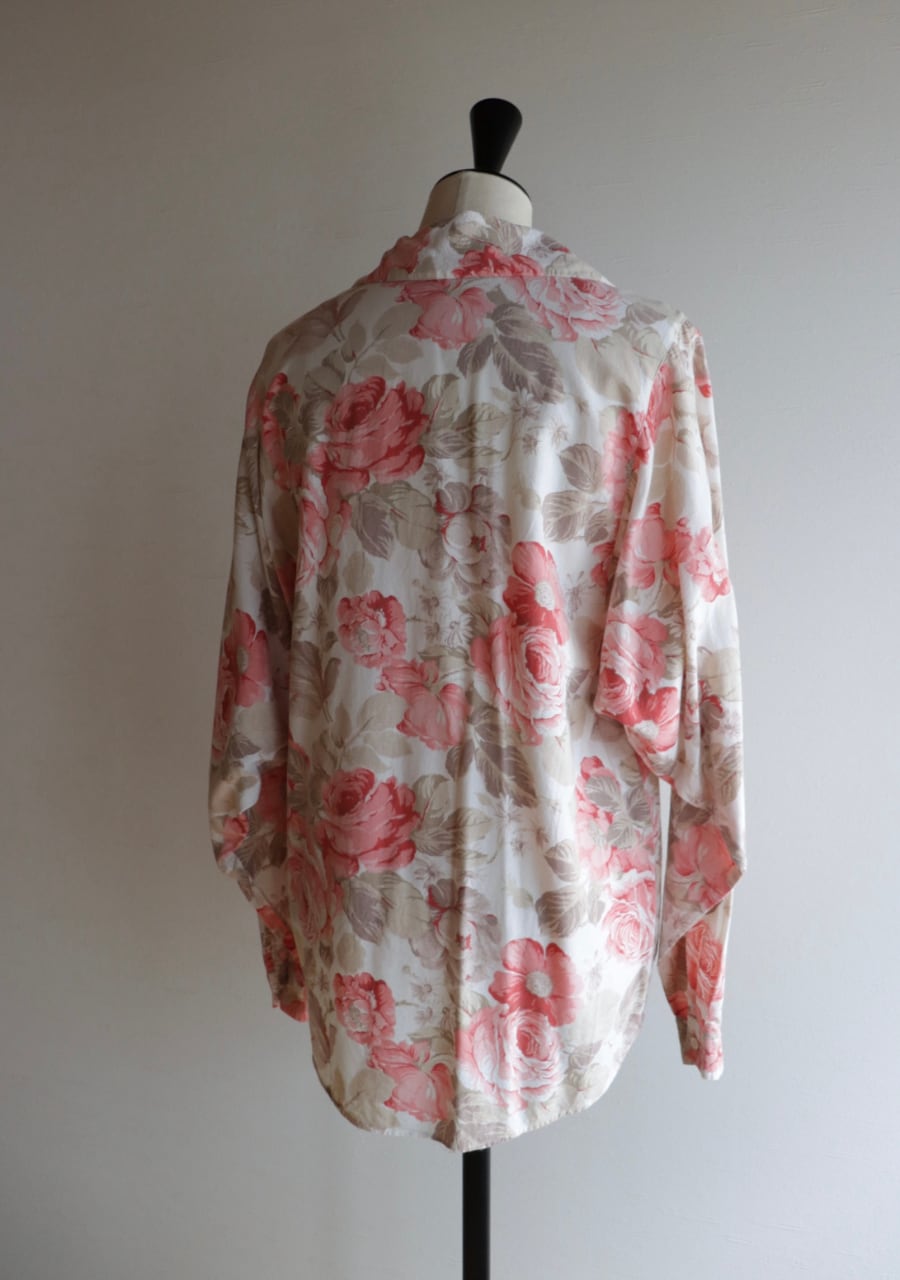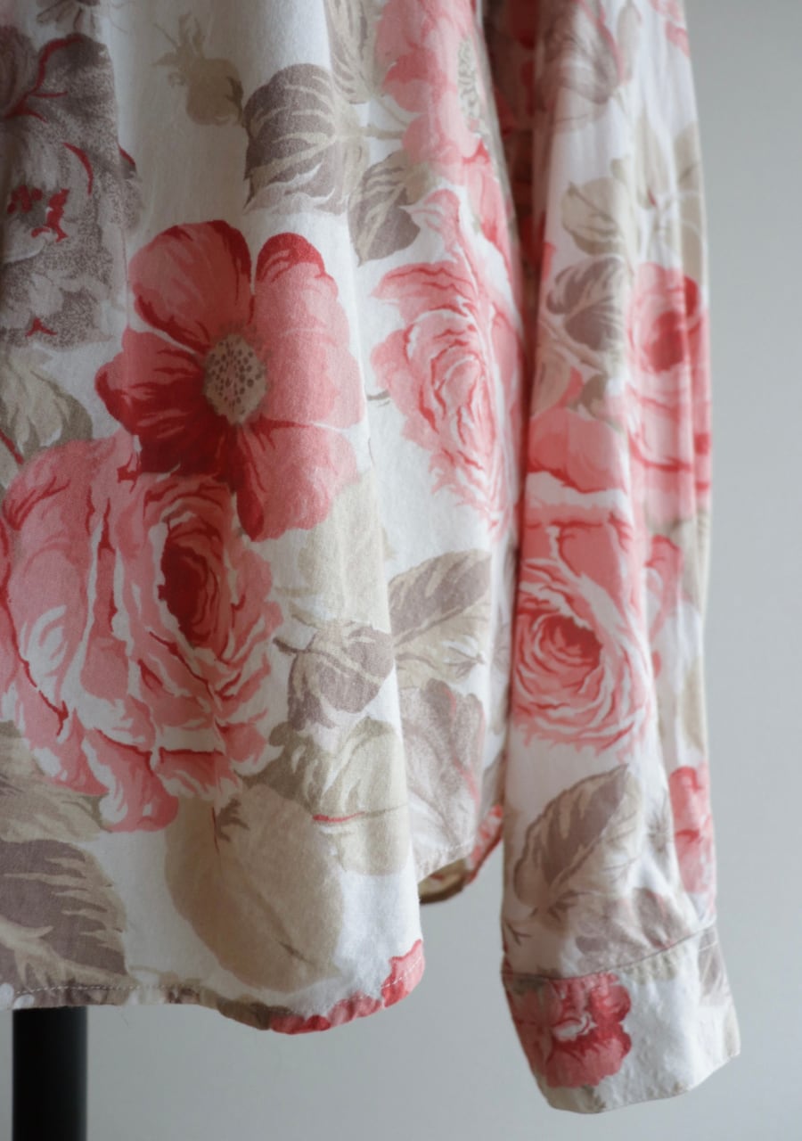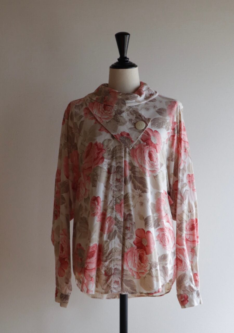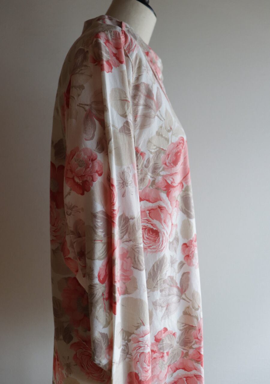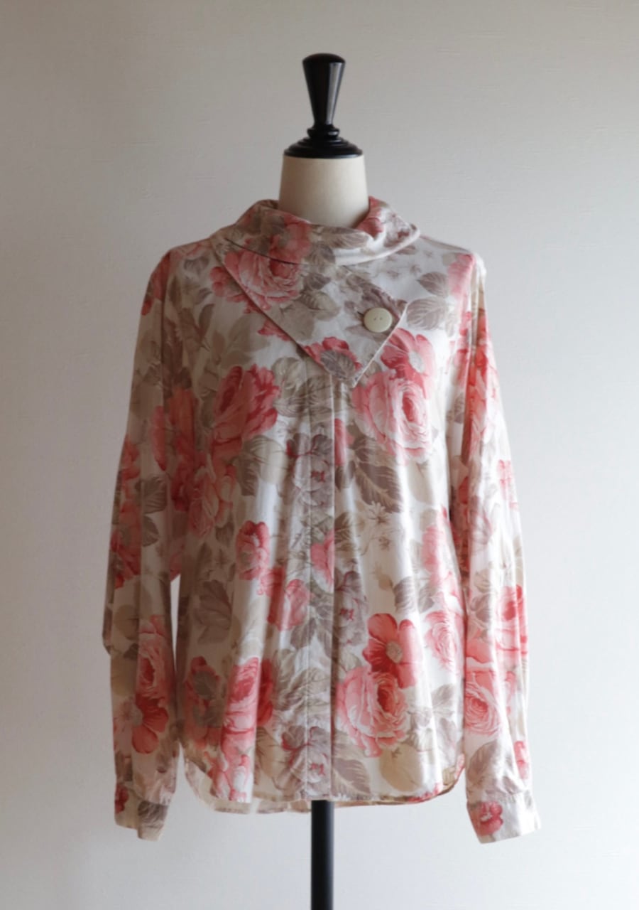 リボンを巻いたような襟元が特徴で全体的にナチュラルで明るい花柄が可愛いブラウス。透け感の無い薄手の生地で柔らかく肌触りの良い生地。身幅は程よくスッキリしているのに腕周りを大きくとり腕を動かしたときのシルエットがとても女性らしく可愛いデザイン。華やかな印象でインナーにとりいれてもアクセントに。一枚でももちろん素敵で春まで活躍してくれるアイテムです。こういうデザインに出会えるのもうれしいおすすめの一着。