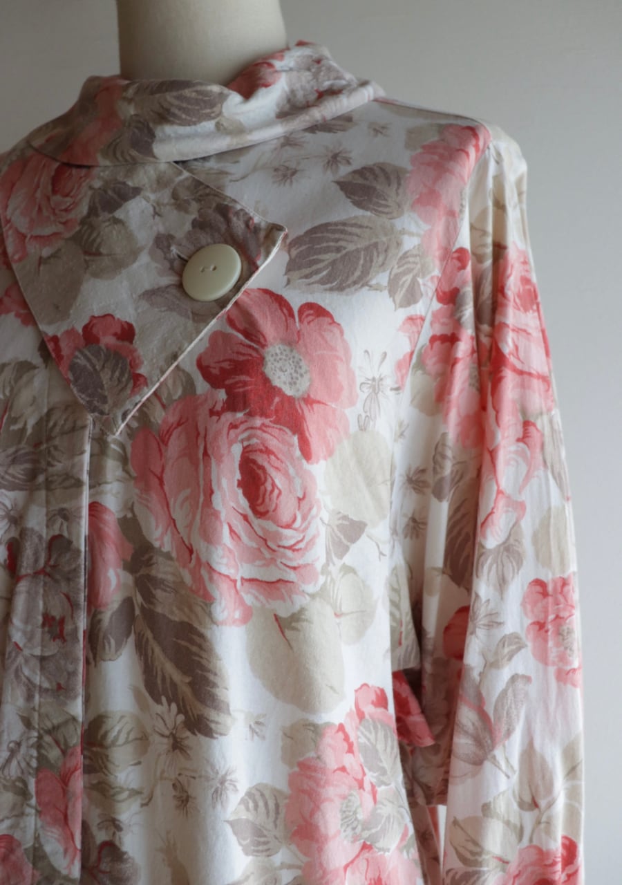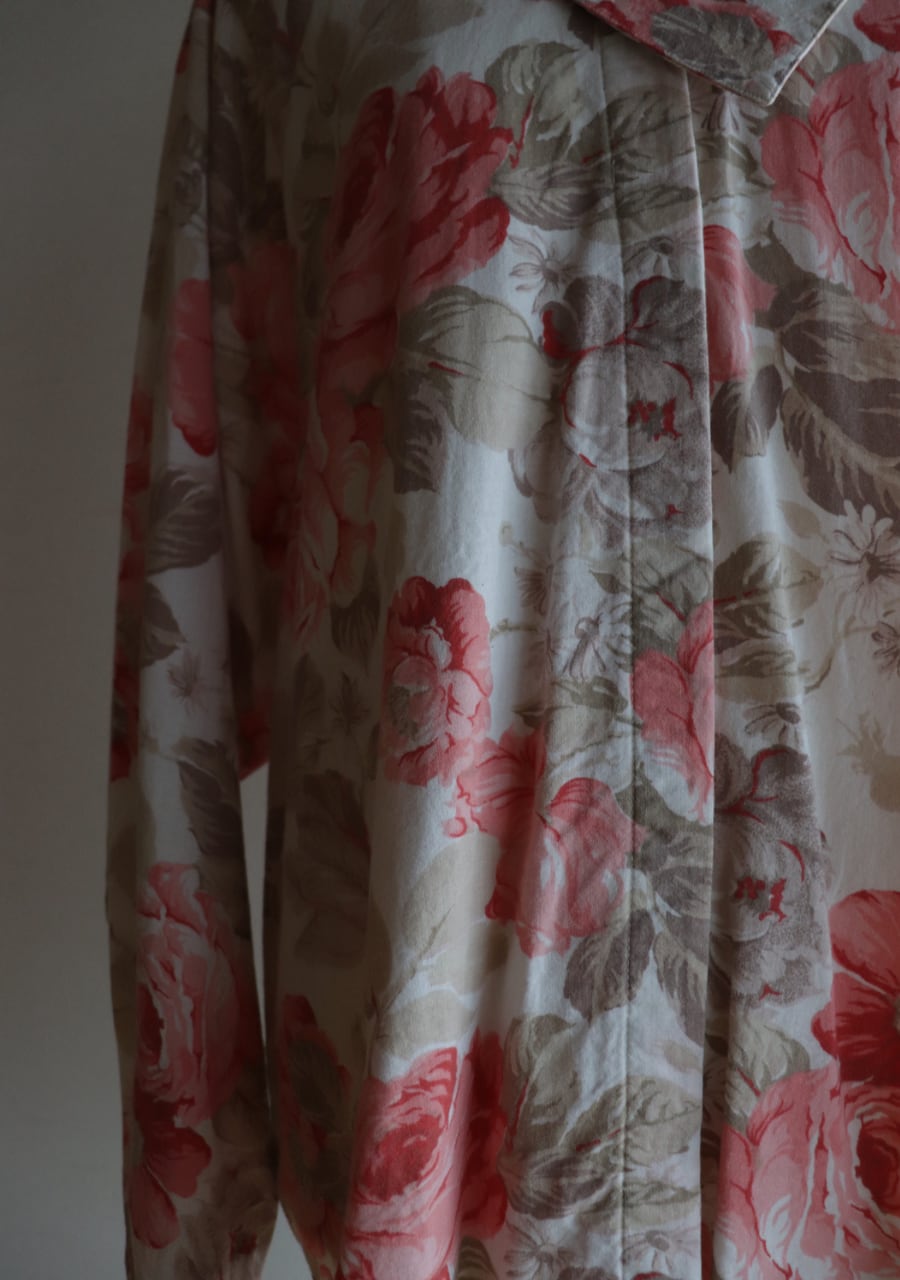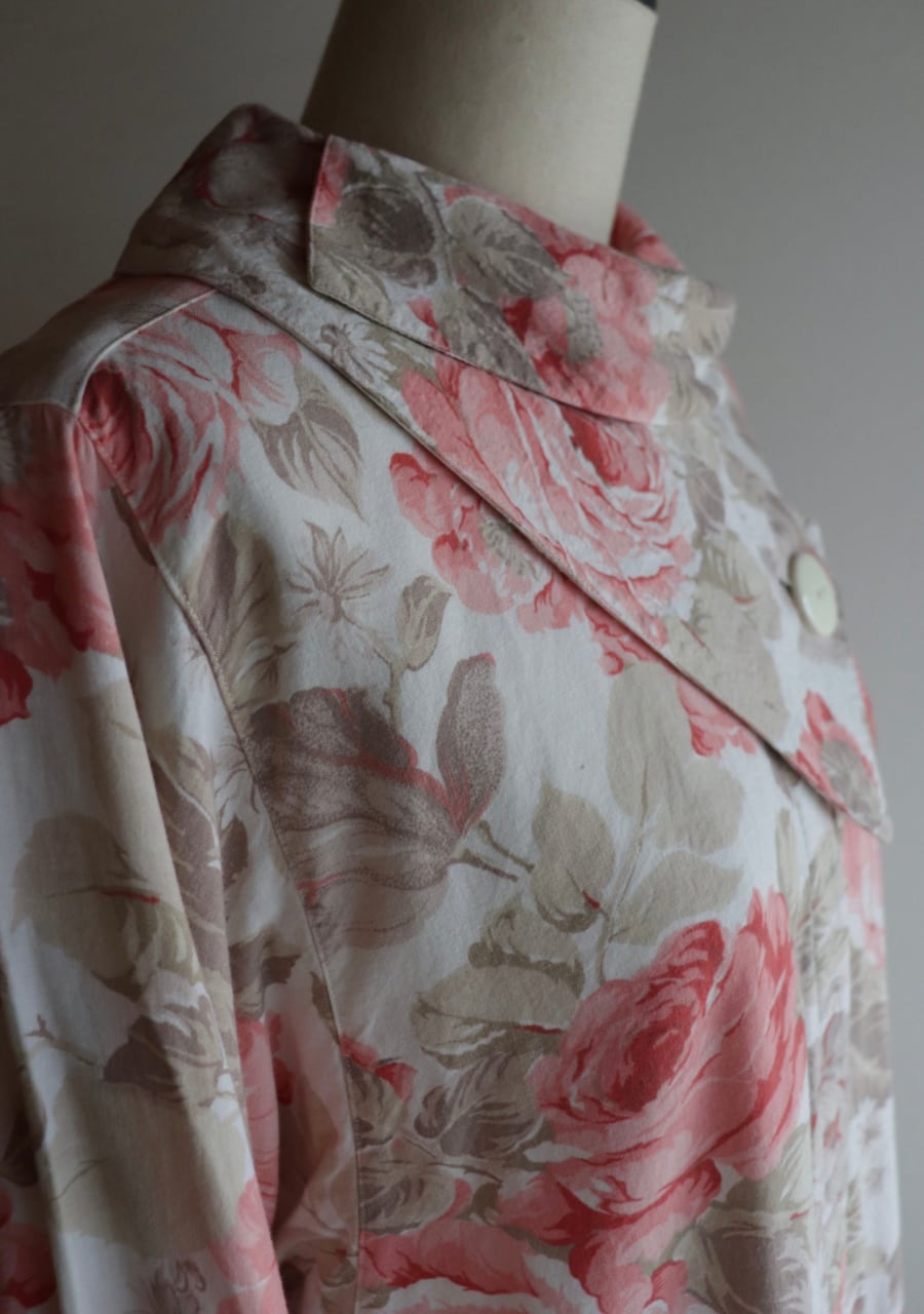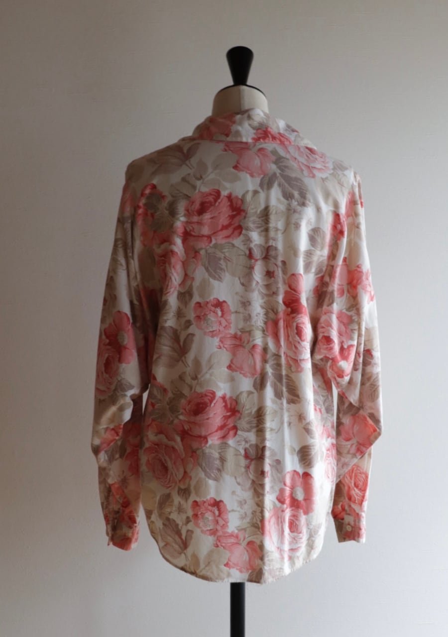 リボンを巻いたような襟元が特徴で全体的にナチュラルで明るい花柄が可愛いブラウス。透け感の無い薄手の生地で柔らかく肌触りの良い生地。身幅は程よくスッキリしているのに腕周りを大きくとり腕を動かしたときのシルエットがとても女性らしく可愛いデザイン。華やかな印象でインナーにとりいれてもアクセントに。一枚でももちろん素敵で春まで活躍してくれるアイテムです。こういうデザインに出会えるのもうれしいおすすめの一着。