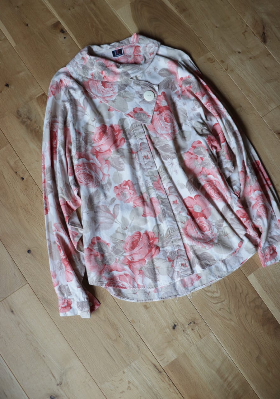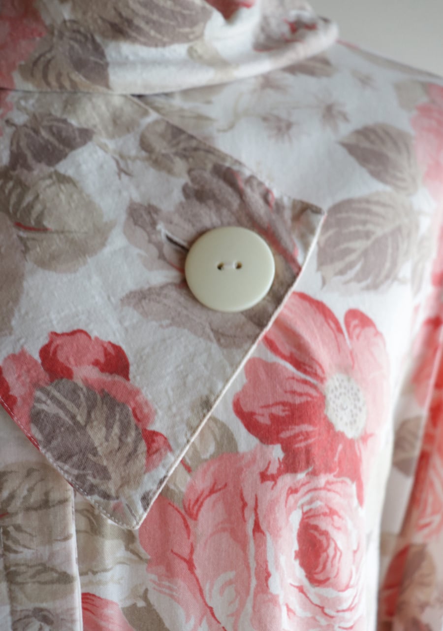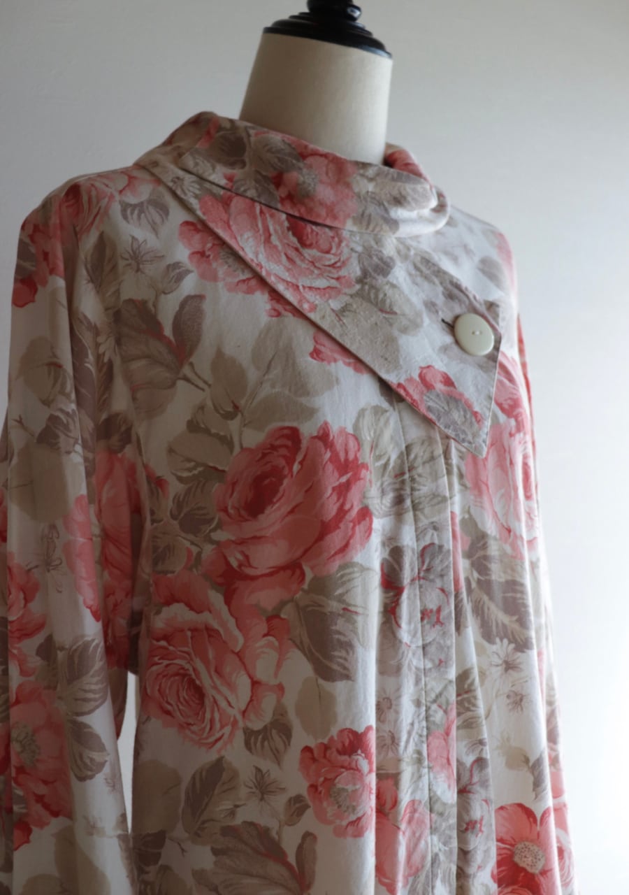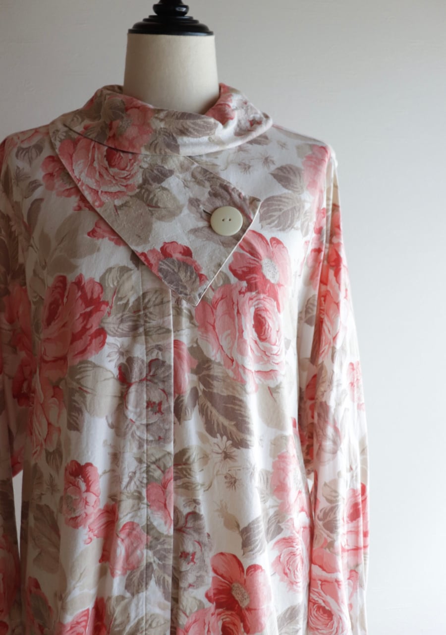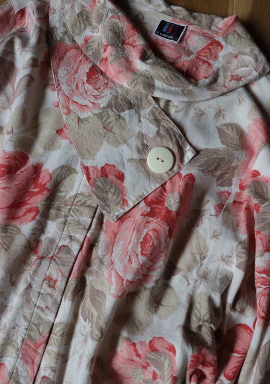 リボンを巻いたような襟元が特徴で全体的にナチュラルで明るい花柄が可愛いブラウス。透け感の無い薄手の生地で柔らかく肌触りの良い生地。身幅は程よくスッキリしているのに腕周りを大きくとり腕を動かしたときのシルエットがとても女性らしく可愛いデザイン。華やかな印象でインナーにとりいれてもアクセントに。一枚でももちろん素敵で春まで活躍してくれるアイテムです。こういうデザインに出会えるのもうれしいおすすめの一着。
